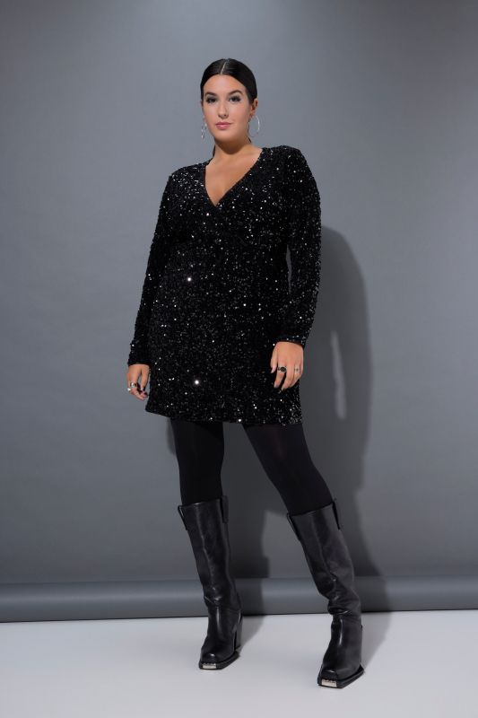 Sequined Wrap Look Long Sleeve V-Neck Dress