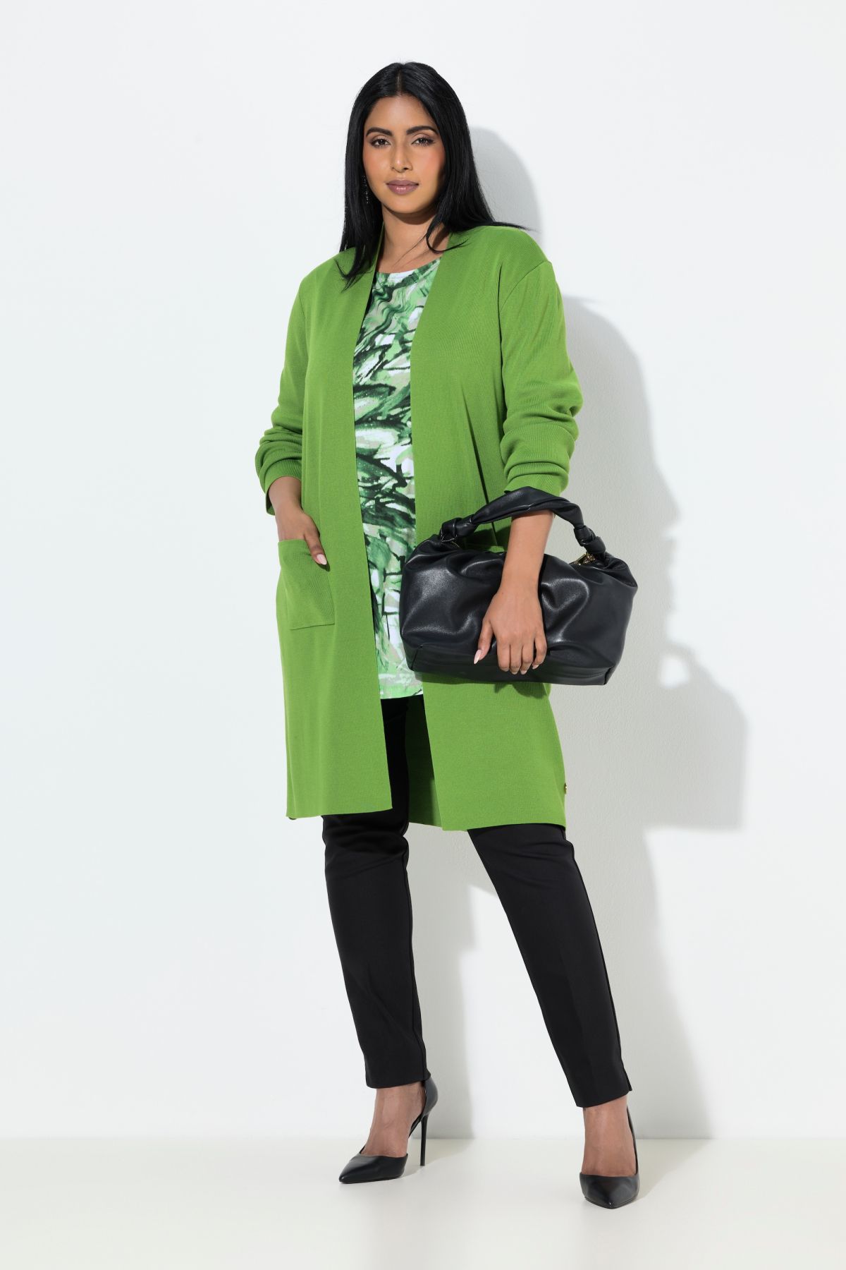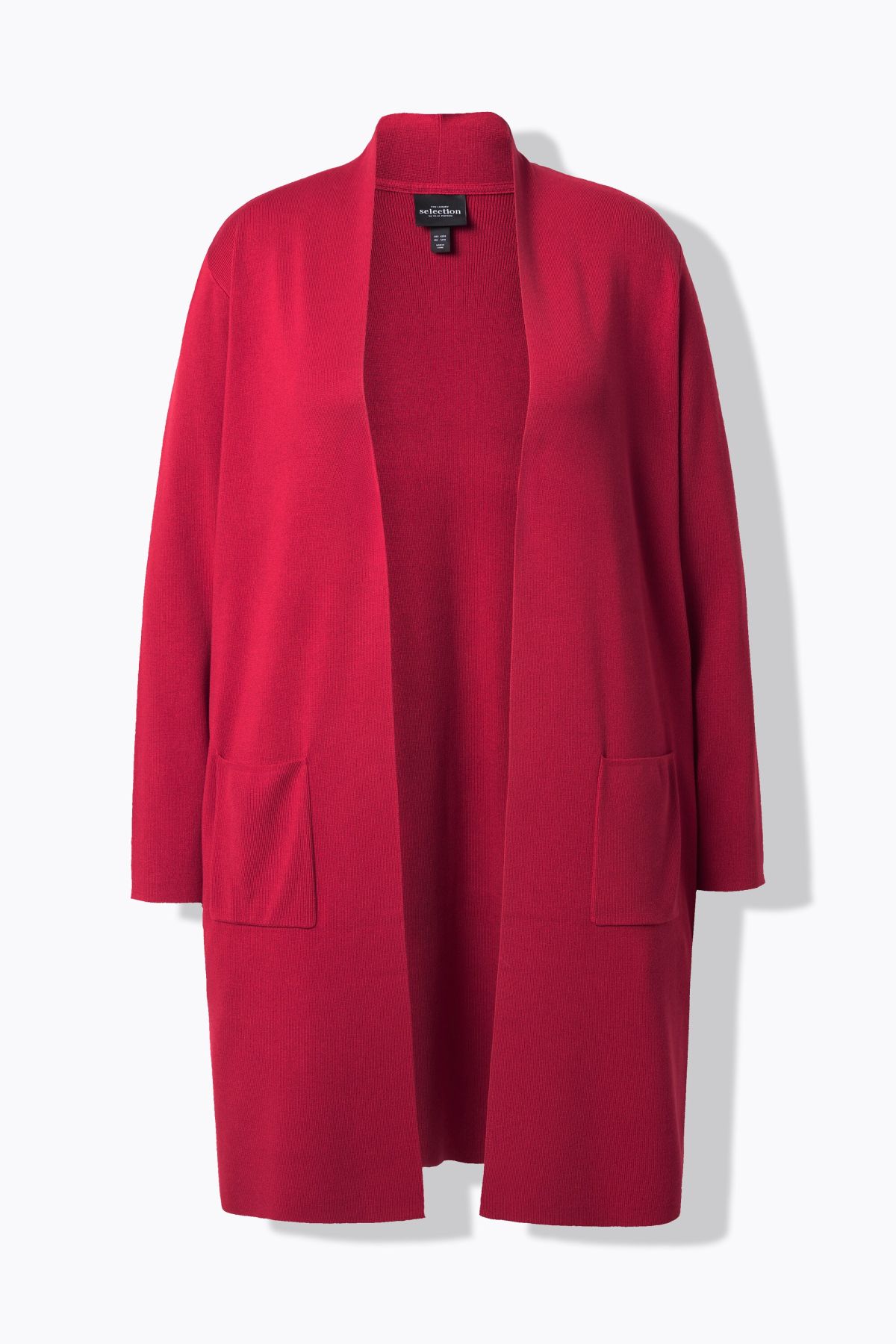 Long Pocket Cardigan Sweater - open front style made of soft flowing fine yarn with 2 pockets and long sleeves.