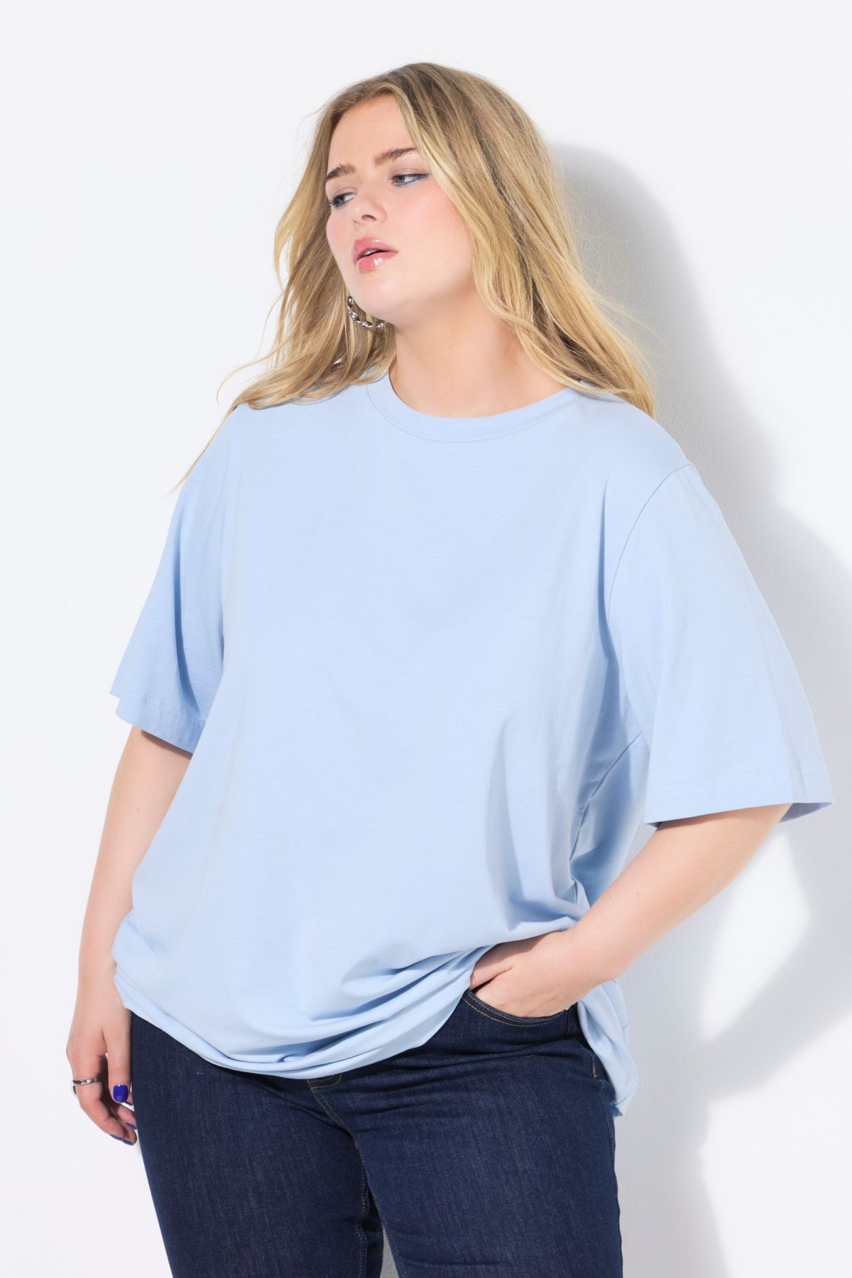 Round Neck Long Tee - wide and long cut with short sleeves.