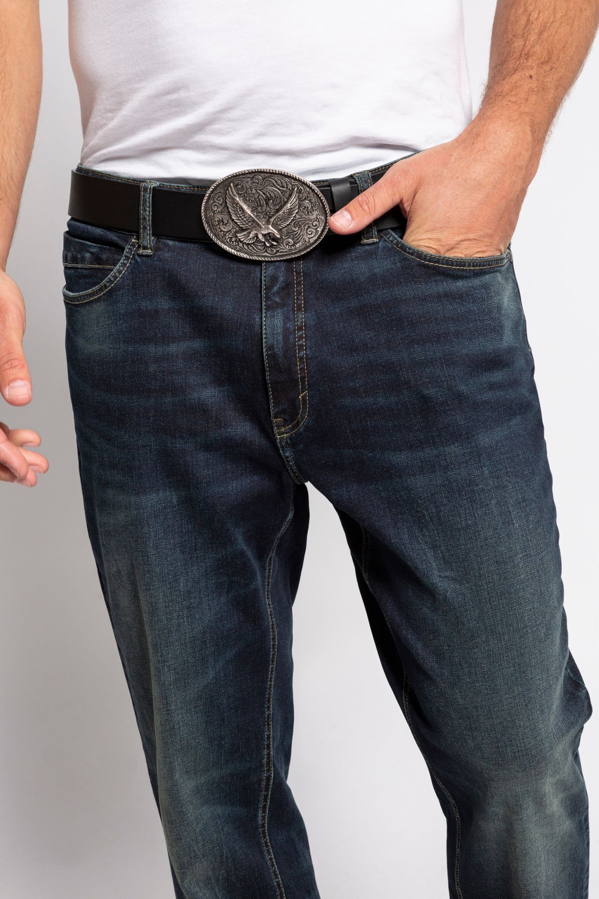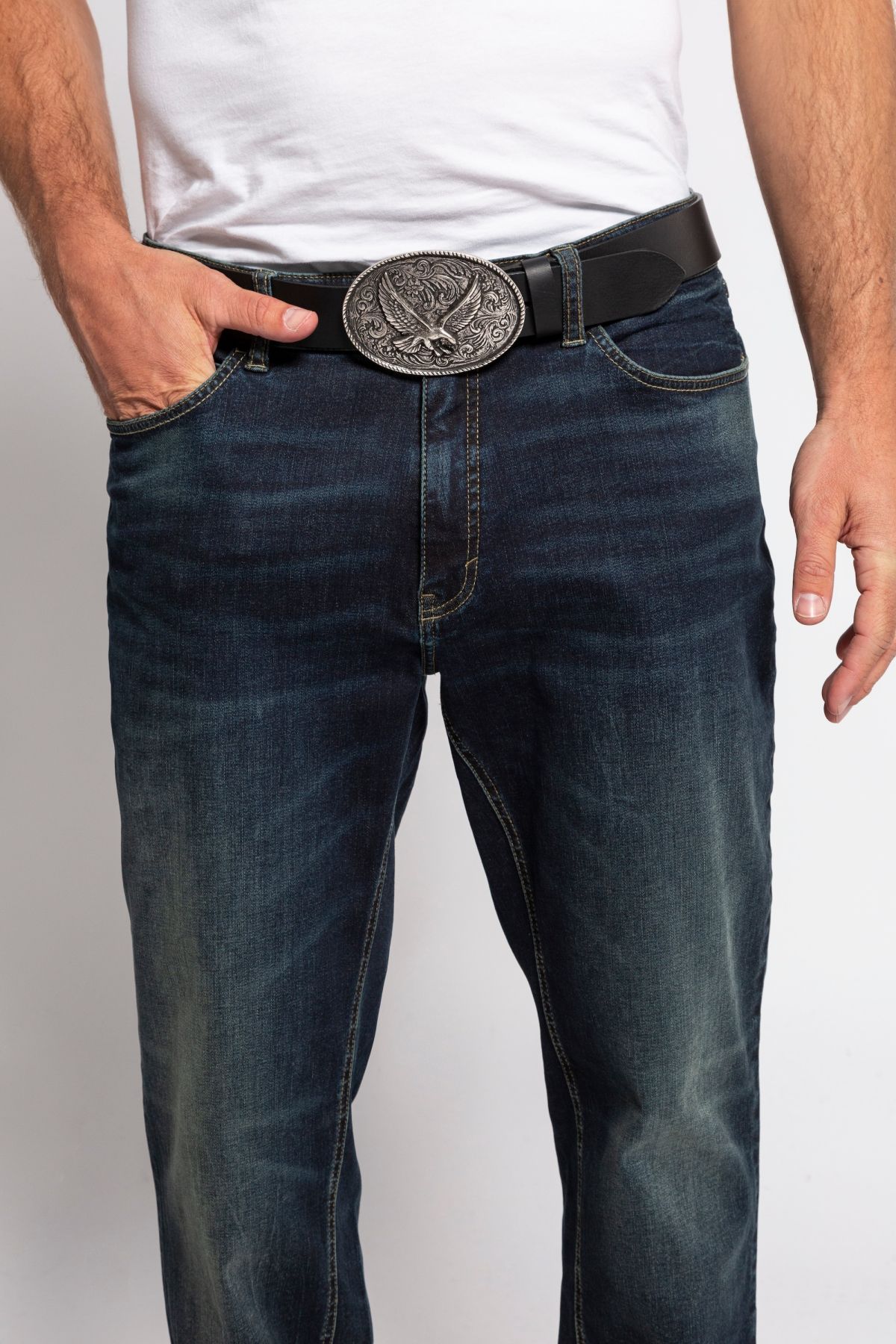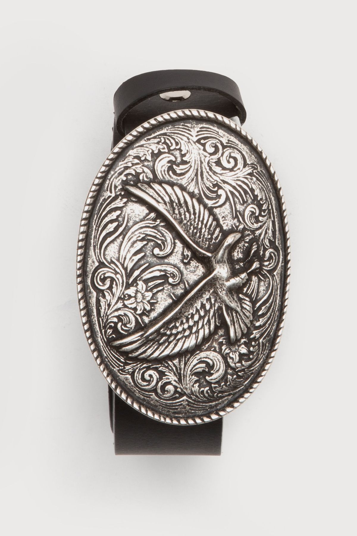 Belt made of robust real leather with an eagle-shaped buckle. Width approx. 1½ . Raw-edged, easy to shorten.