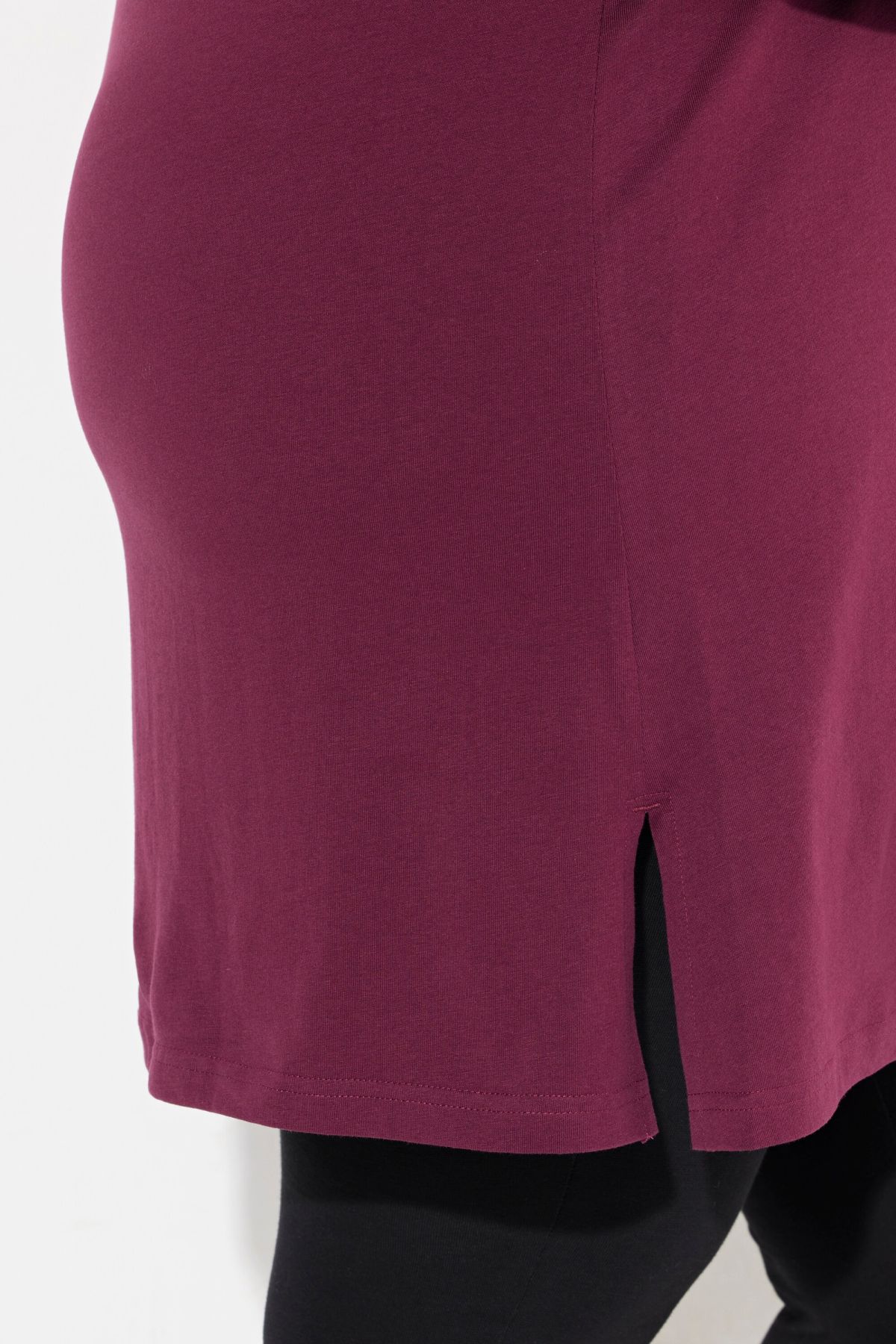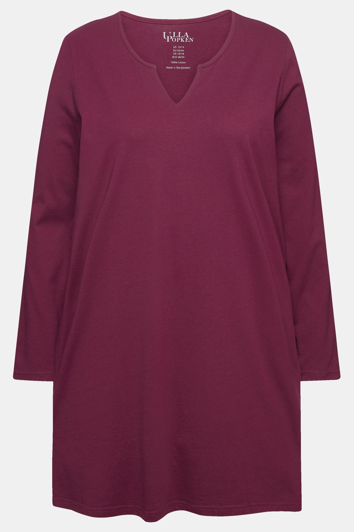 женствена туника с деколте, дълга А-линия с удобен широк подгъв, странични цепки за повече свобода на движение, дълги ръкави, чист памук, дължина около 86 см.