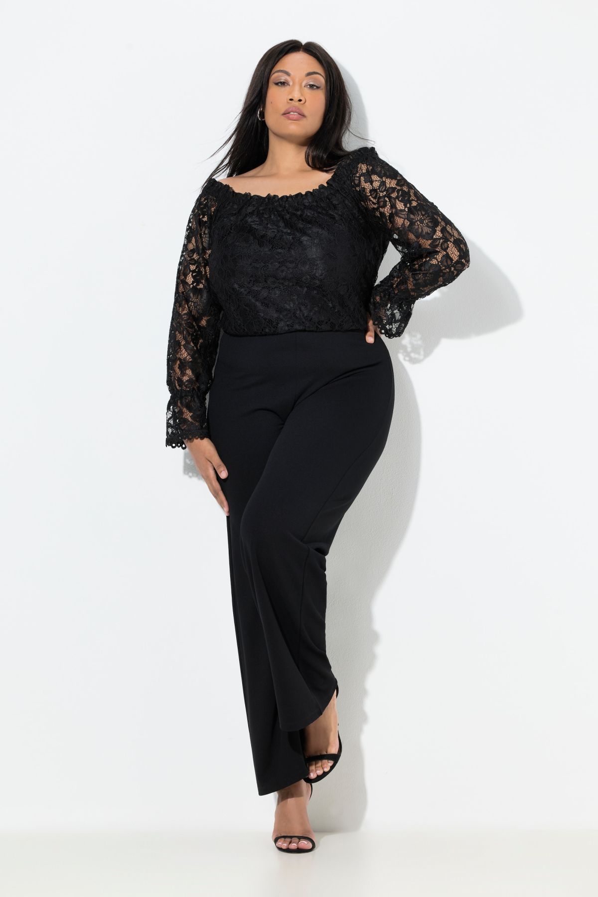 Дантелена рокля с дълъг ръкав и еластична волан, с открити рамене и еластично деколте Carmen, удобна кройка, широк, прав крачол, мек креп тип „скуба“, вътрешен шев приблизително 82 см.