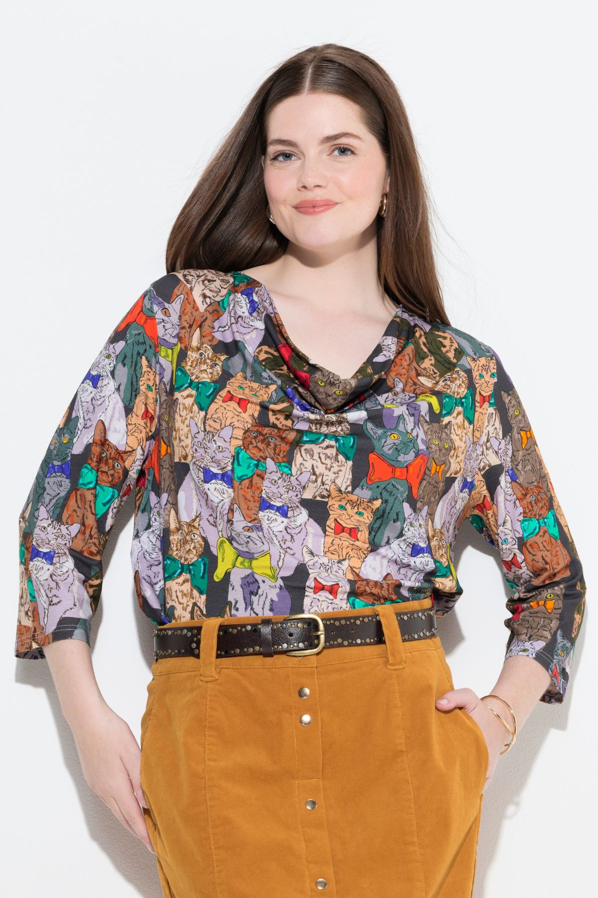 Dog Print Tee - An elegant waterfall collar adds a touch of elegance to this playful print.