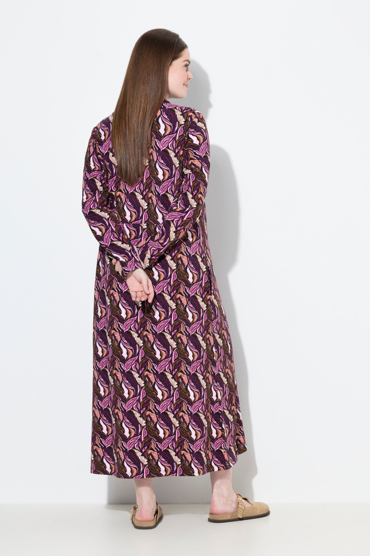 Eco Cotton Leaf Print Sweatshirt Dress - An elegant waterfall neckline elevates this straight silhouette.