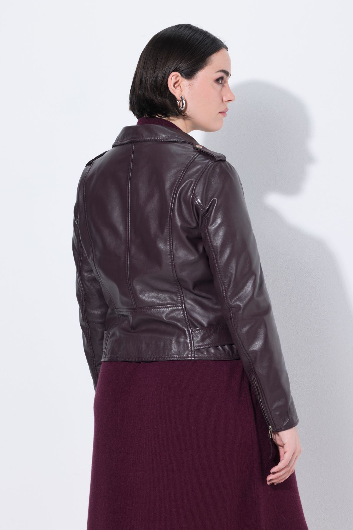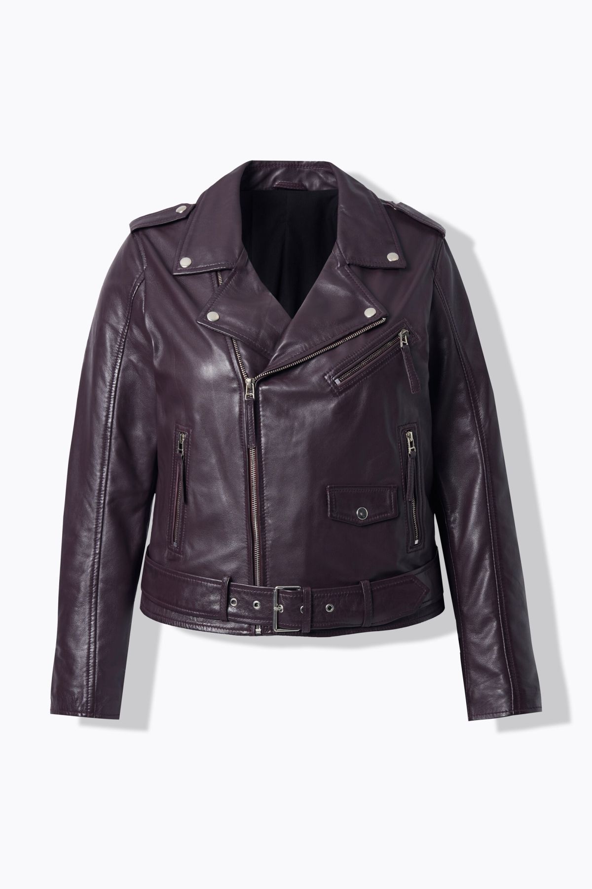 Biker Style Leather Jacket - this edgy jacket features studded lapels and an asymmetric zipper. Long sleeves, two zippered pockets, belt at hem.