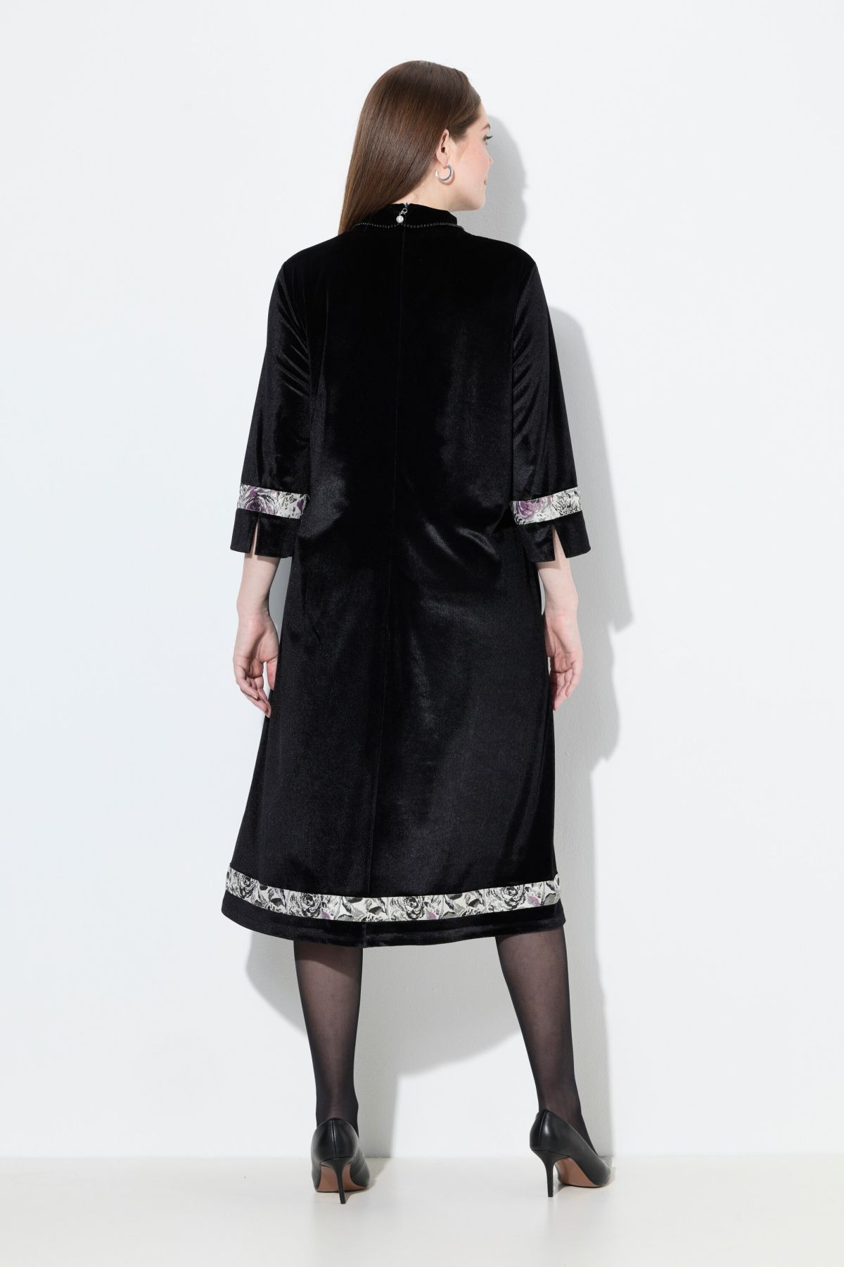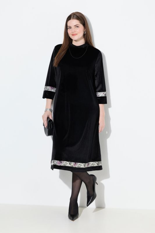 Приятно еластично кадифе с декоративни ивици, подвижна декоративна верижка отзад, стояща яка, удобна А-линия, 3/4 ръкави, дължина около 115 см.
