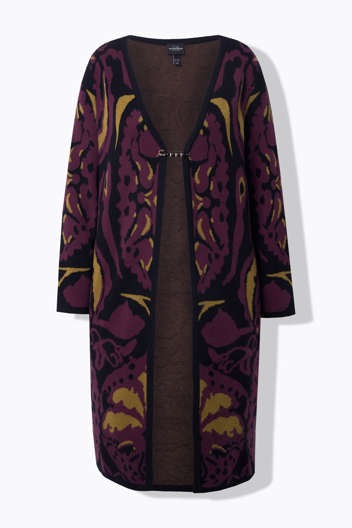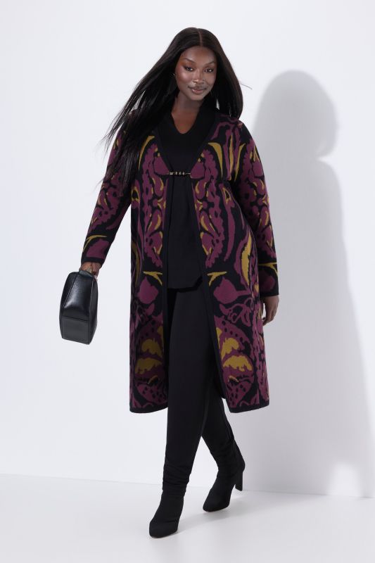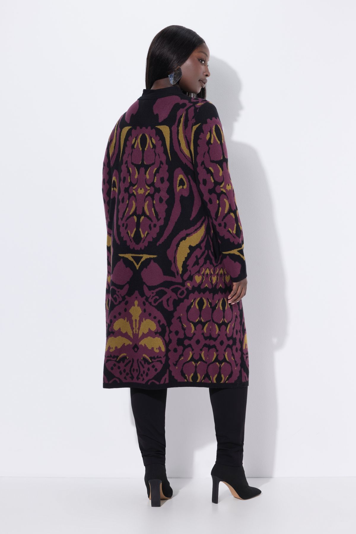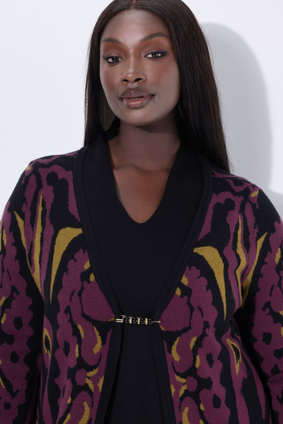 Opulent Knit Cardigan - An ornate pattern woven with rich plum and deep golden tones.