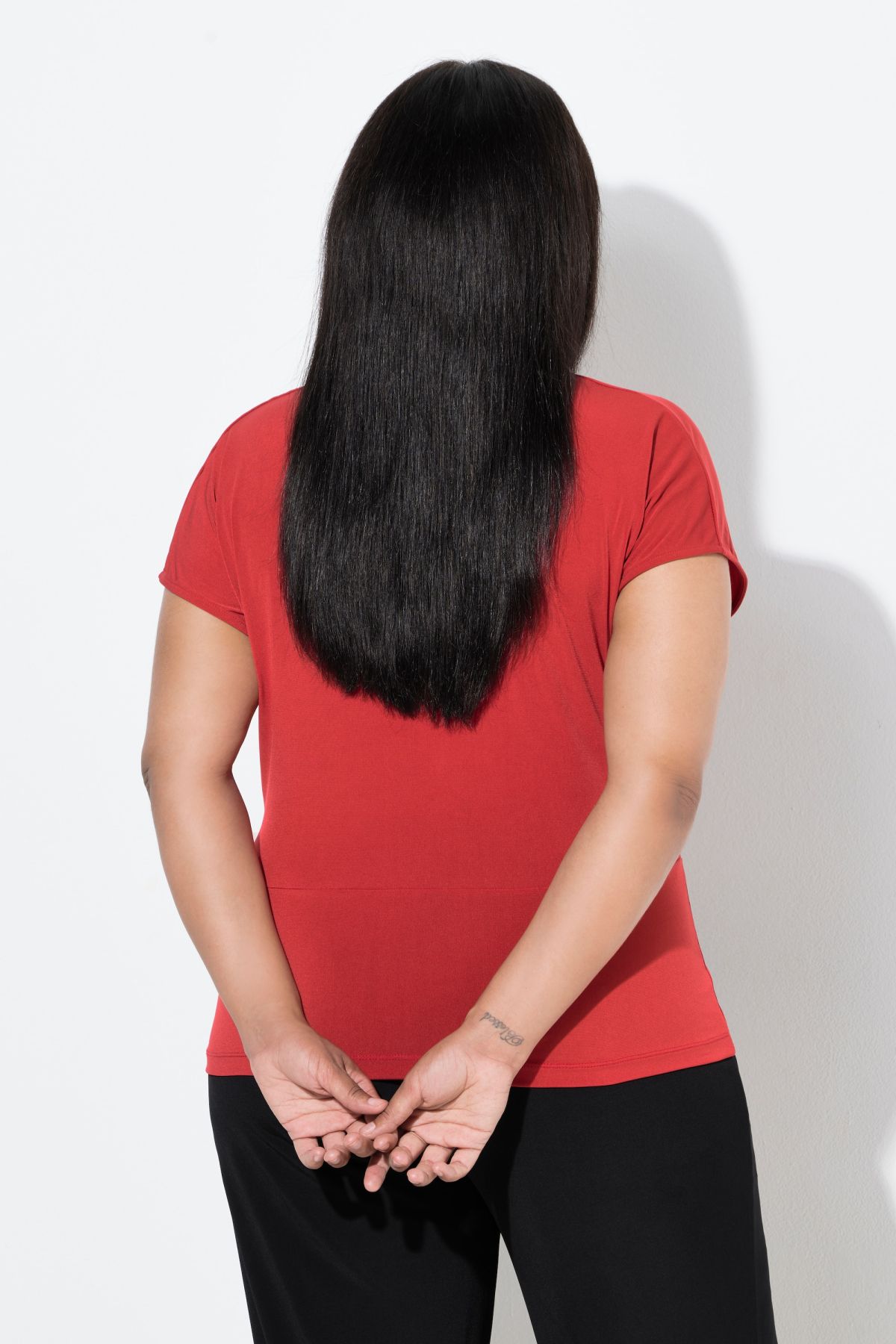 Женствено драпиране, дълбоко V-образно деколте, спуснати рамене, приятно разтегливо трико, дължина с регулиране на размера приблизително 58-66 см.