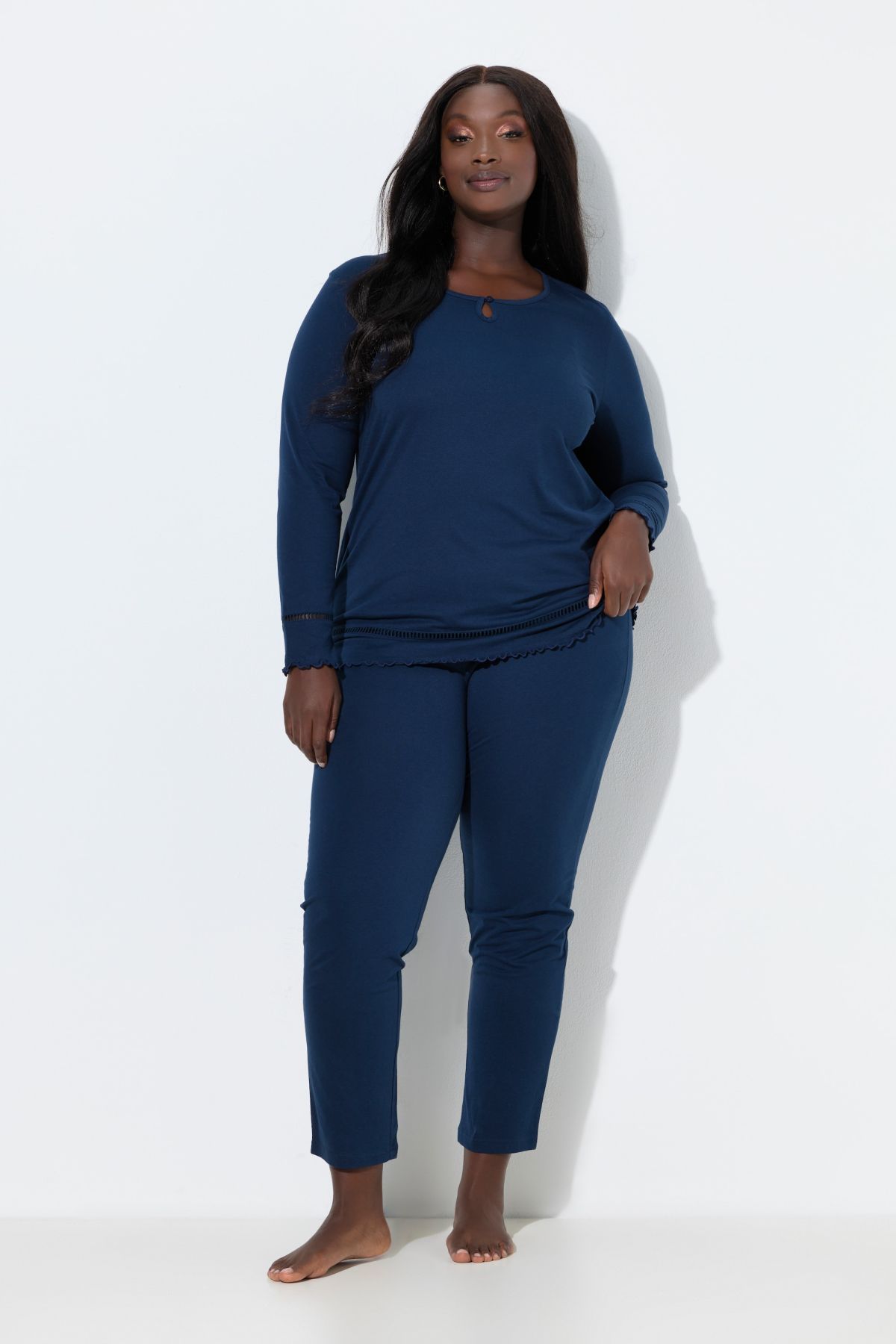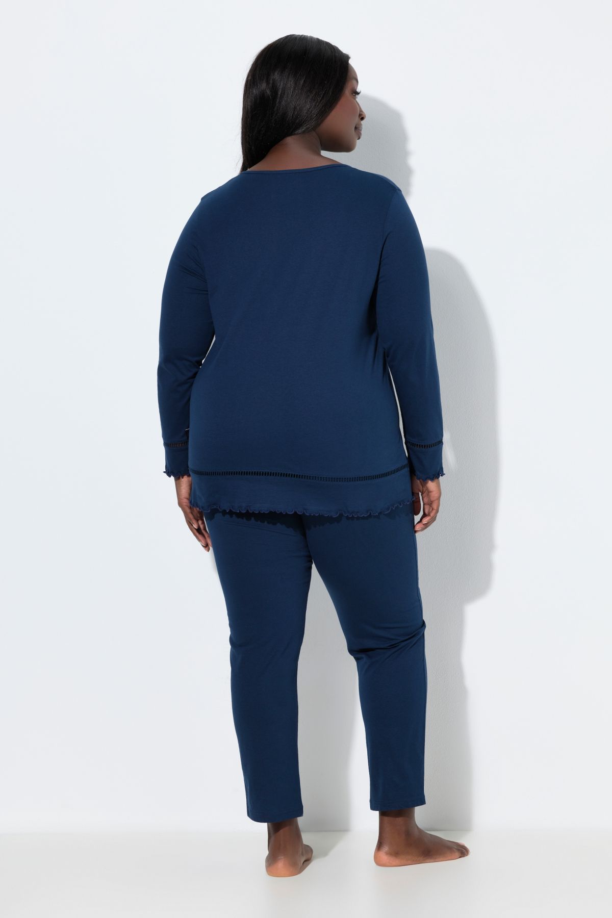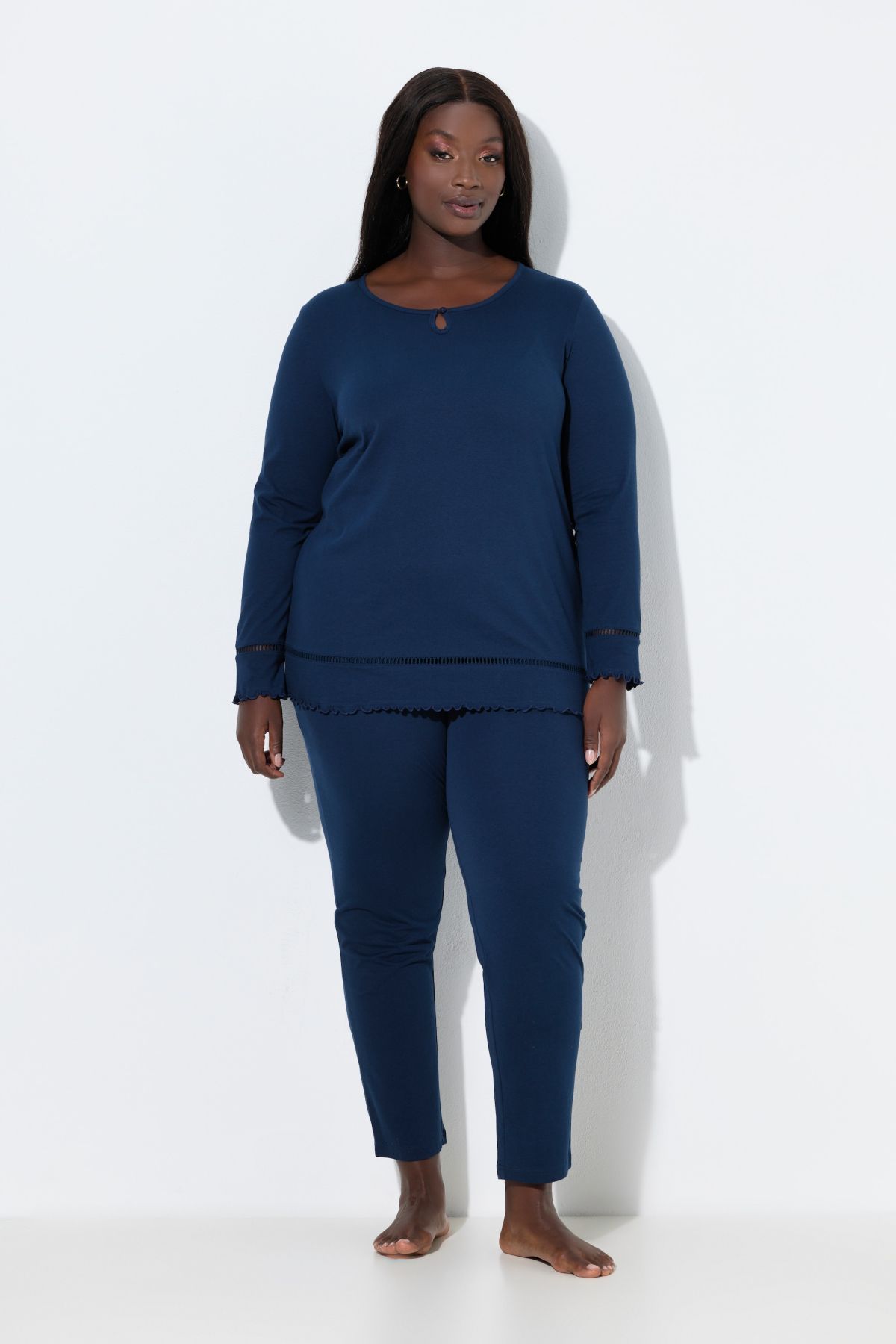 Ladder Lace Trim Lettuce Edge Pajama Set# the very definition of comfortable. Top with round neck, small keyhole with button-and-loop closure, and long sleeves and bottom hem with ladder lace trim and lettuce edges. Elastic waist bottoms with straight leg