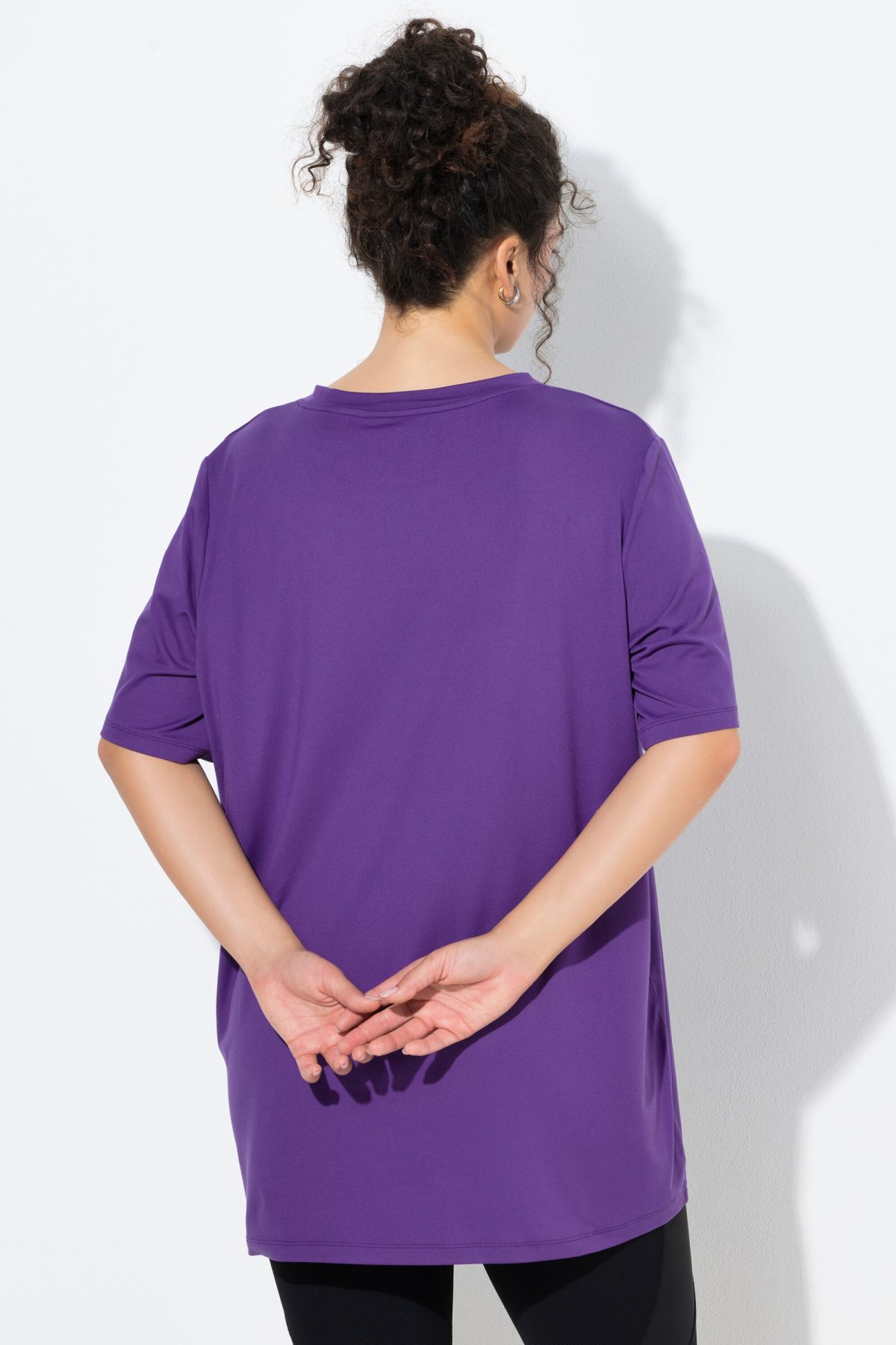 Страничен спортен принт, обло деколте, удобен, по-дълъг А-силует, дишащ и бързосъхнещ, по-добър за околната среда: с рециклиран полиестер, дължина, регулирана по размер, приблизително 74-78 см.