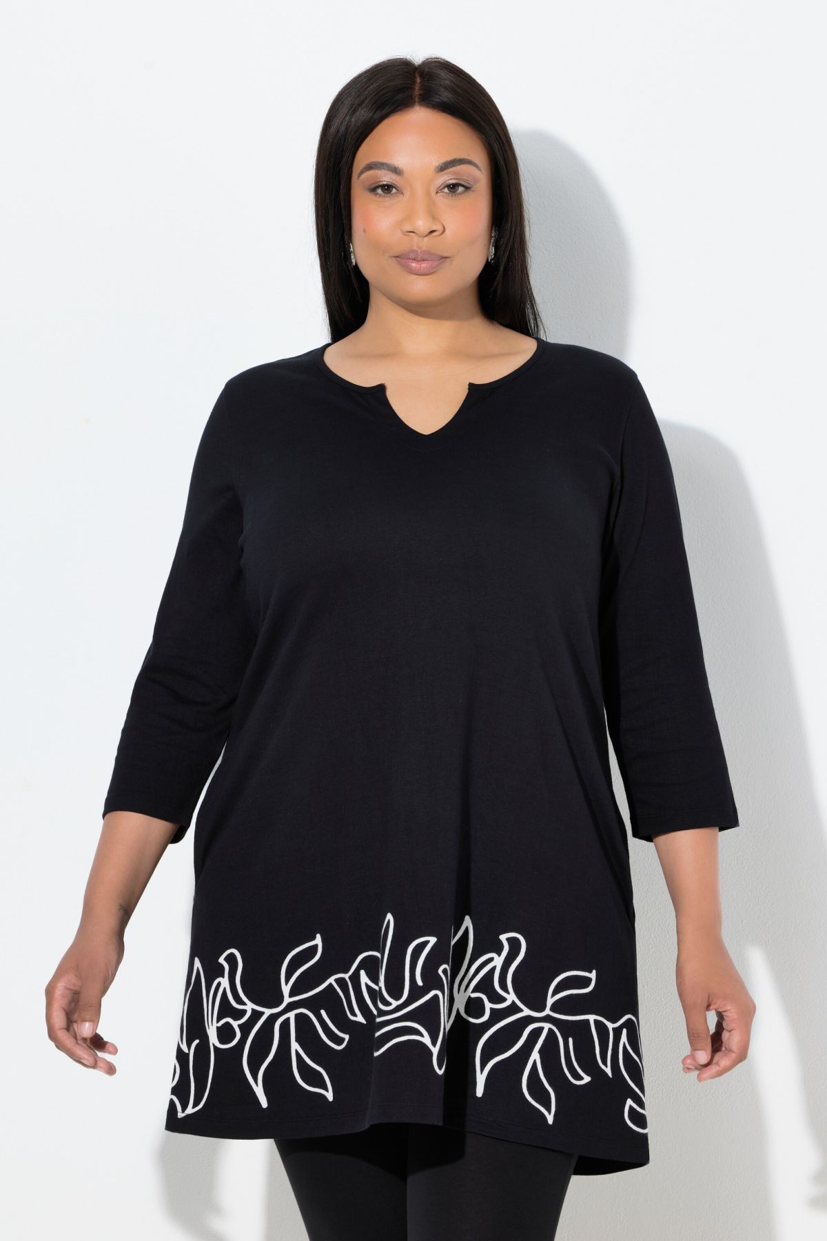 Декоративен мотив, женствено деколте тип туника, удължен А-силует с удобна ширина на подгъва, 3/4 ръкави, чист памук, дължина, регулирана по размер, приблизително 86 см.