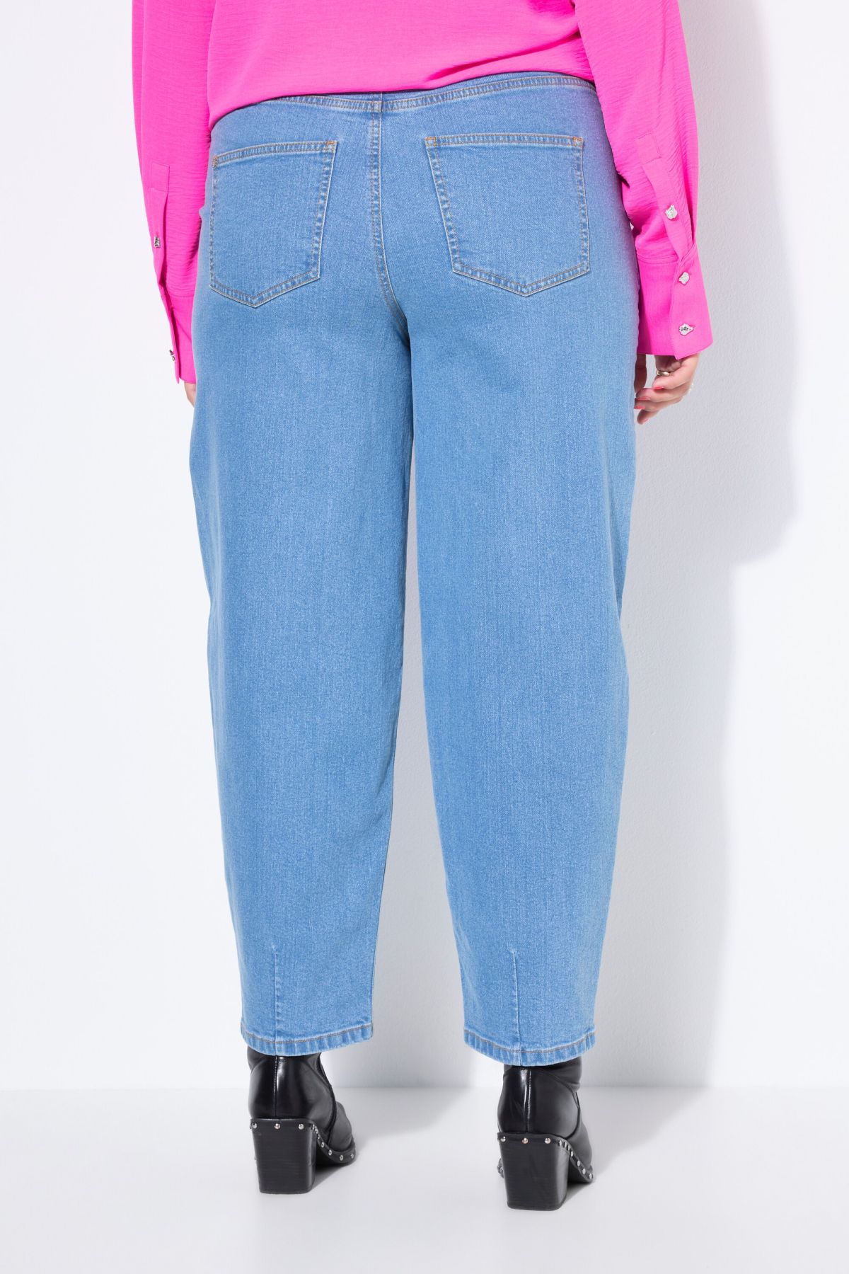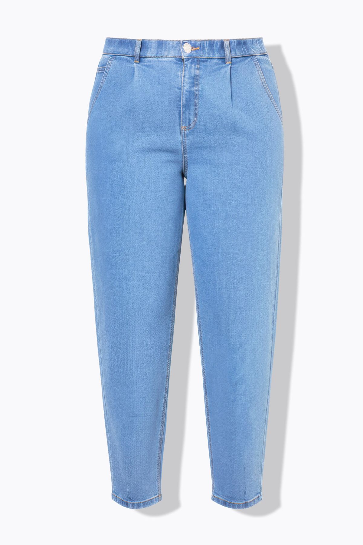 Balloon jeans, wide shape, high waist. Soft, light stretch denim. Wide 5-pocket style, elastic waistband with belt loops, button and zipper.