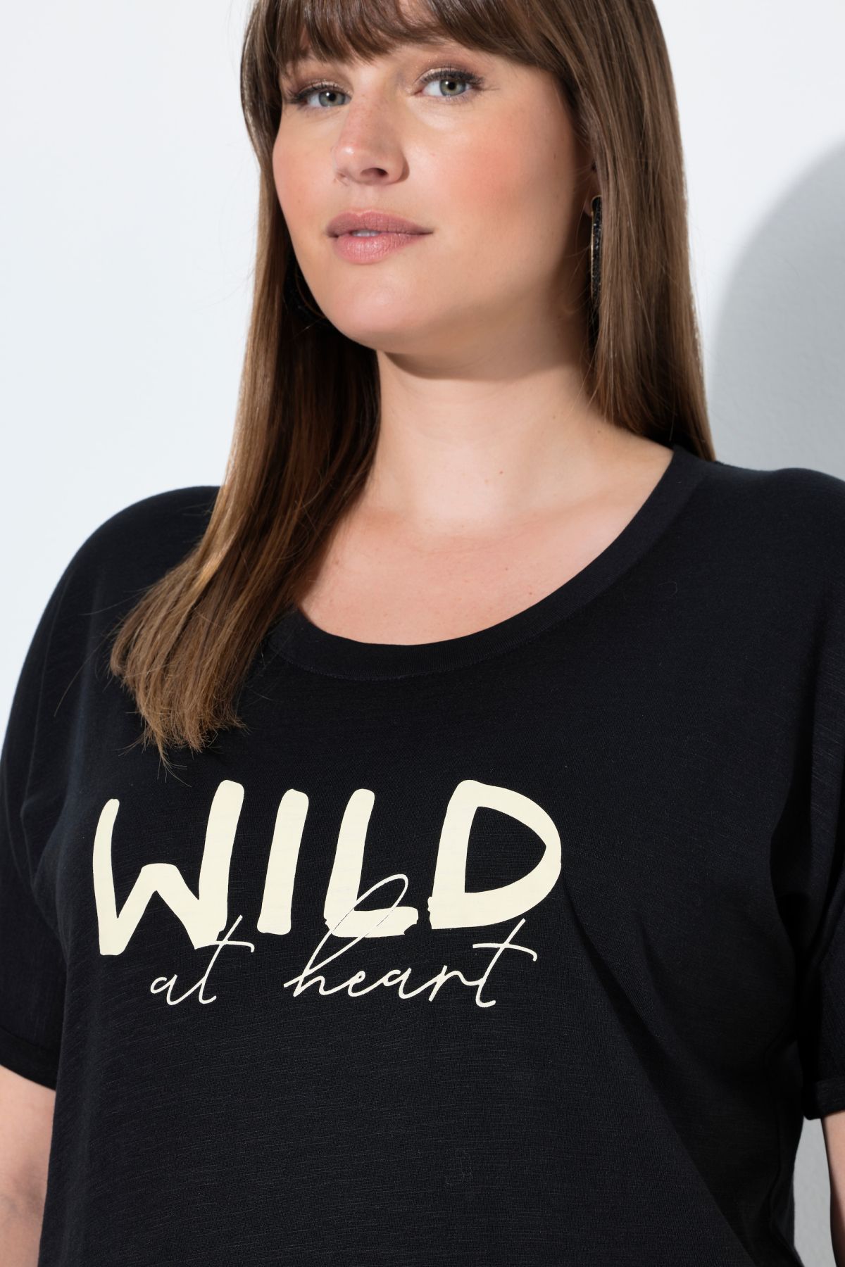 Отпред с голям надпис "Wild at heart", кръгло деколте, небрежно голям размер и по-дълга задна част, къси ръкави с фиксирано закопчаване, екстра мека смес от модал и памук, дължина приблизително 72-82 см.