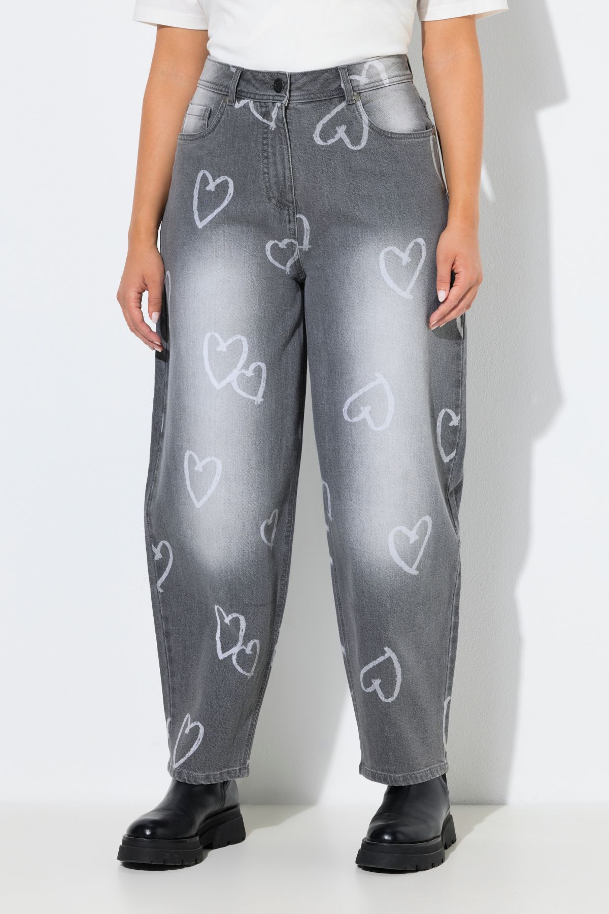 Heart Print Stretch Fit Mom Jeans A modern barrel leg silhouette covered with hearts.