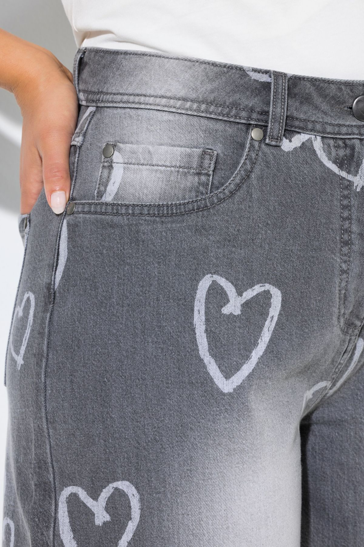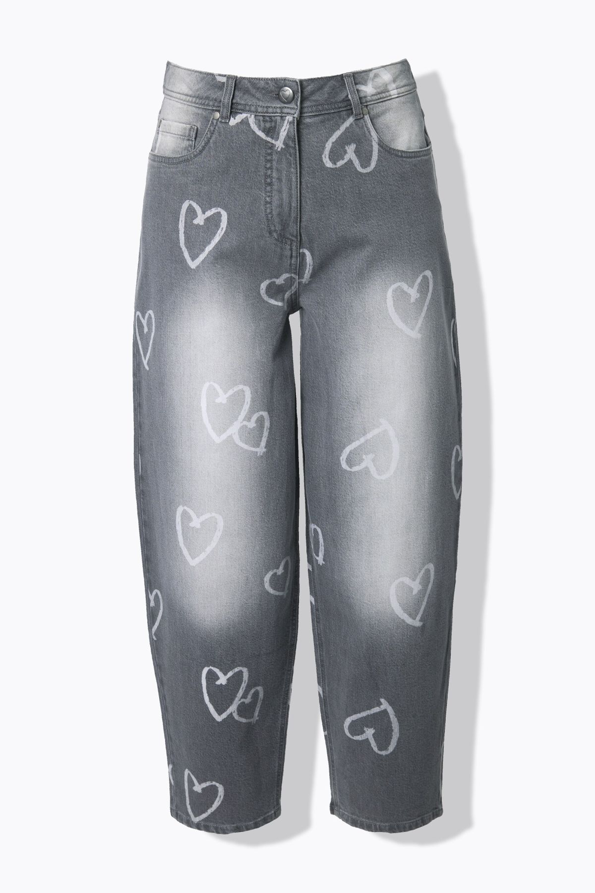 Heart Print Stretch Fit Mom Jeans A modern barrel leg silhouette covered with hearts.