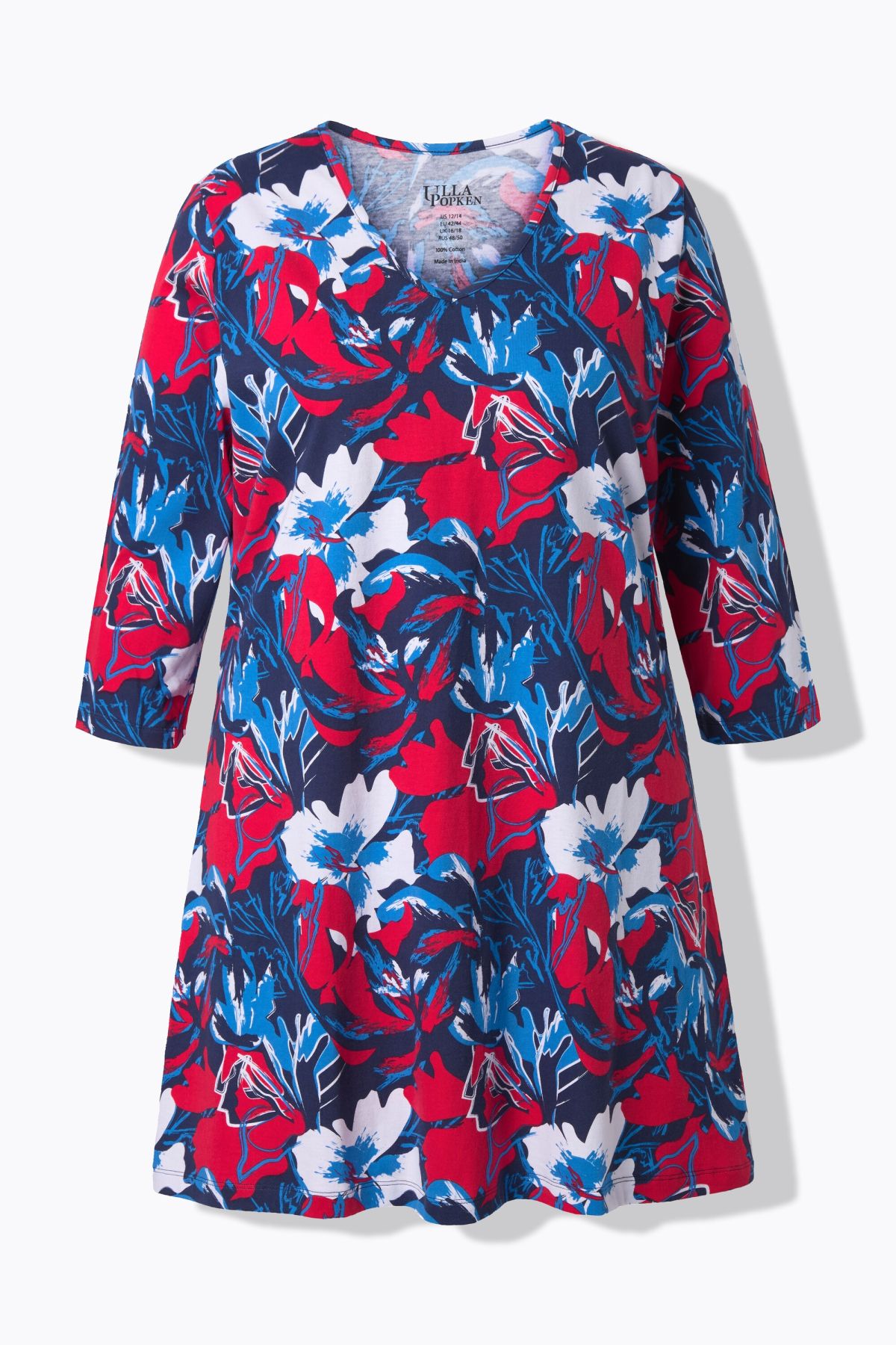 Dynamic Floral A-Line Knit Tunic A versatile silhouette bursting with color.