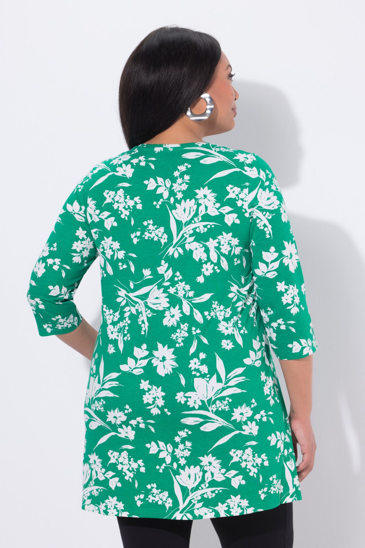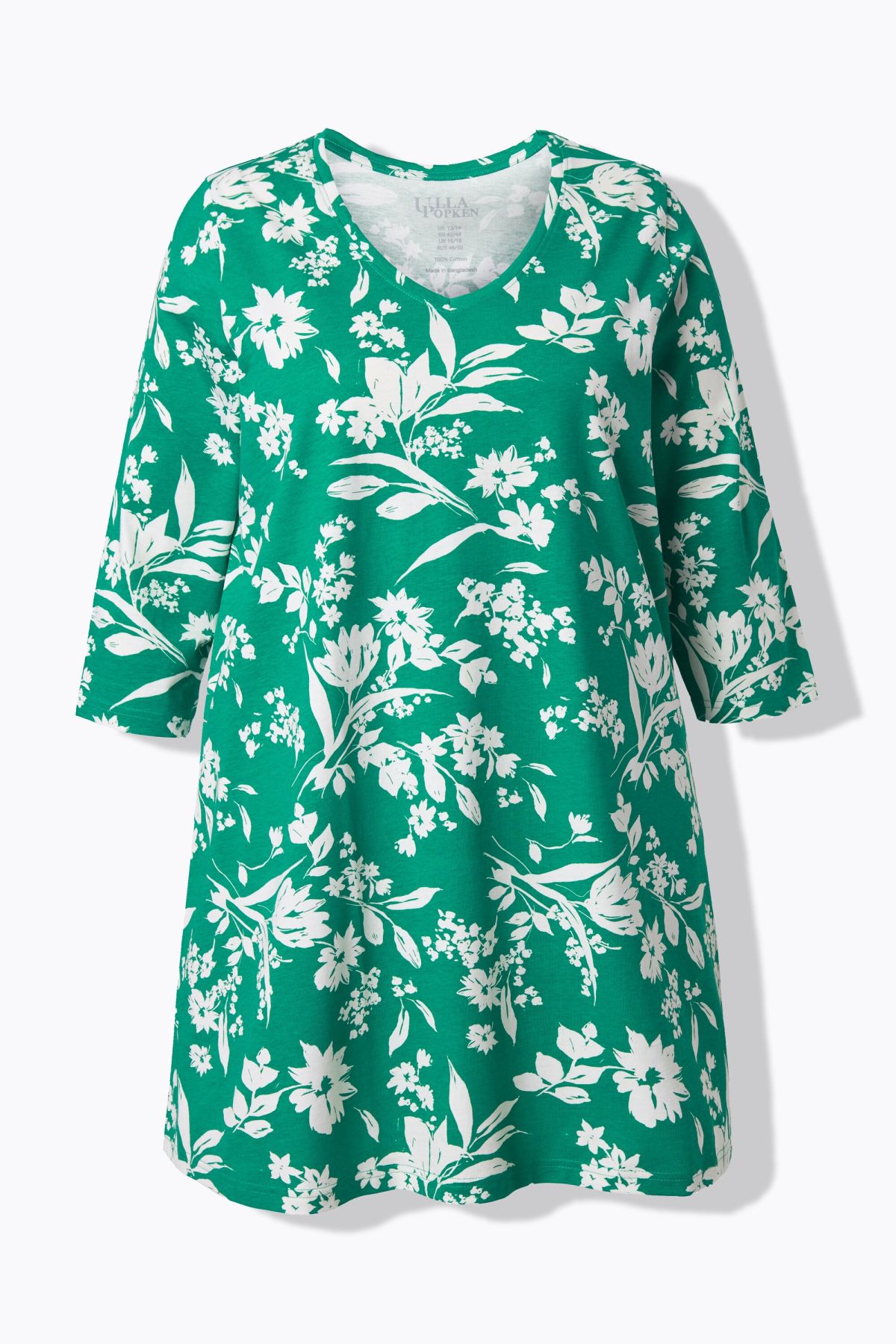 Атрактивен флорален мотив, V-образно деколте, по-дълъг А-силует с удобно широк подгъв, 3/4 ръкави, чист памук, дължина приблизително 86 см.