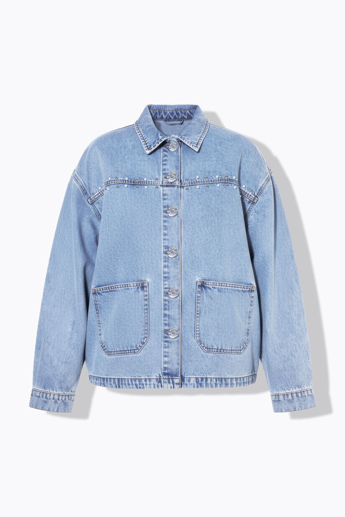 Denim jacket, oversized, decorative beads, rhinestones