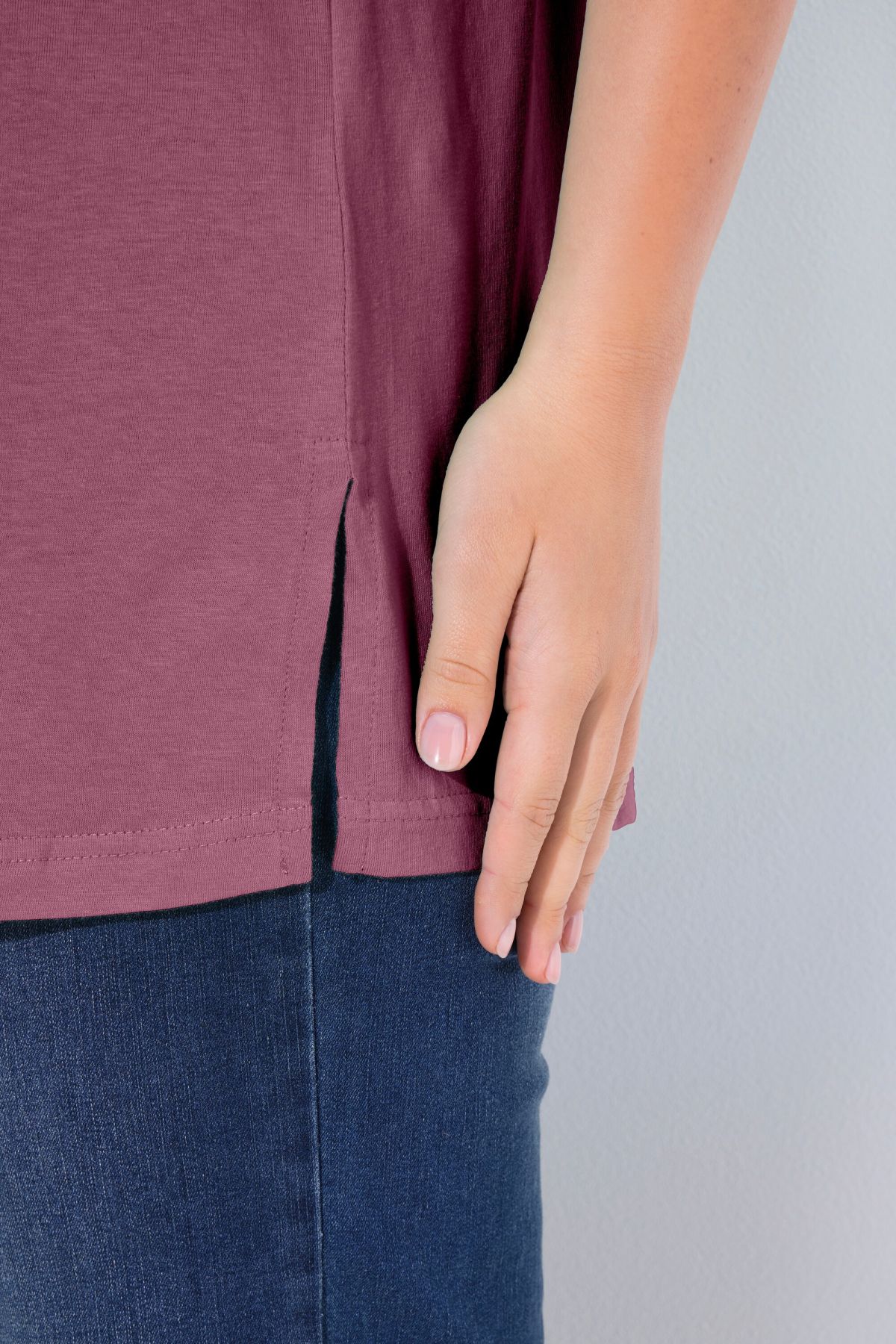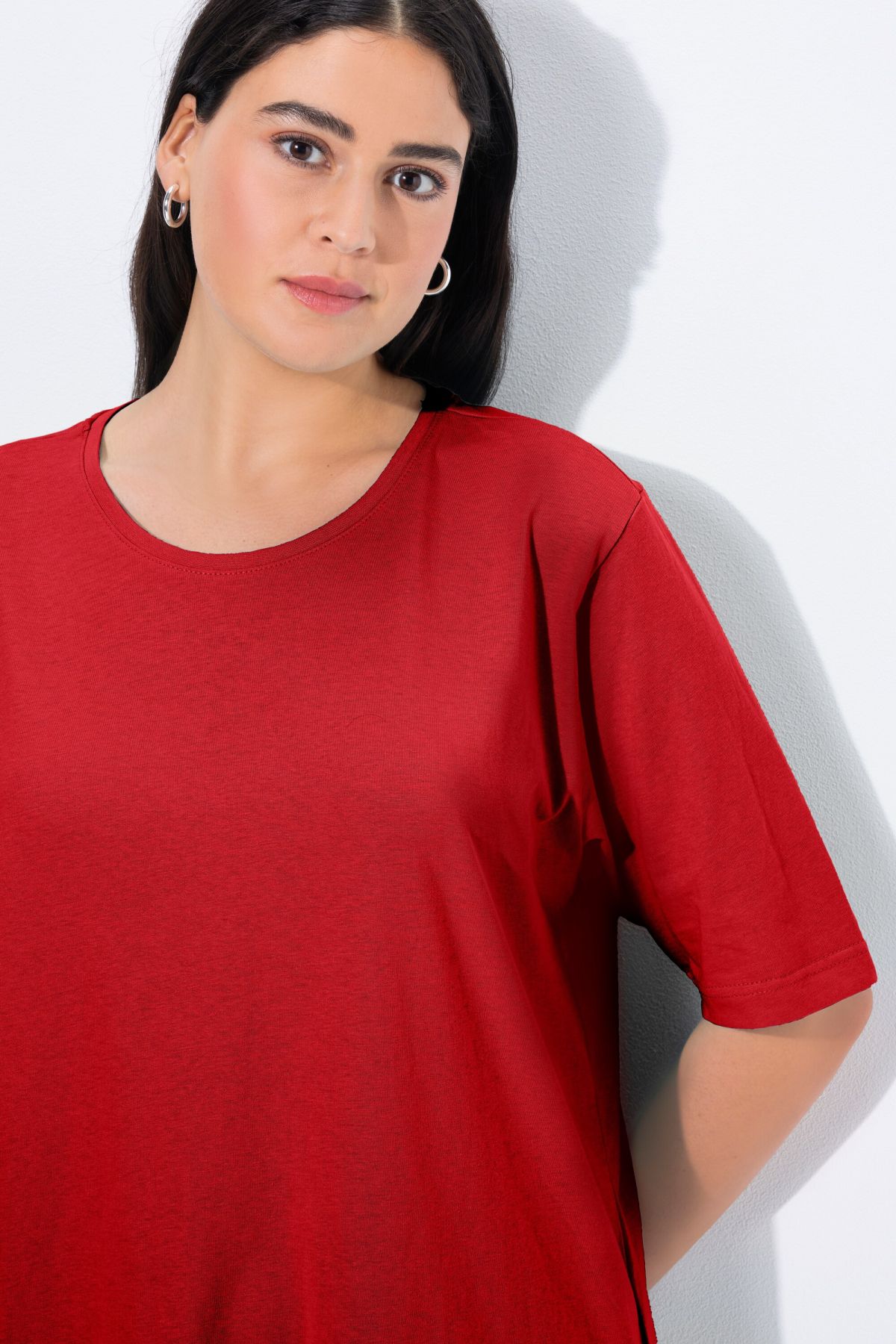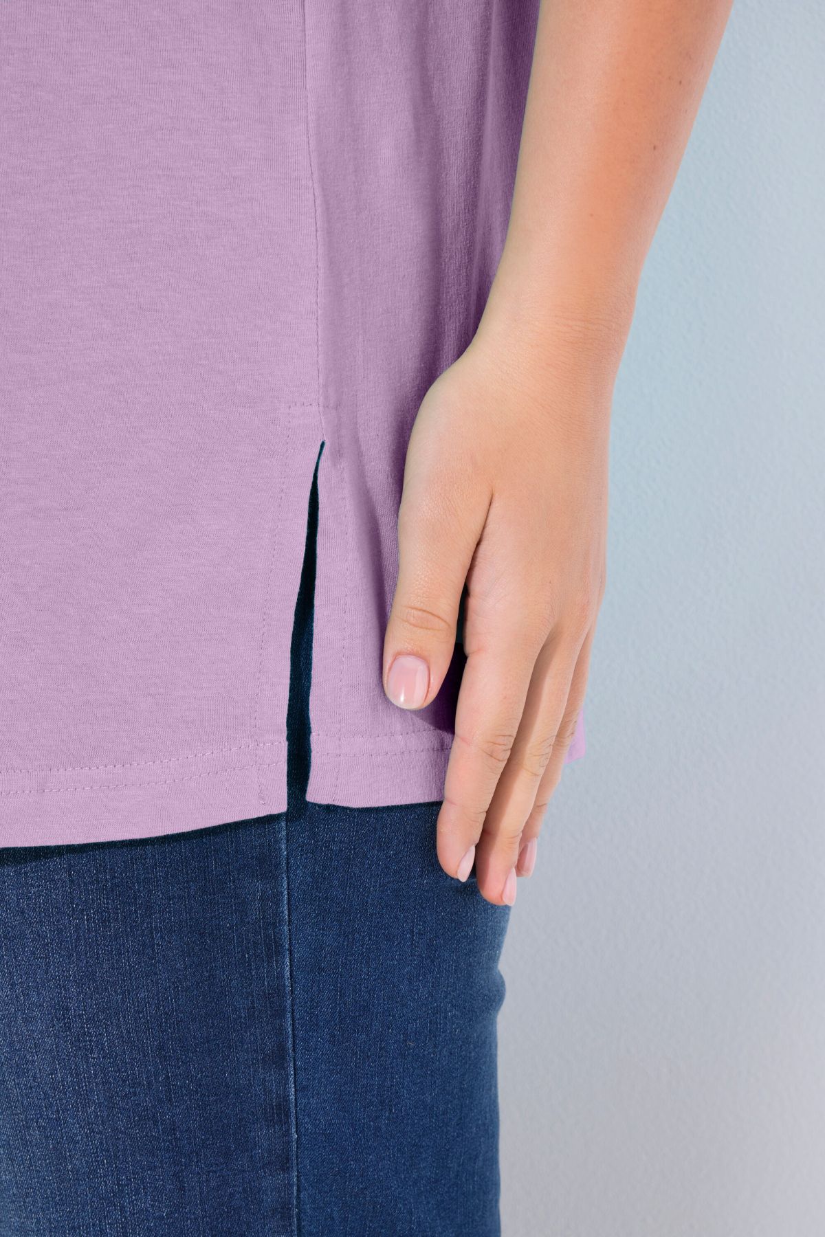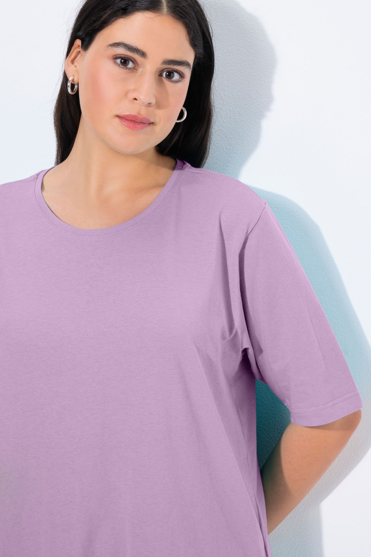 Обикновена тениска. Ежедневна кройка в голям размер от мек памук. Заоблено деколте, къси ръкави и странични процепи.