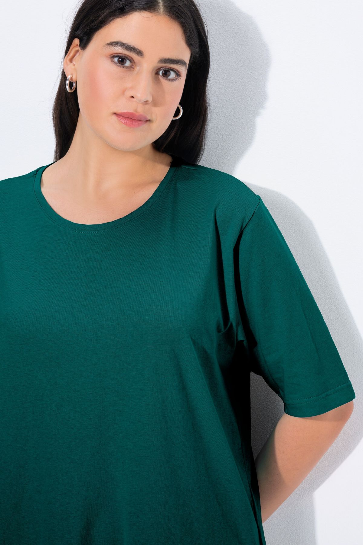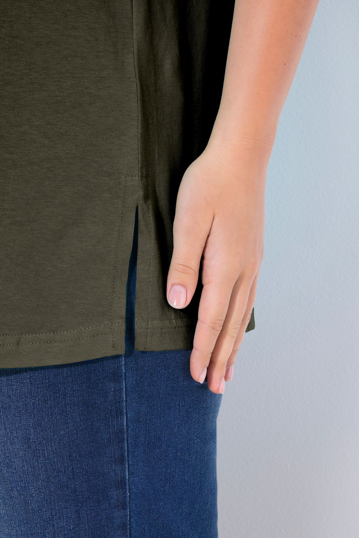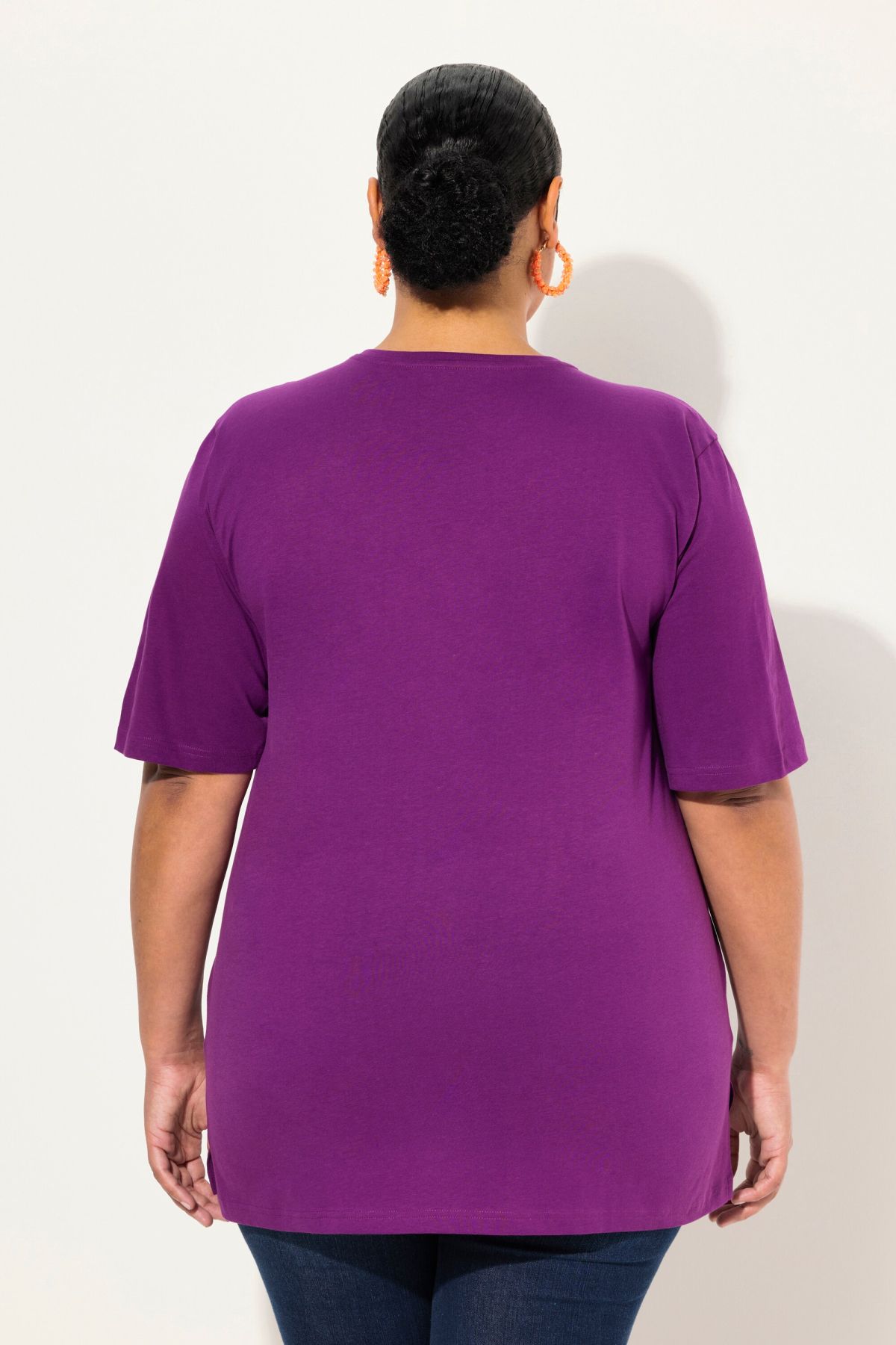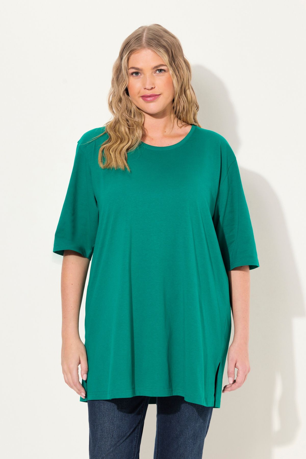 Обикновена тениска. Ежедневна кройка в голям размер от мек памук. Заоблено деколте, къси ръкави и странични процепи.