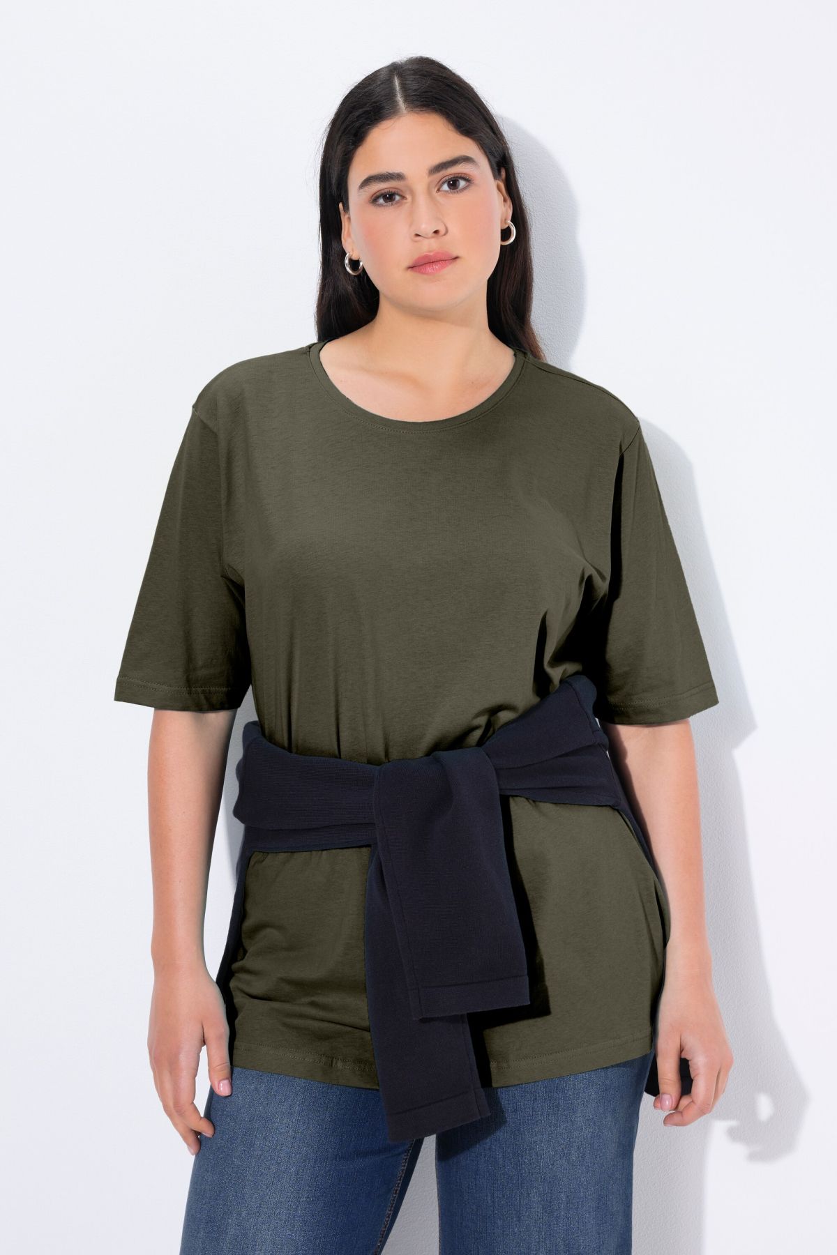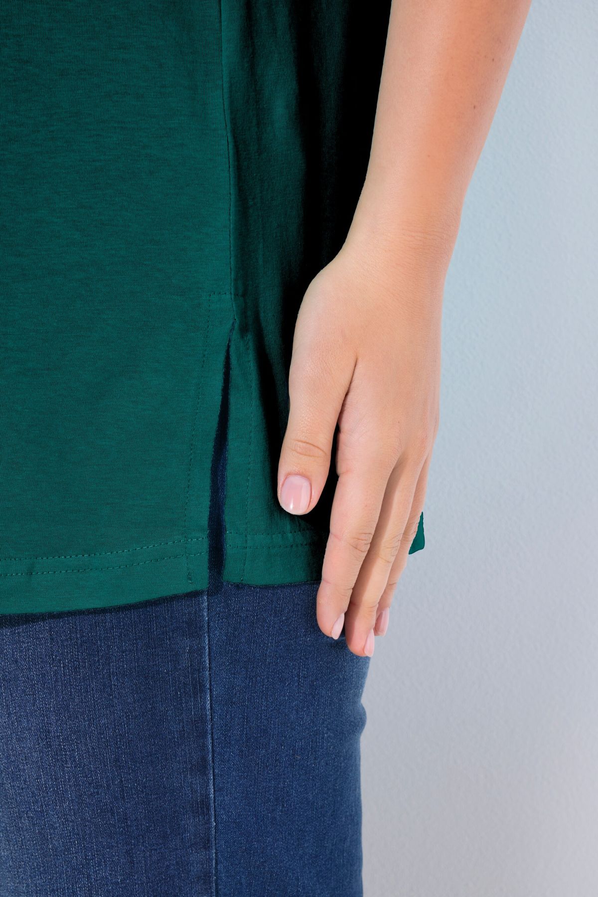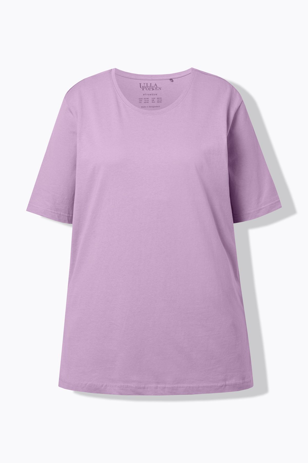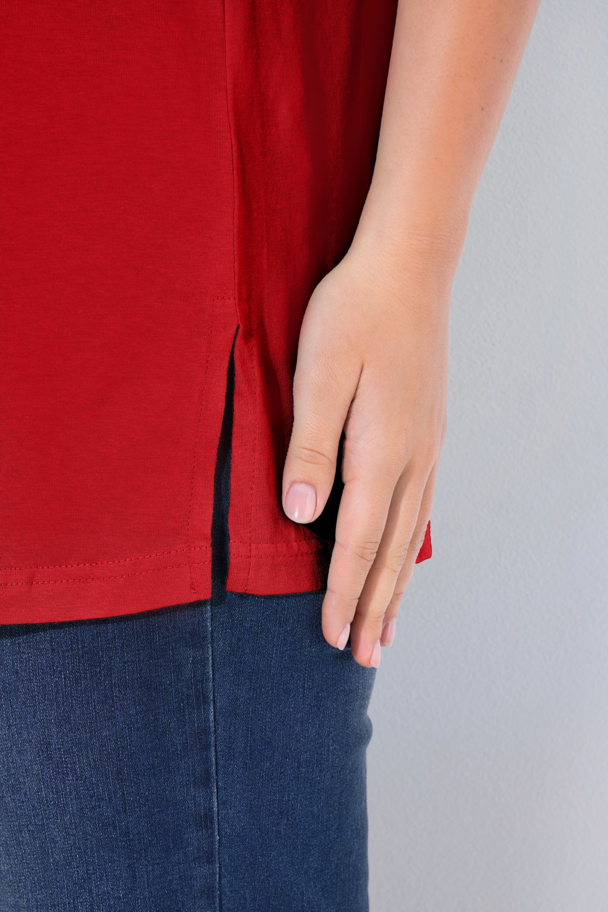 Обикновена тениска. Ежедневна кройка в голям размер от мек памук. Заоблено деколте, къси ръкави и странични процепи.