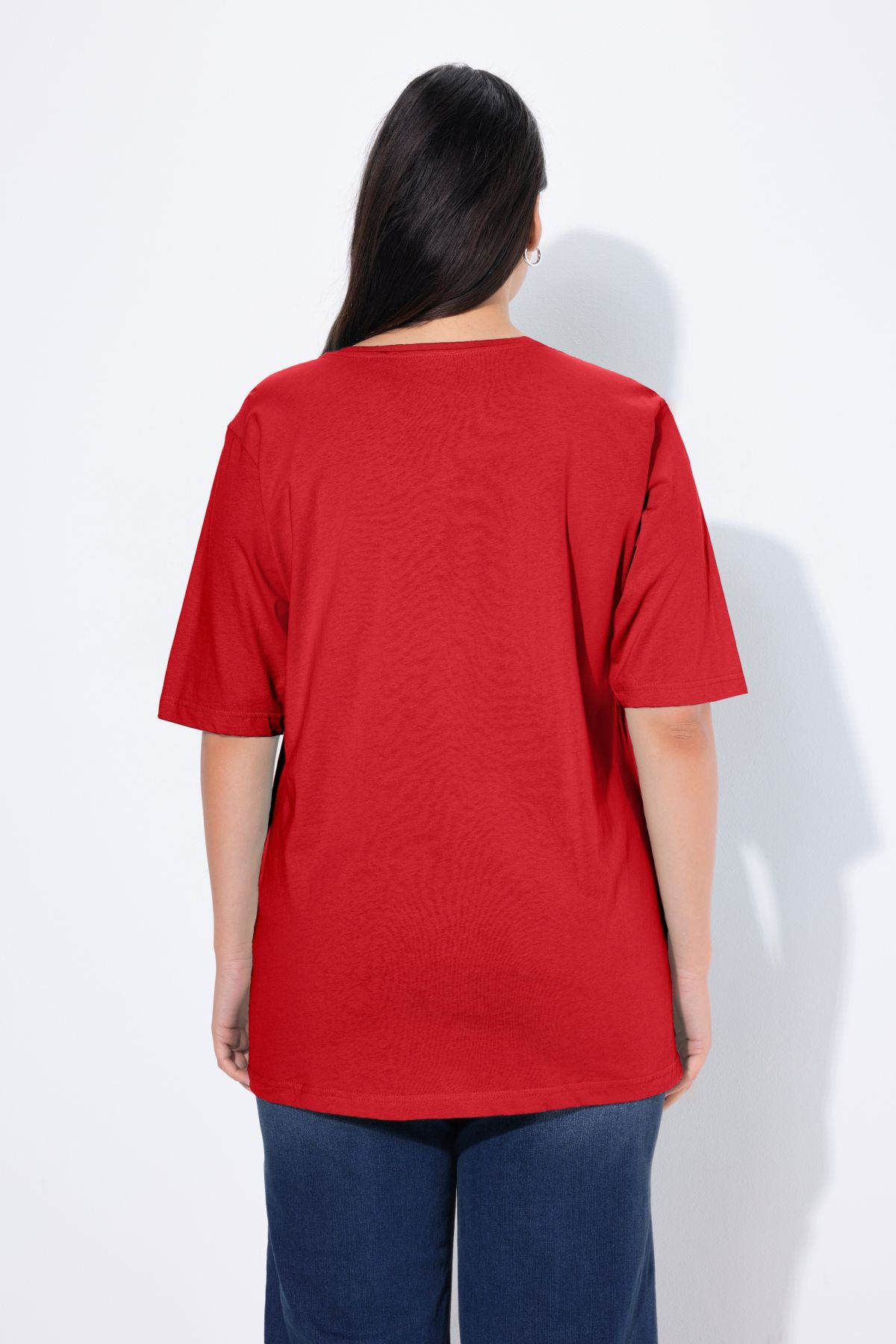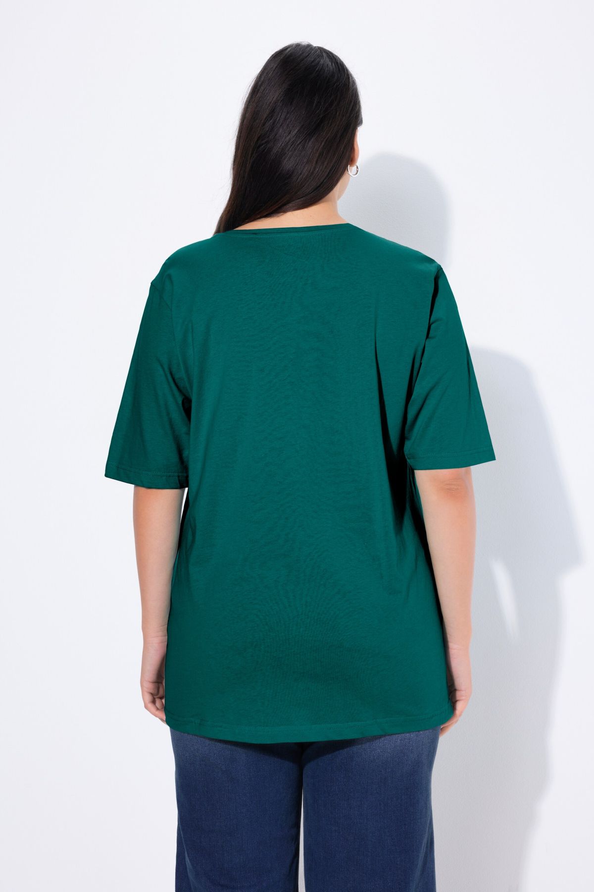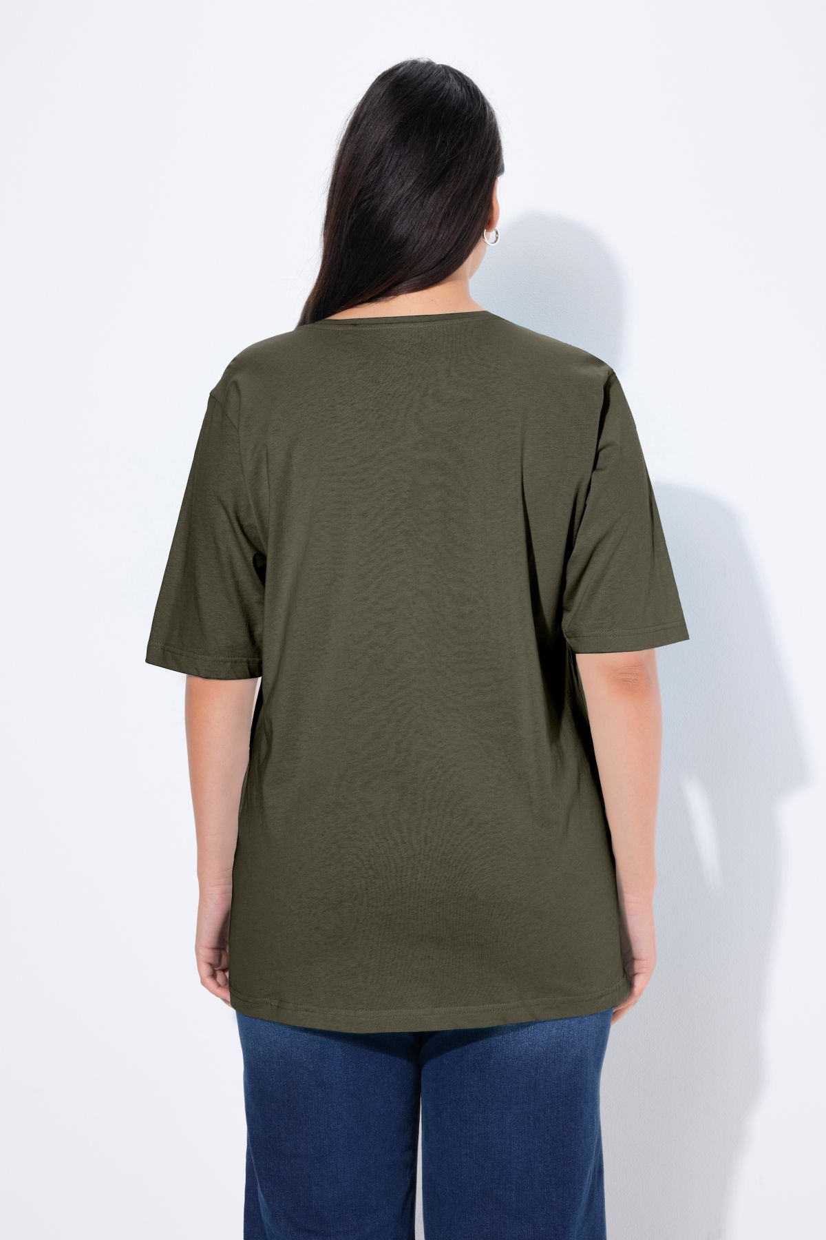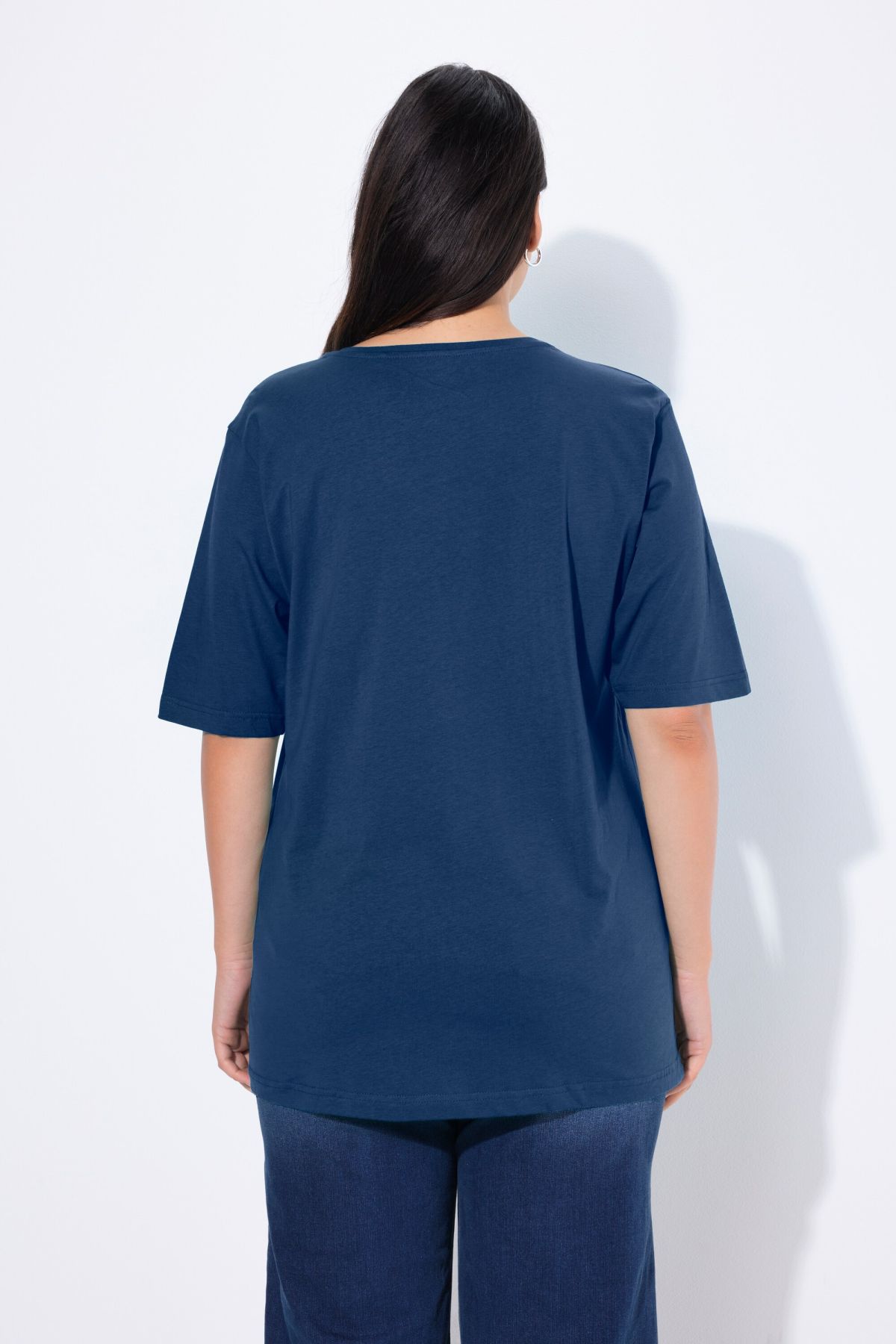 Обикновена тениска. Ежедневна кройка в голям размер от мек памук. Заоблено деколте, къси ръкави и странични процепи.