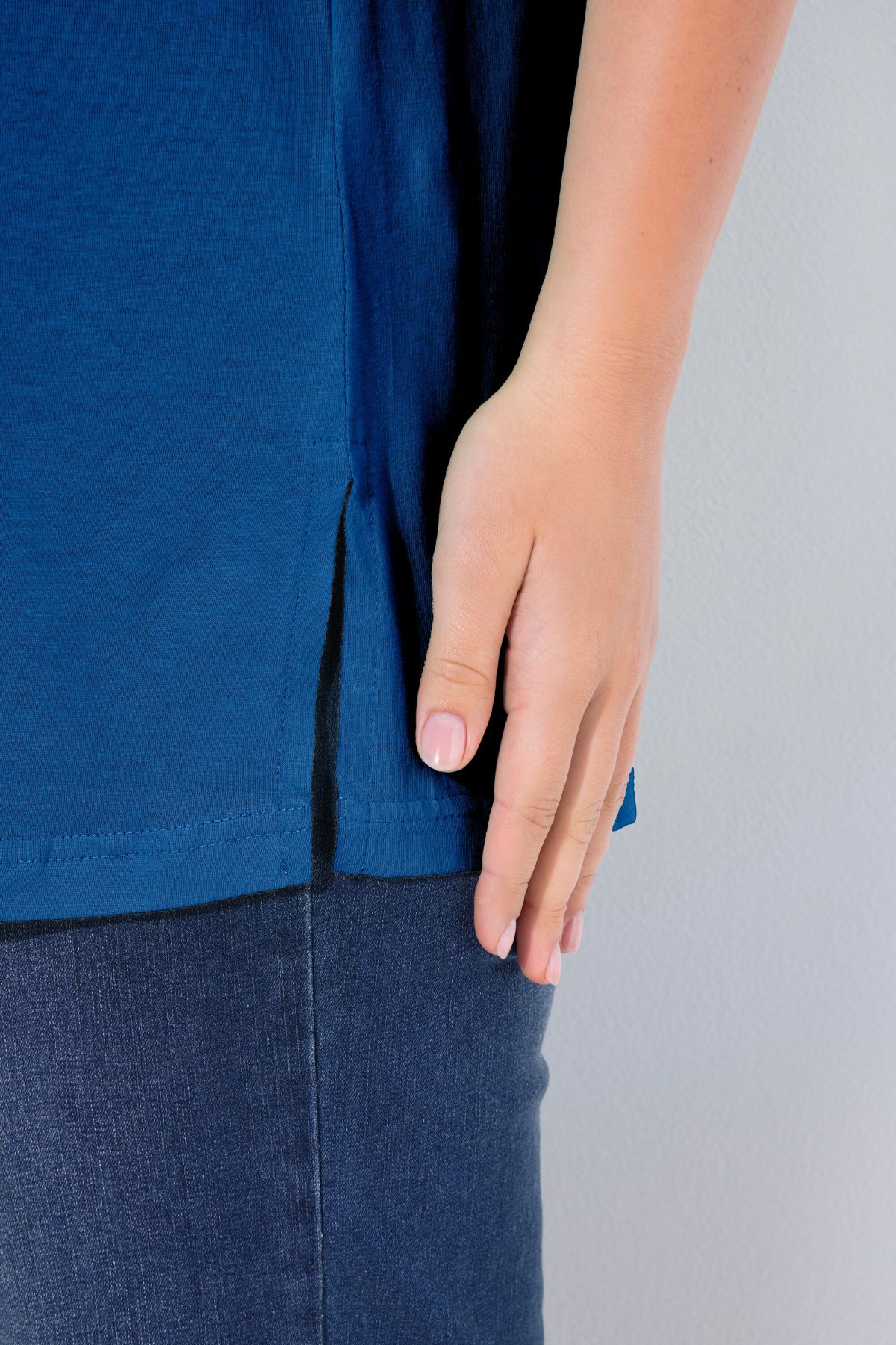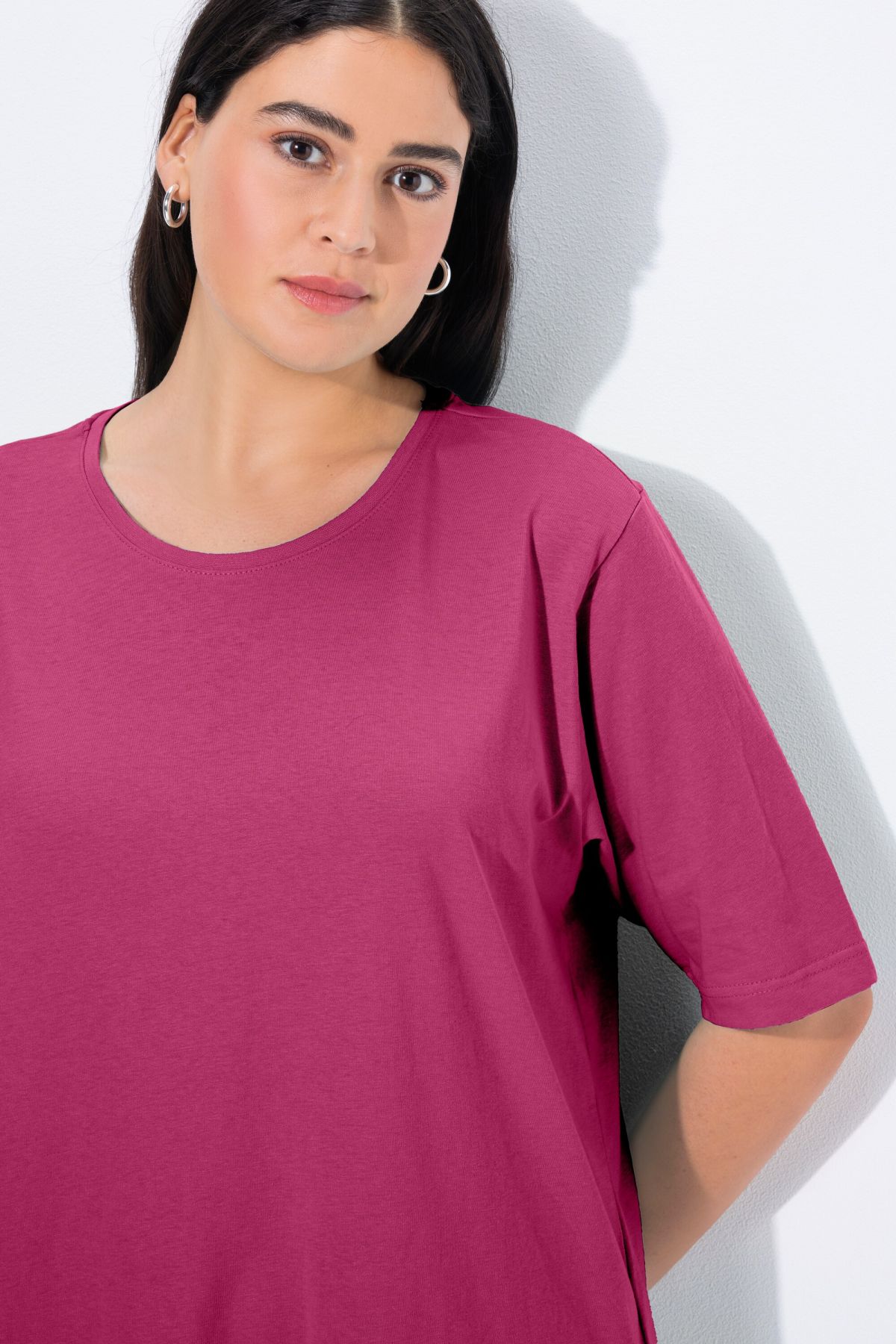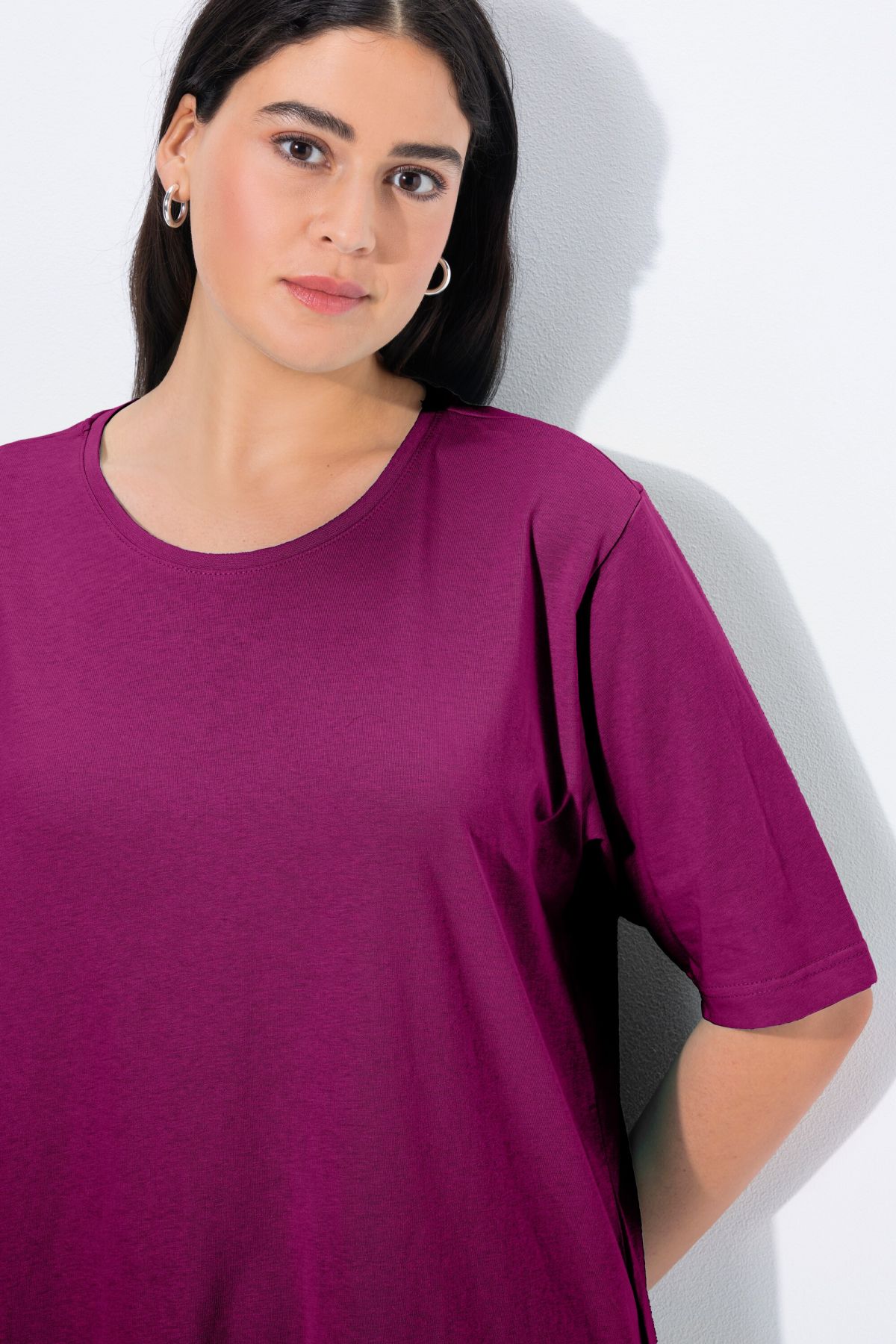 Обикновена тениска. Ежедневна кройка в голям размер от мек памук. Заоблено деколте, къси ръкави и странични процепи.