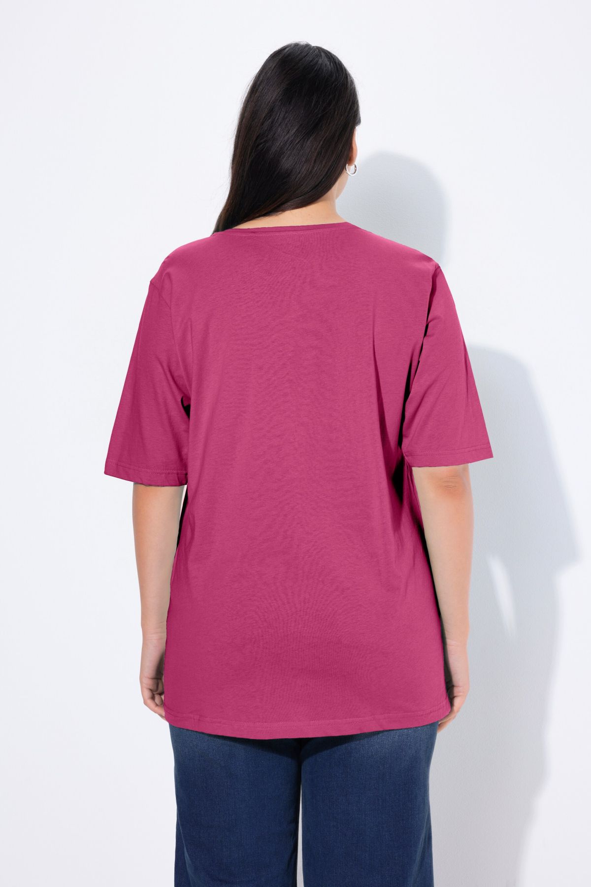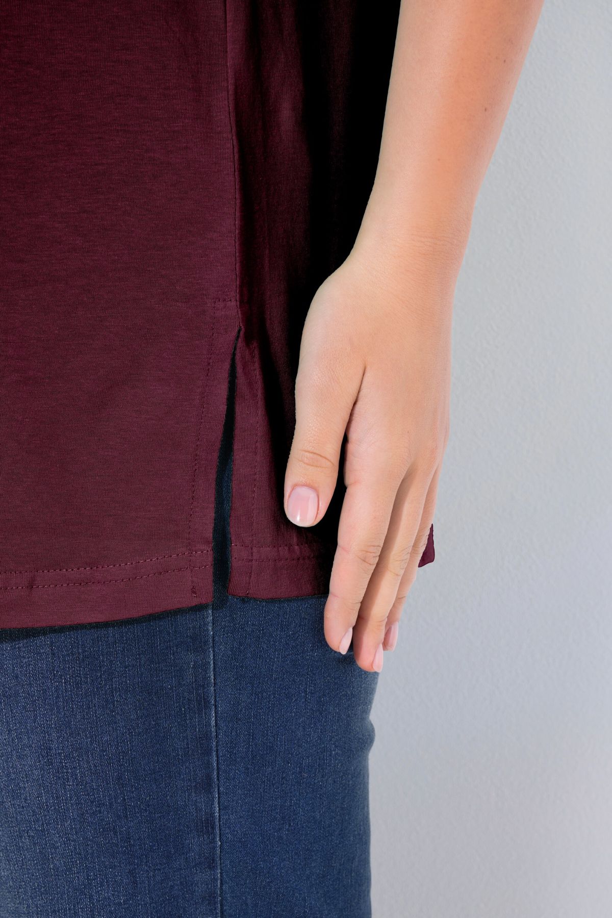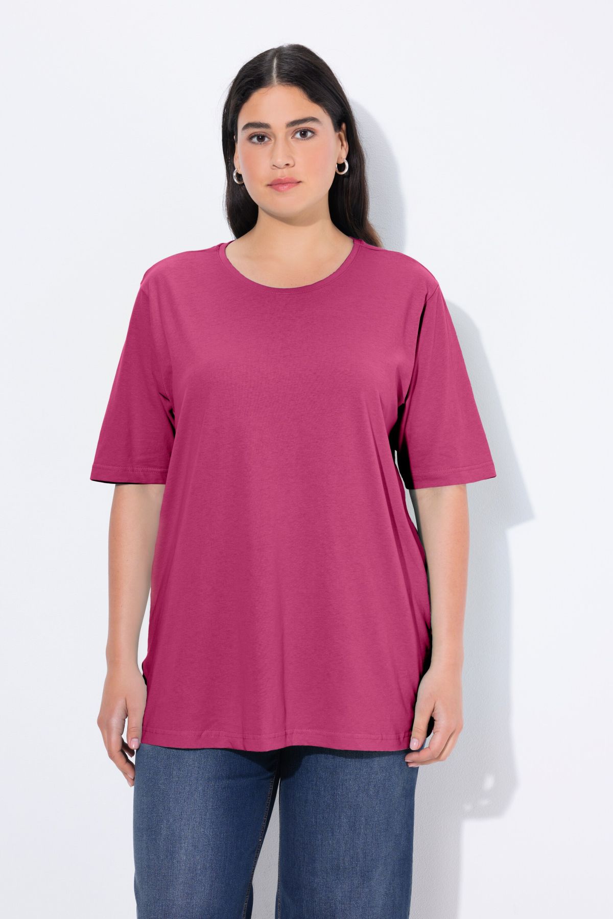 Обикновена тениска. Ежедневна кройка в голям размер от мек памук. Заоблено деколте, къси ръкави и странични процепи.