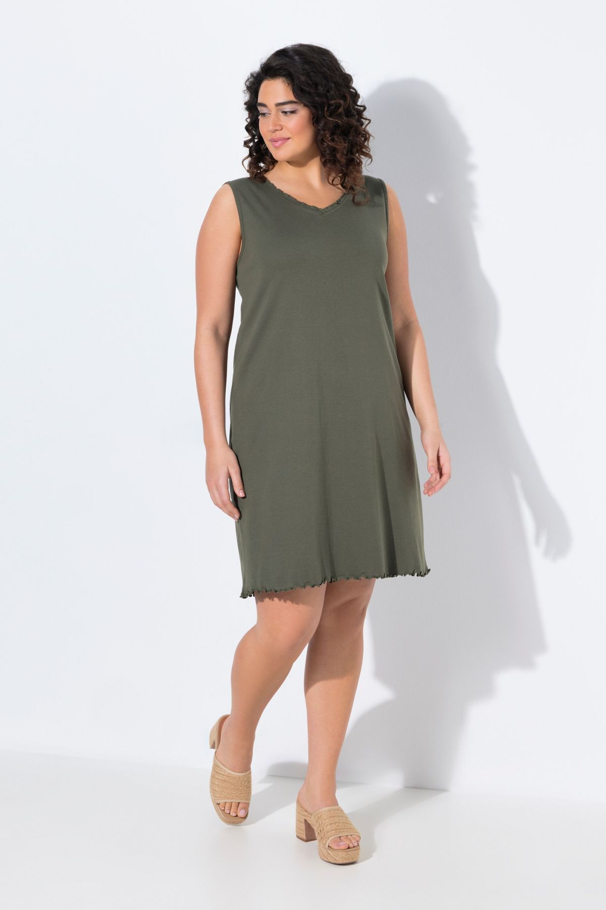 Рокля тип туника с модерен къдрав подгъв и А - линия на силуета. С V - образно деколте, широки презрамки без ръкави и фина рипсена материя