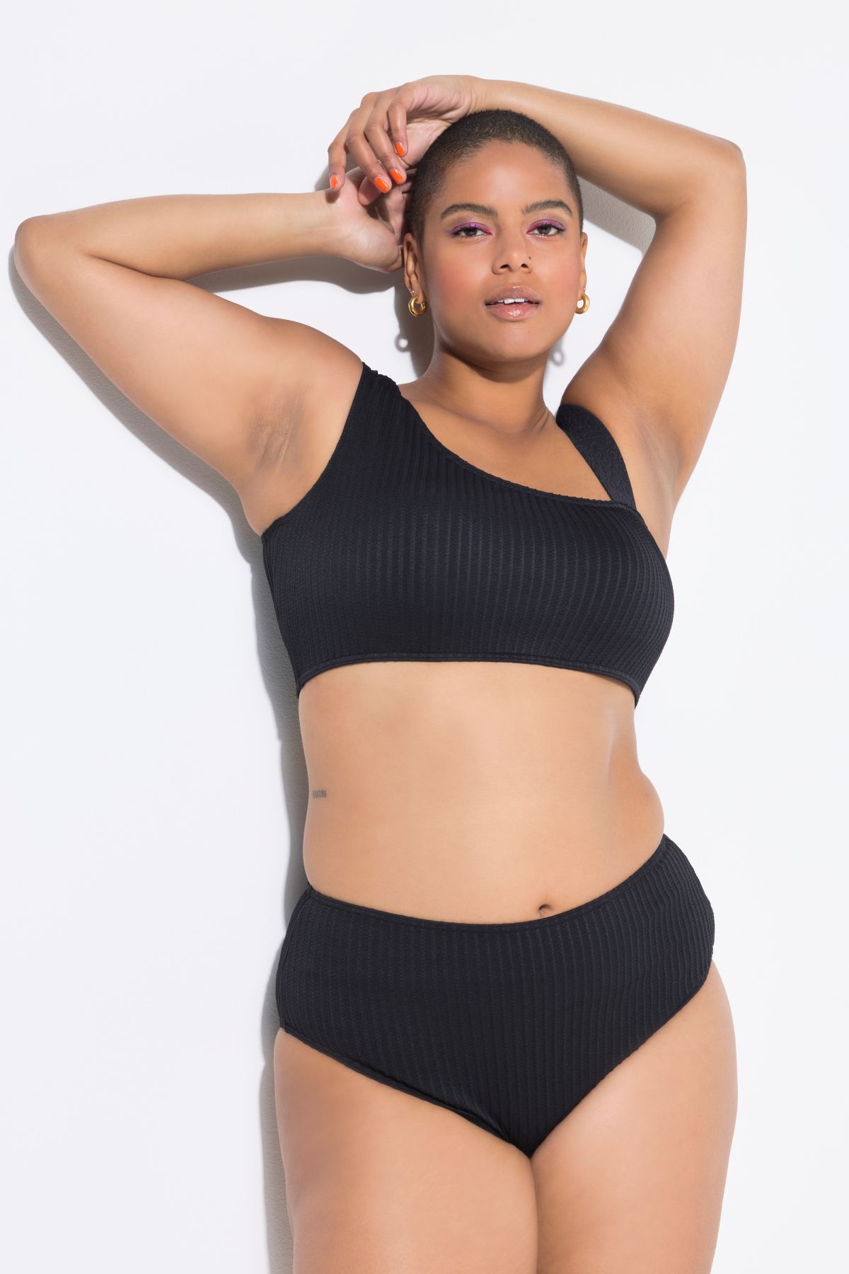 Горнище на бански със свалящи се чашки и раирана структура. С едно рамо и презрамки с леопардови мотиви. Моделът е облечен с размер 42 и е висок 178 см.