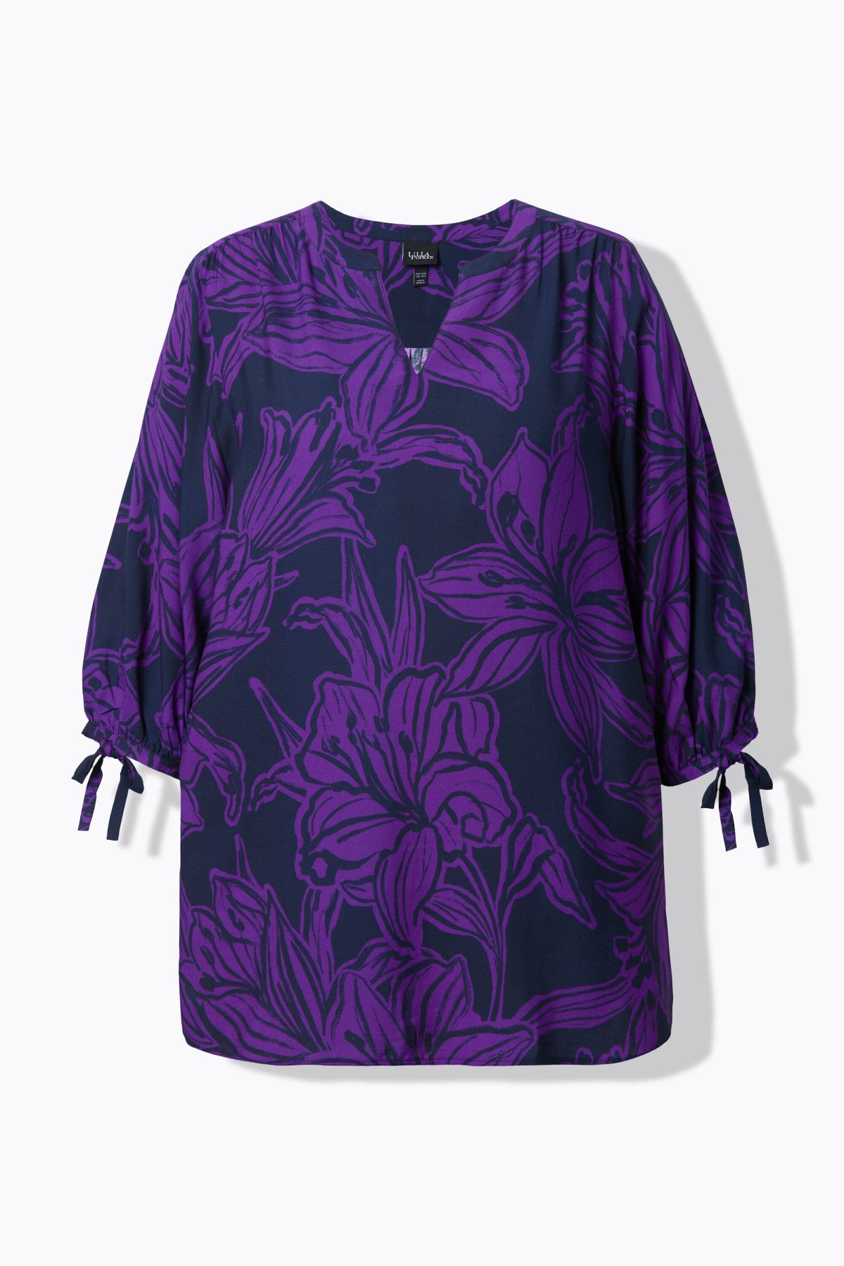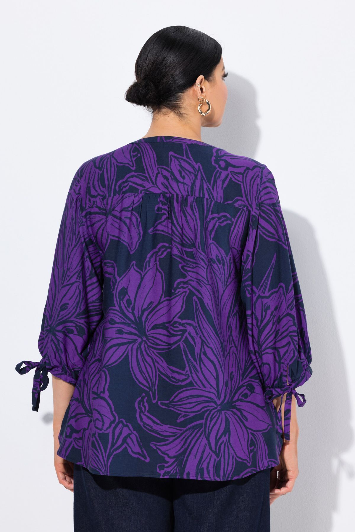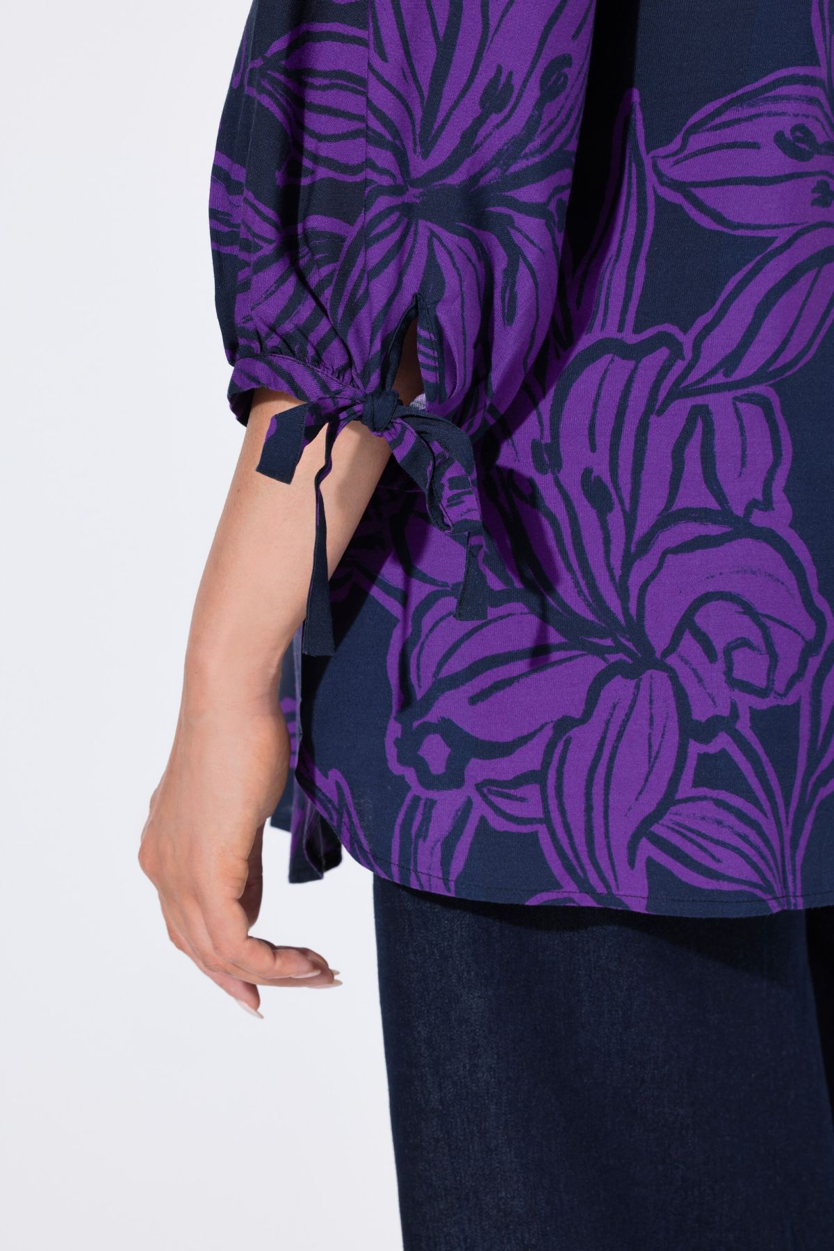 Блуза с принт на лилии с женствена кройка и контрастни детайли. От мека, вискозна материя. С кръгло деколте с цепка и 3/4 ръкави с еластичен маншет.