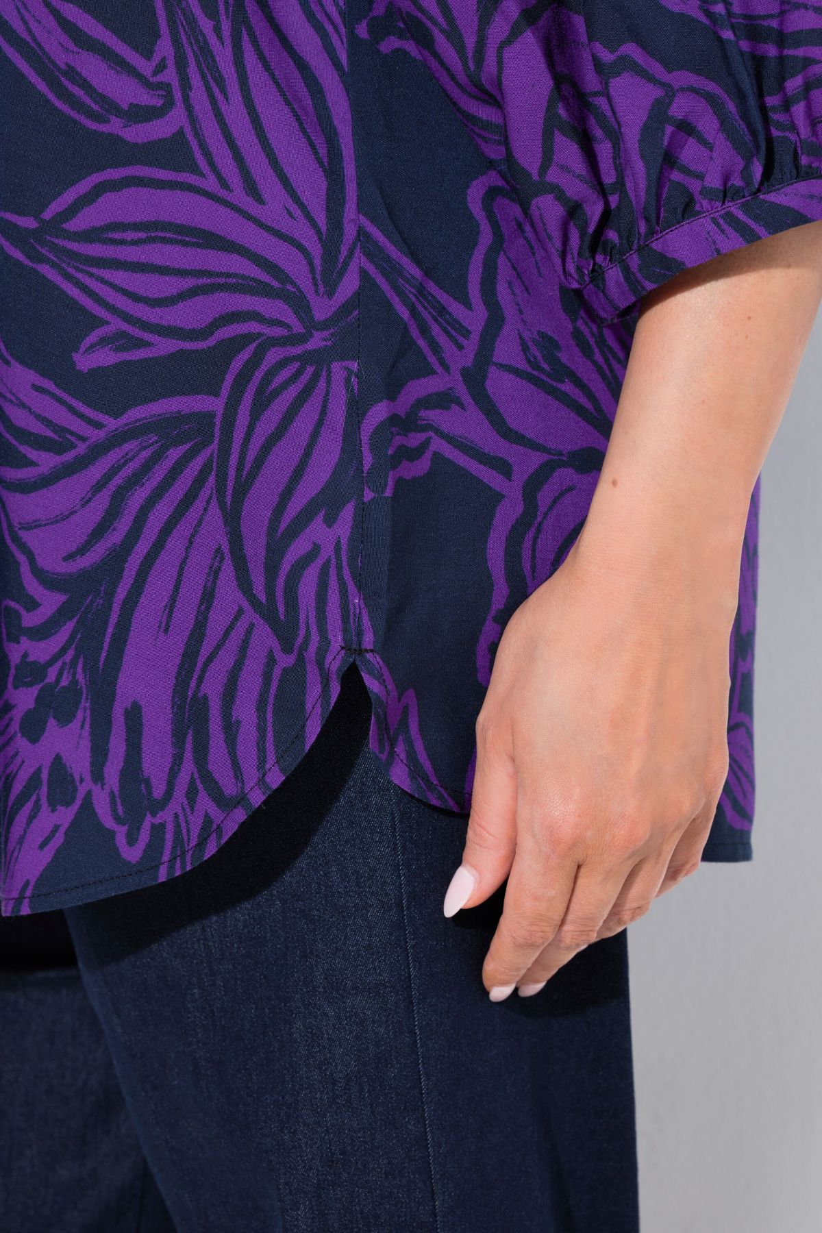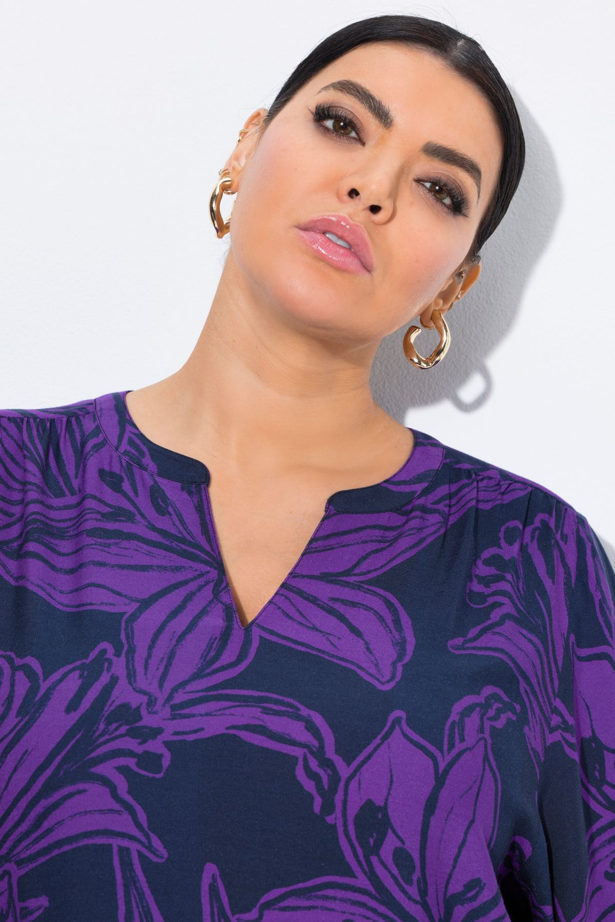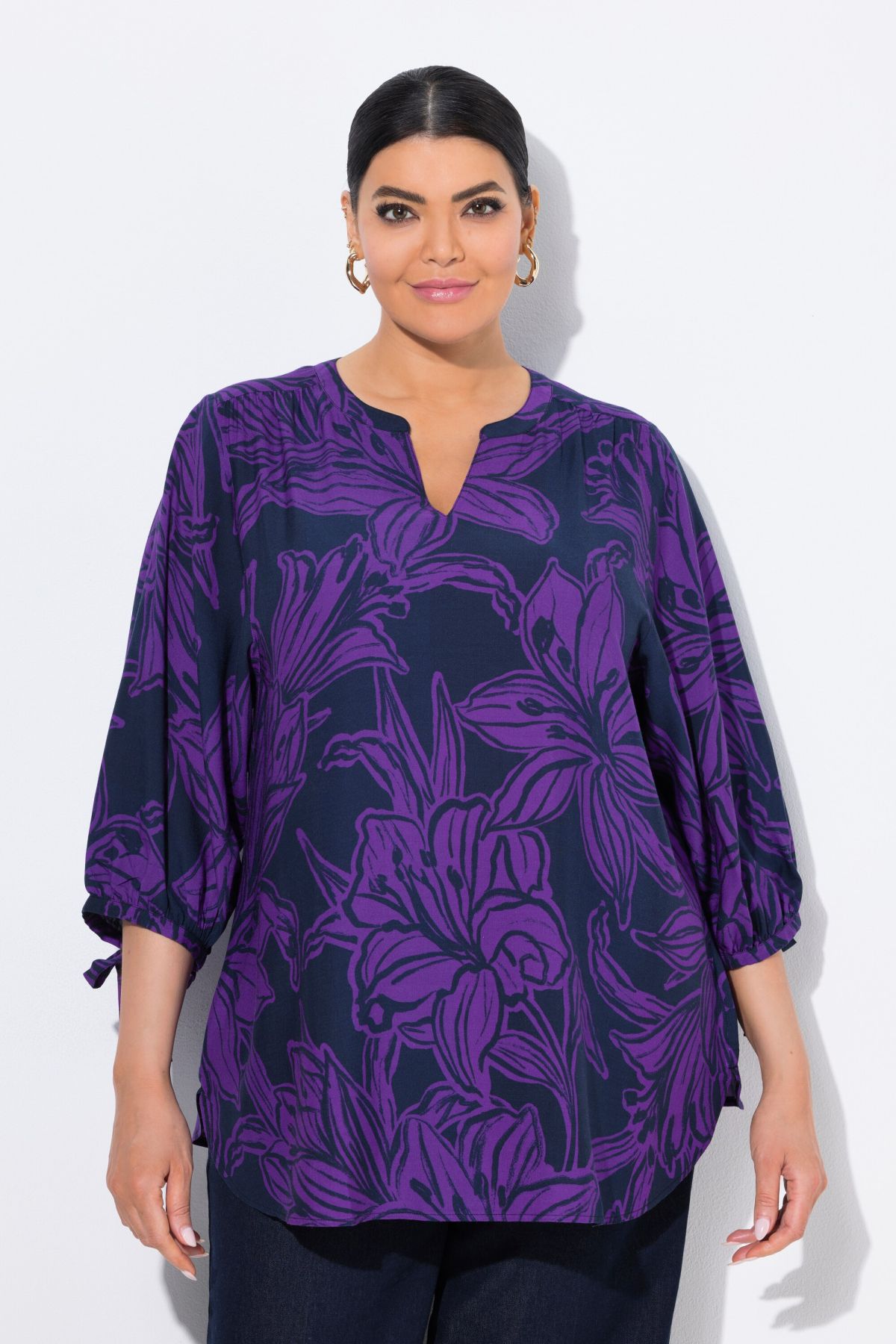 Блуза с принт на лилии с женствена кройка и контрастни детайли. От мека, вискозна материя. С кръгло деколте с цепка и 3/4 ръкави с еластичен маншет.