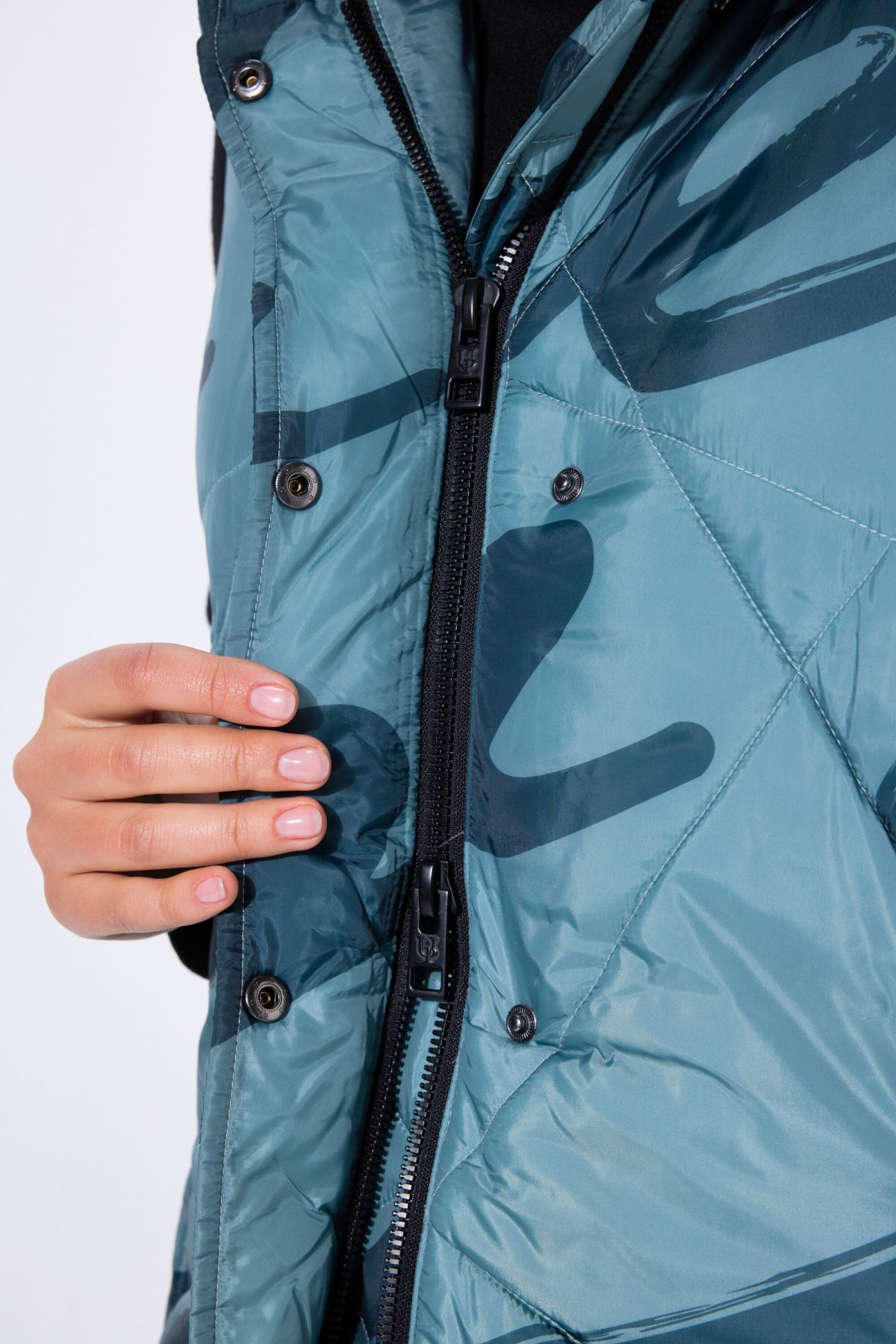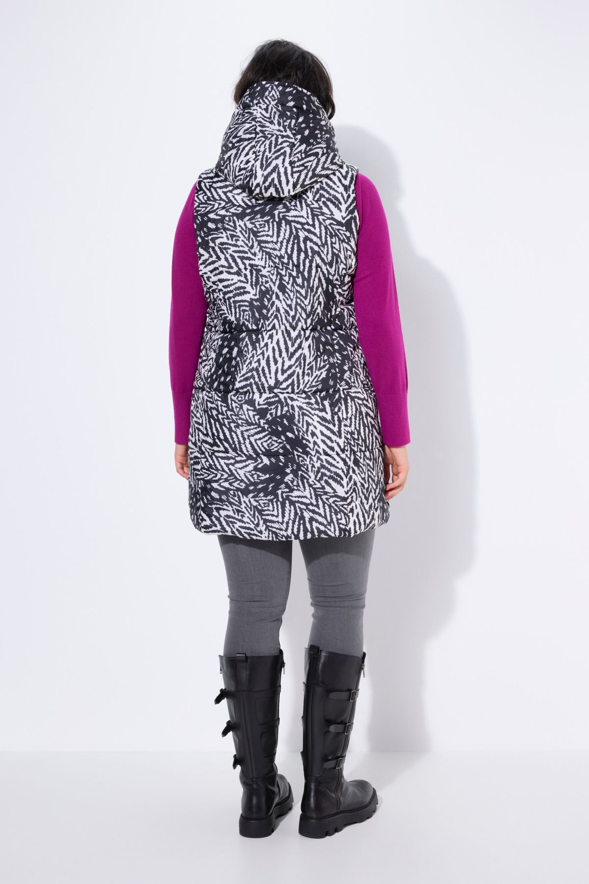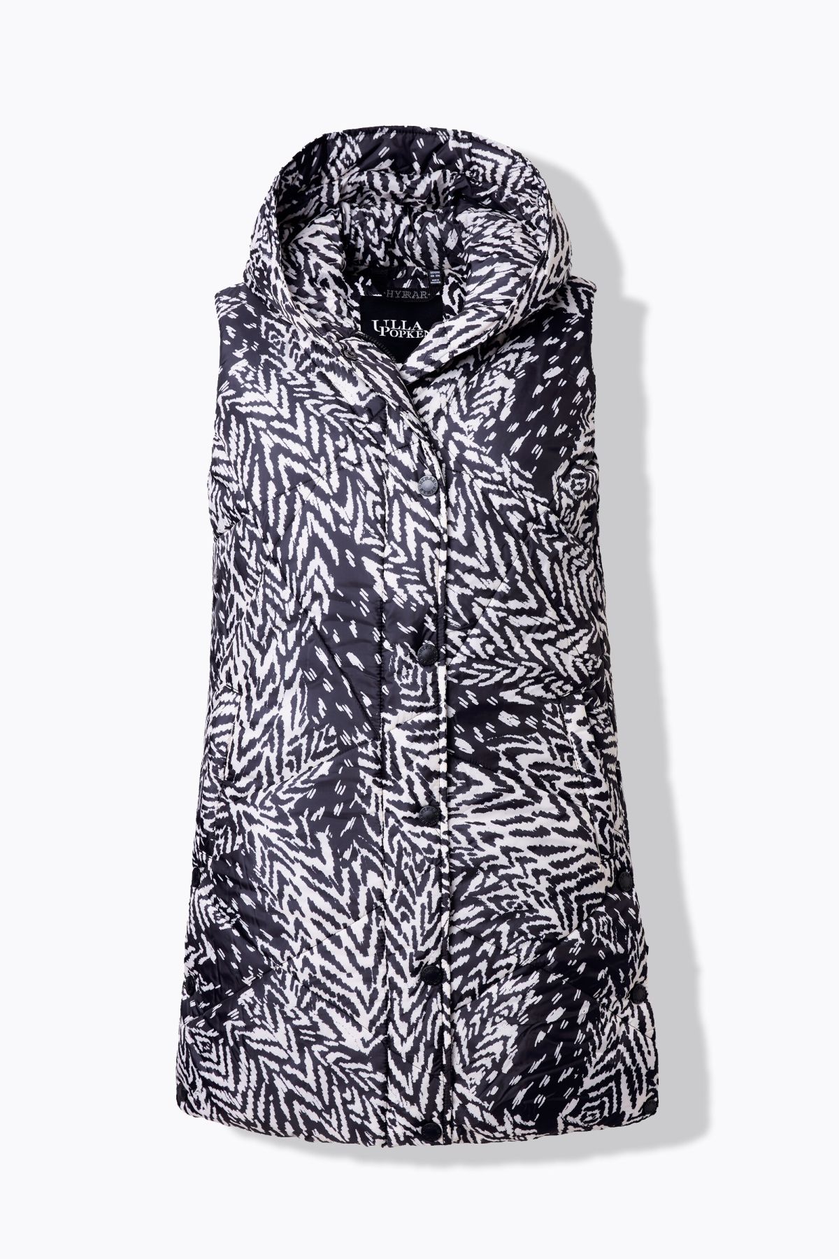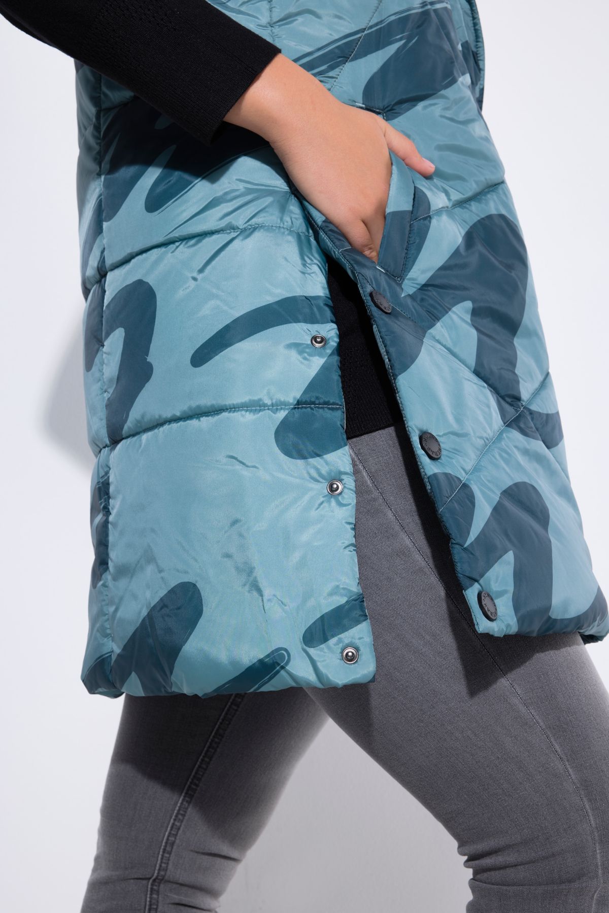 Ватиран елек с принт и модерни акценти. С издължен силует с качулка, цип отпред, странични джобове и странични цепки с акцент от копчета.