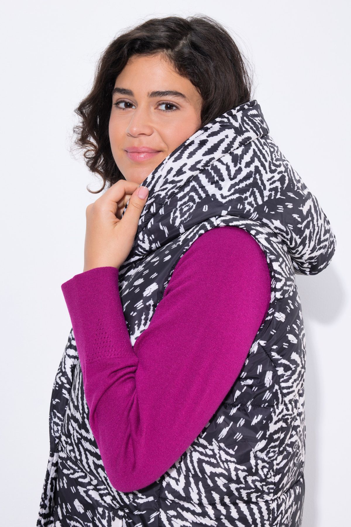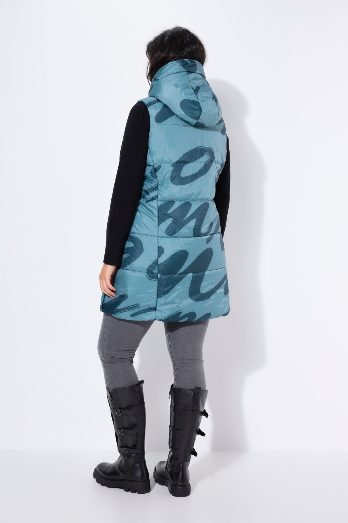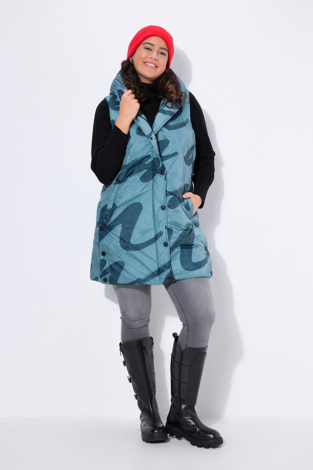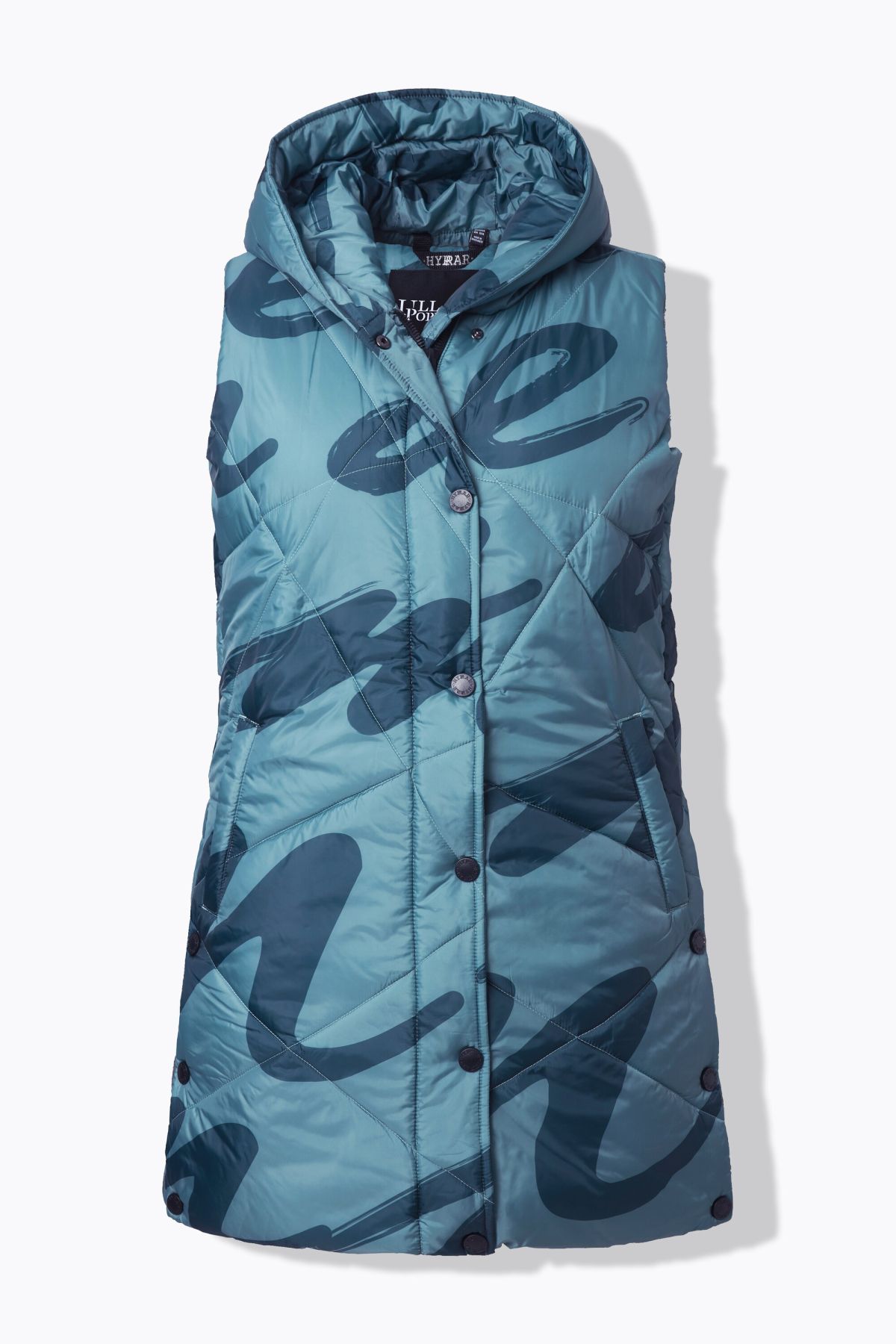 Ватиран елек с принт и модерни акценти. С издължен силует с качулка, цип отпред, странични джобове и странични цепки с акцент от копчета.