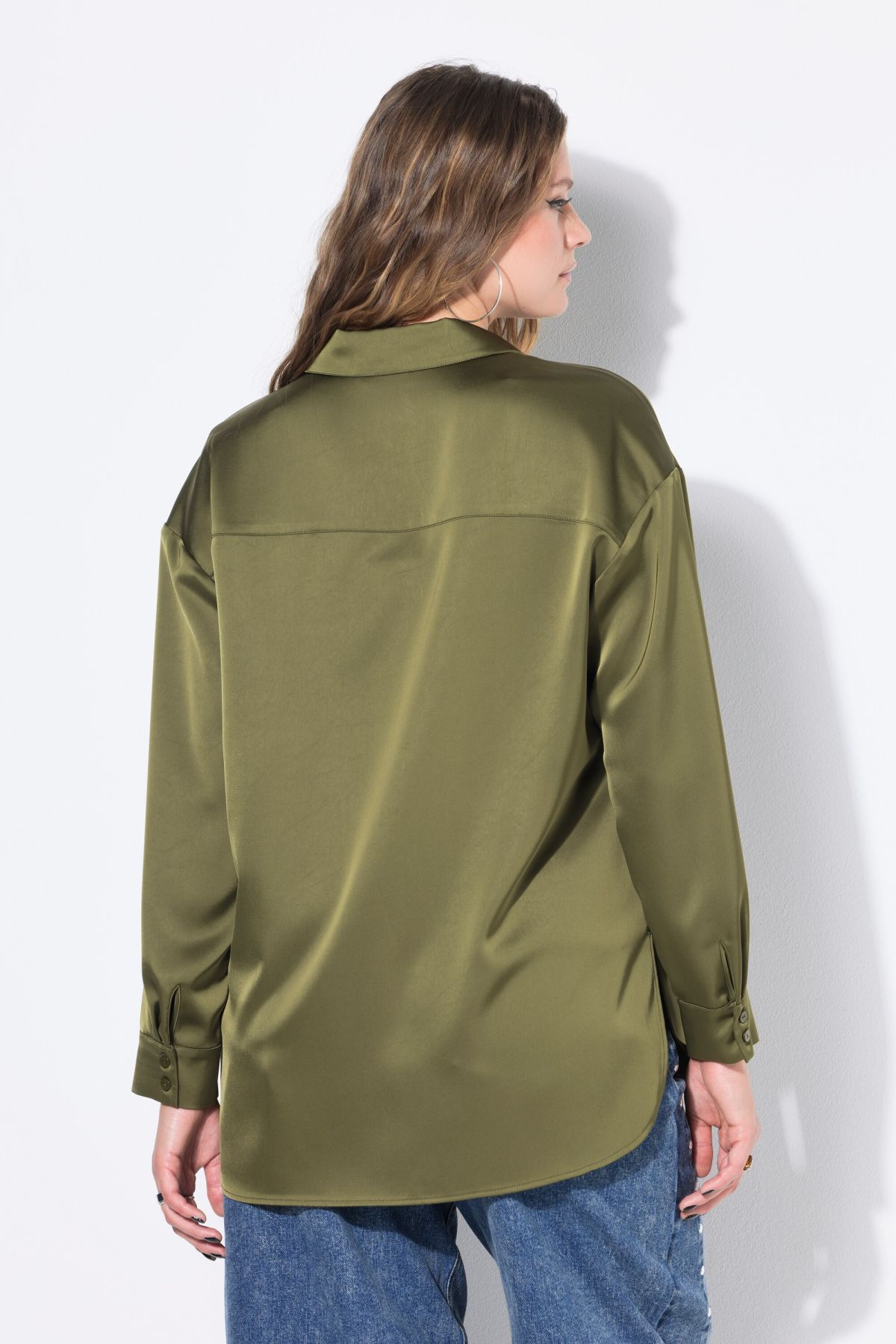 Сатенена риза от лека материя с разкроен силует. С яка, копчета отпред и дълги ръкави с маншет с копче. Стилна и елегантна за всеки повод.