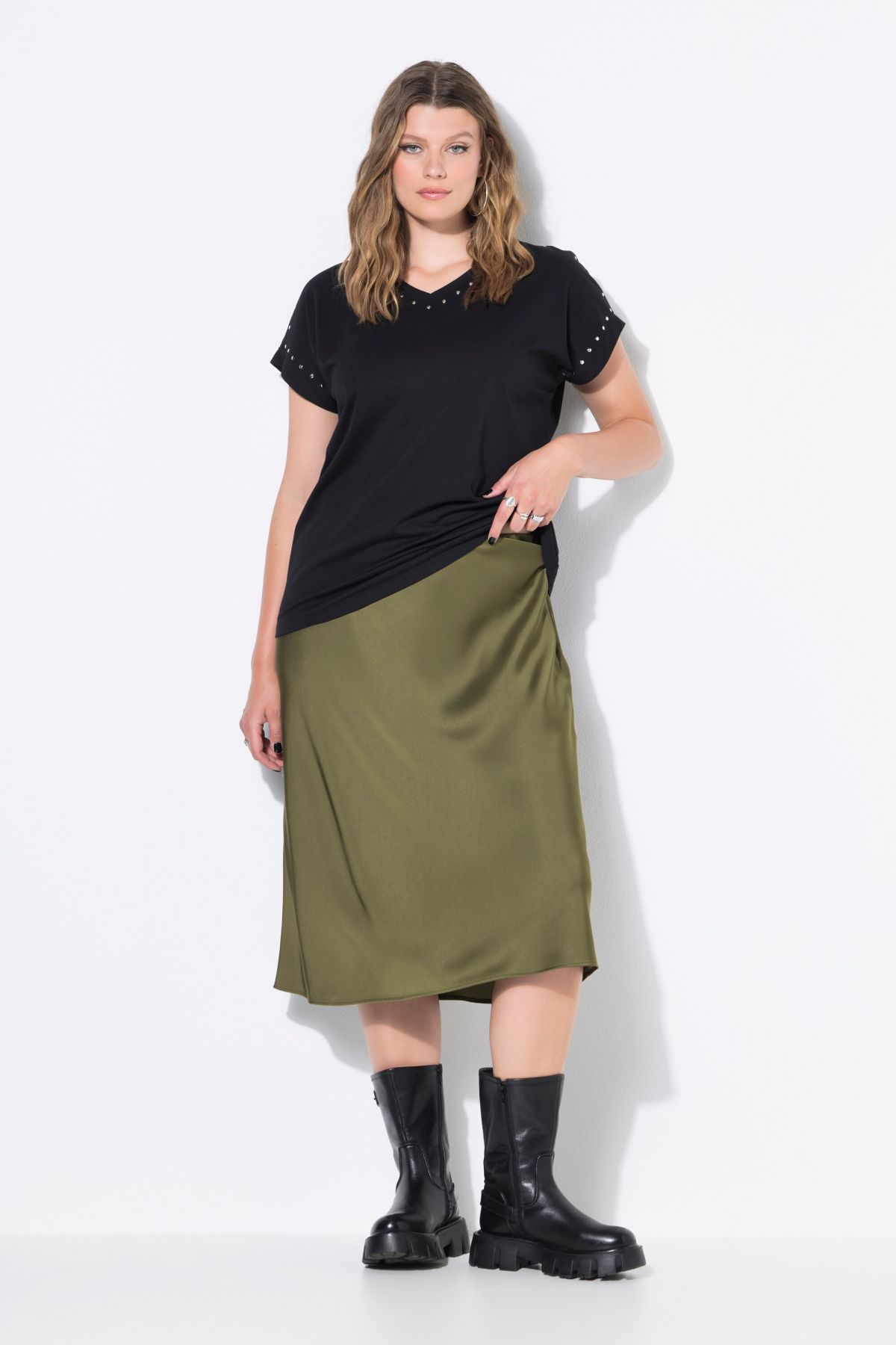 Сатенена пола - стилна и комфортна, завършваща всеки силует. С фиксирана талия отпред и еластична отзад. Със странични джобове.
