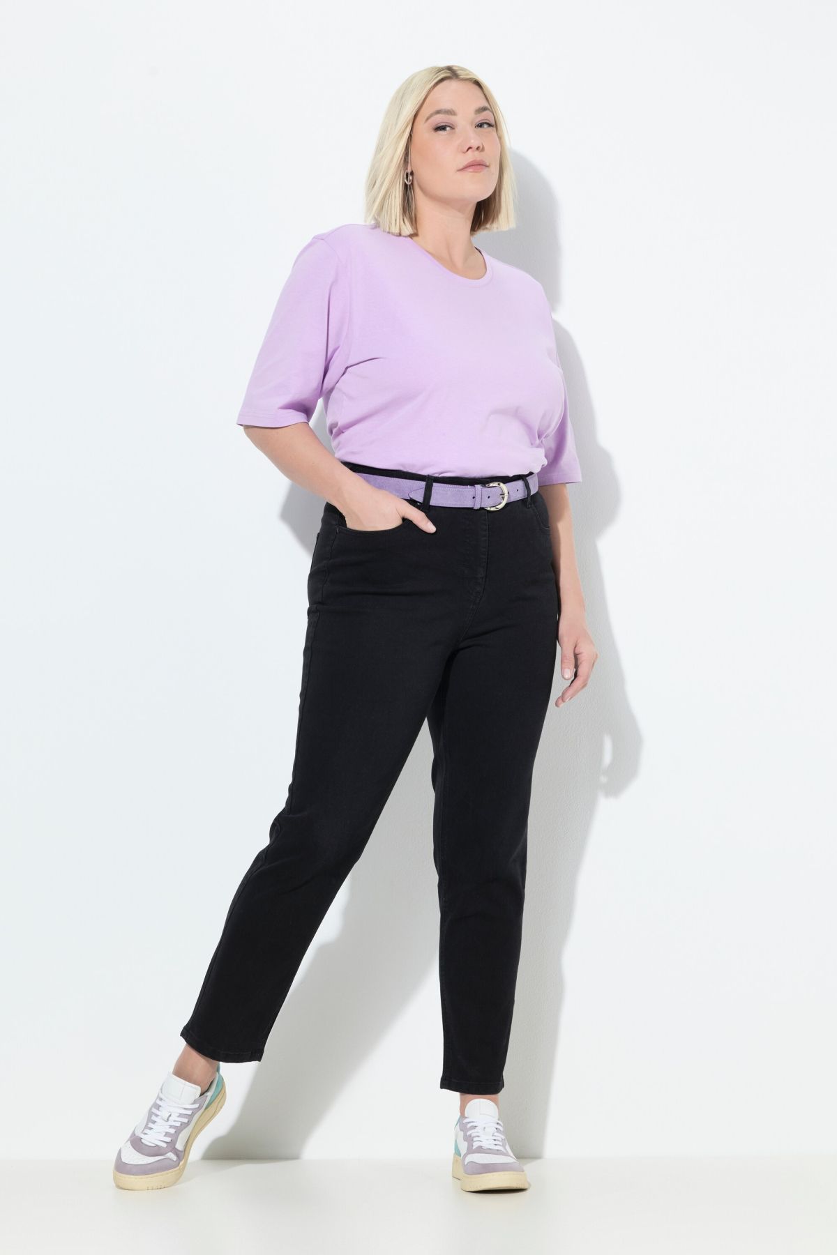 Дънки тип Mom еластични - перфектният избор за ежедневието. Дизайн с фиксирана талия с гайки за колан, копче и цип отпред. С 5 джоба и еластична материя.