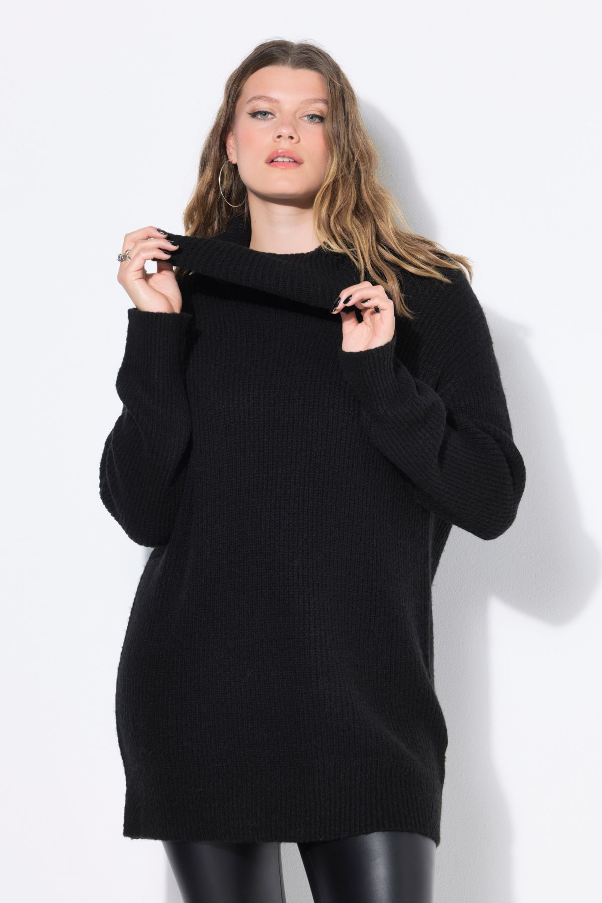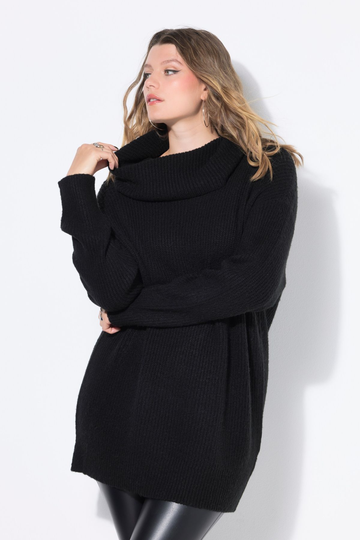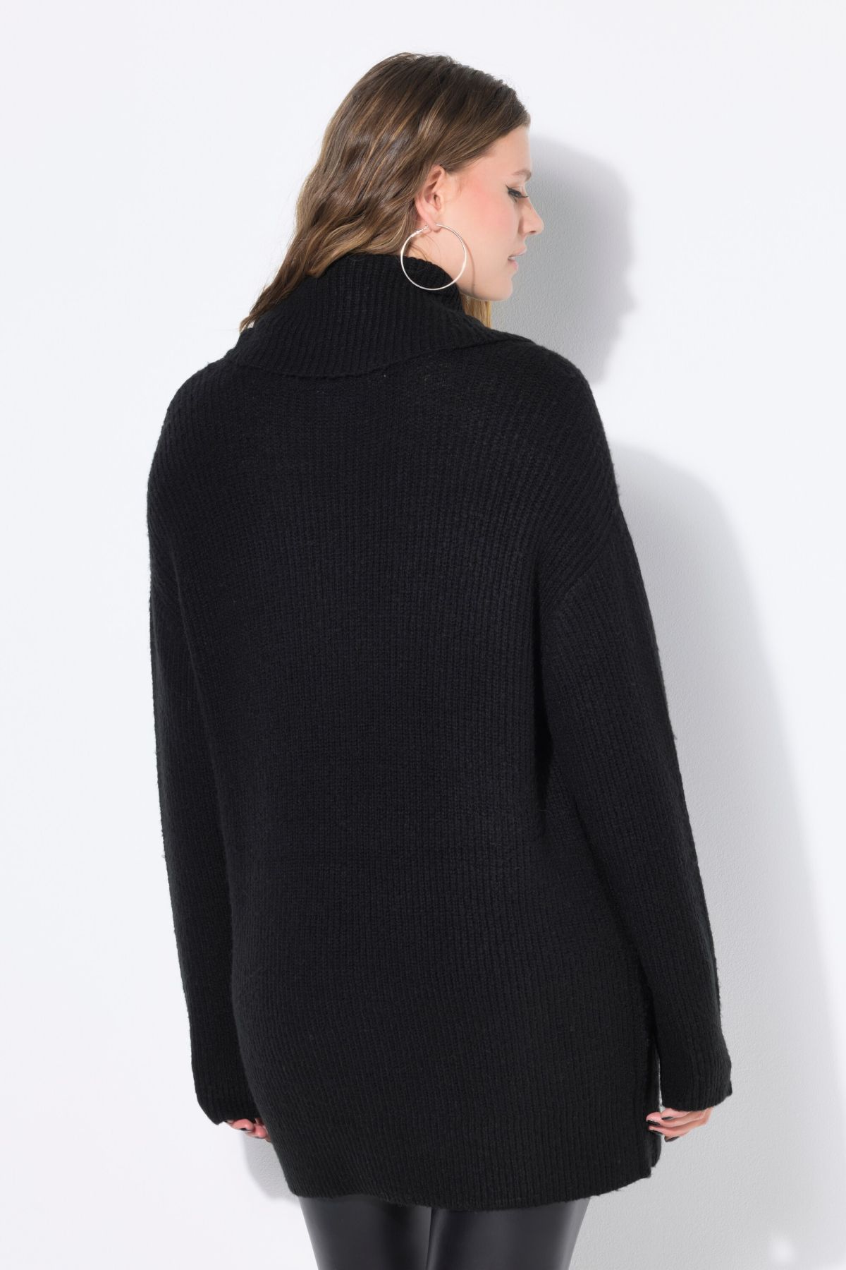 Пуловер с издължена кройка с висока модерна яка в неонов цвят. С разкроен силует, дълги ръкави и рипсени маншети.