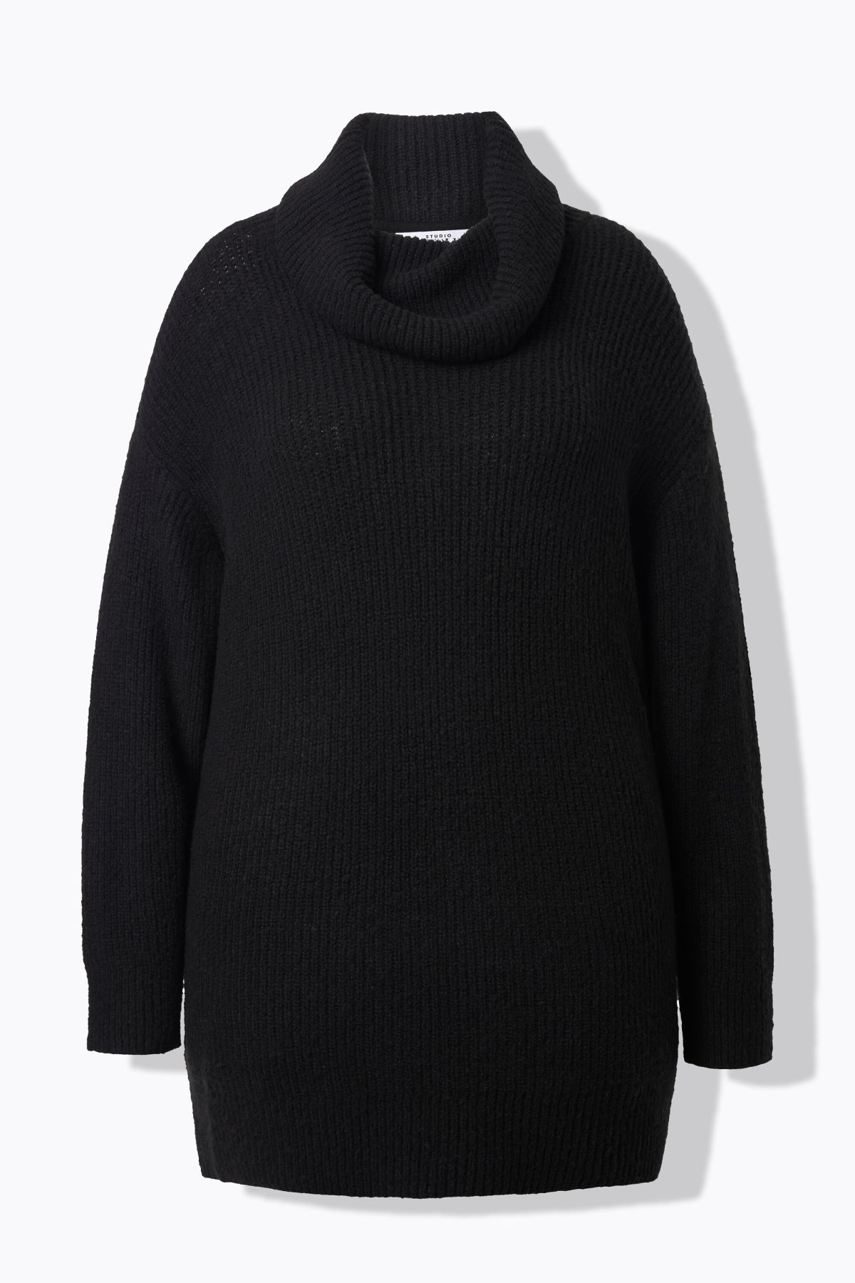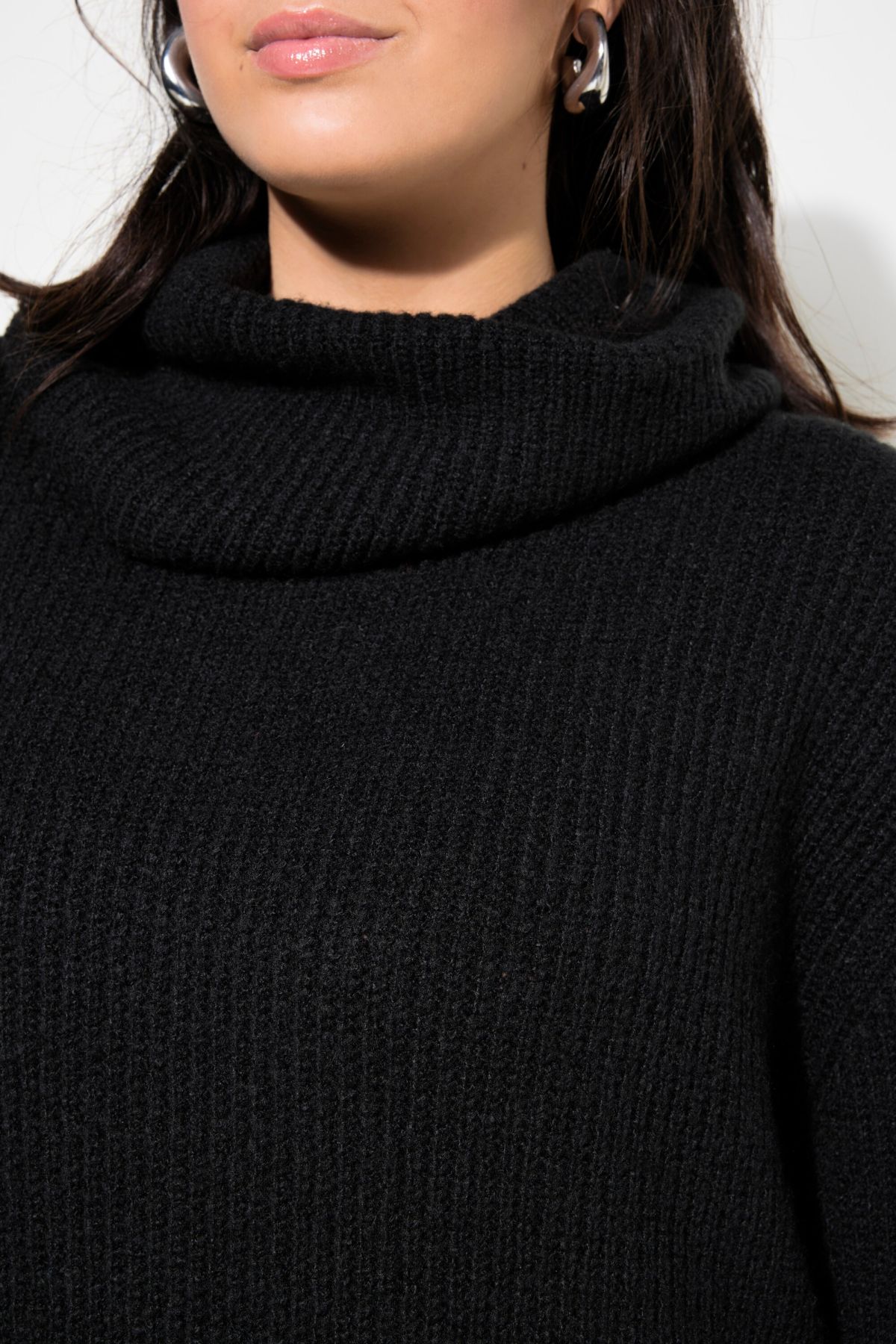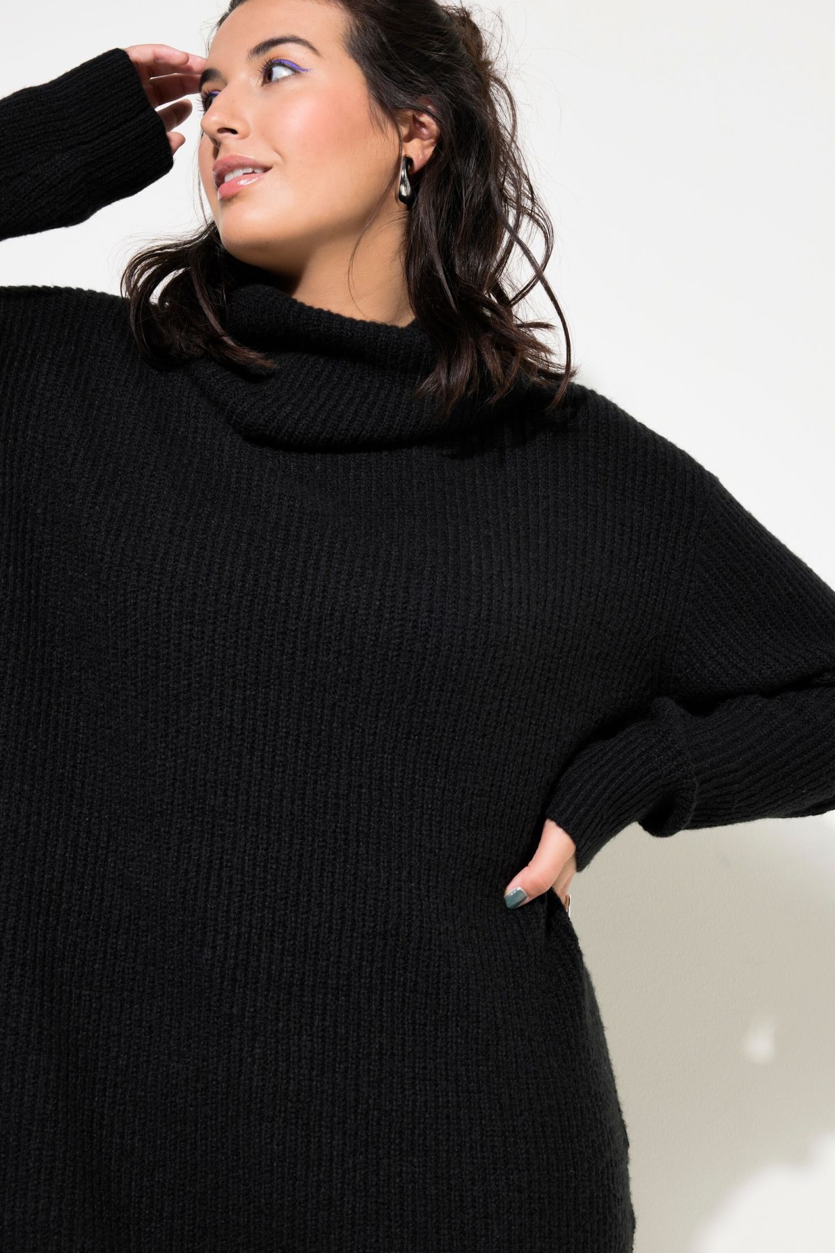 Пуловер с издължена кройка с висока модерна яка в неонов цвят. С разкроен силует, дълги ръкави и рипсени маншети.