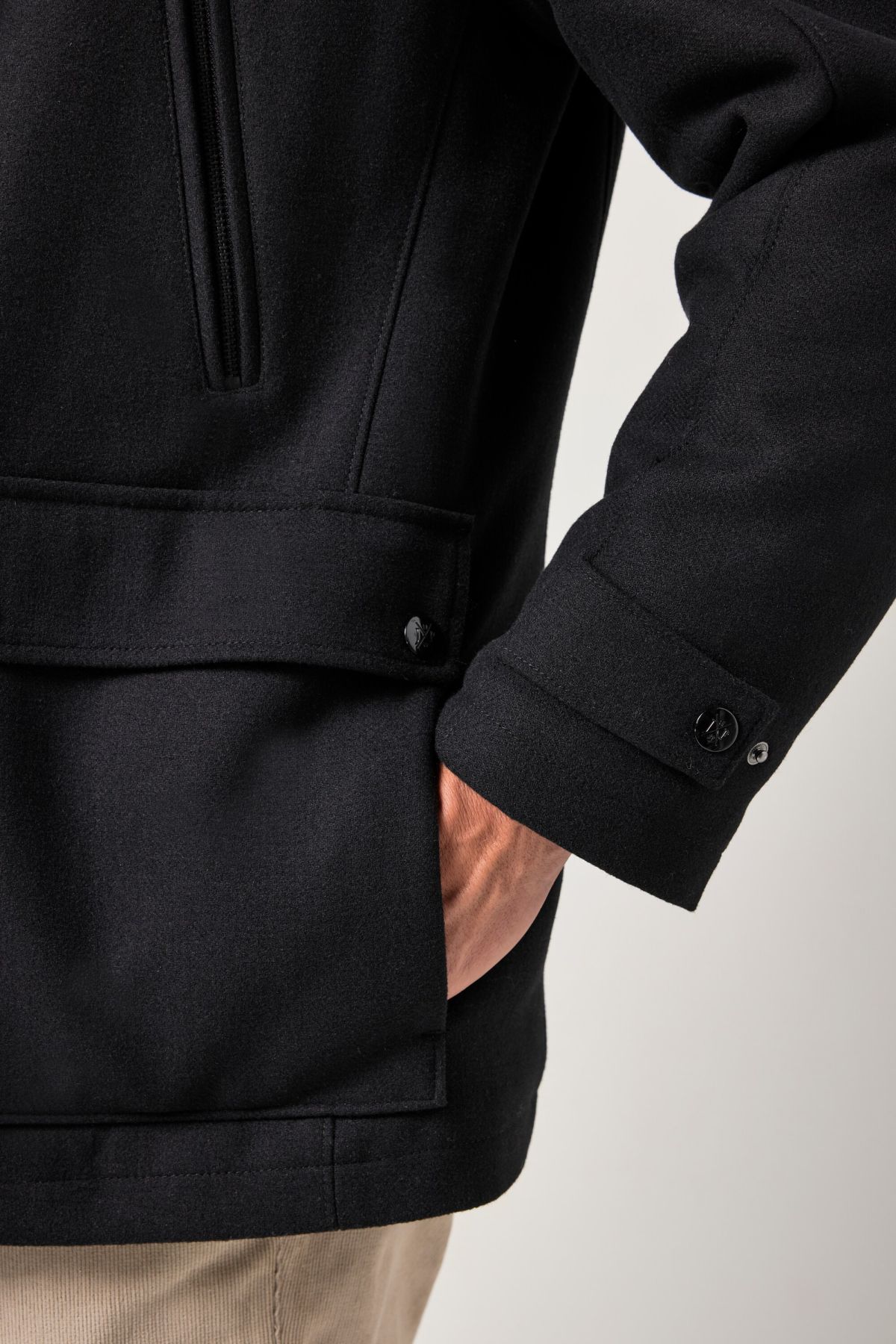 Водонепромокаемо палто от вълнена материя - перфектно за носене по всяко време на годината, благодарение на плетката. С изправена яка, копчета и джоб на гърдите с ципове. С 2 джоба с двупосочни джобове.