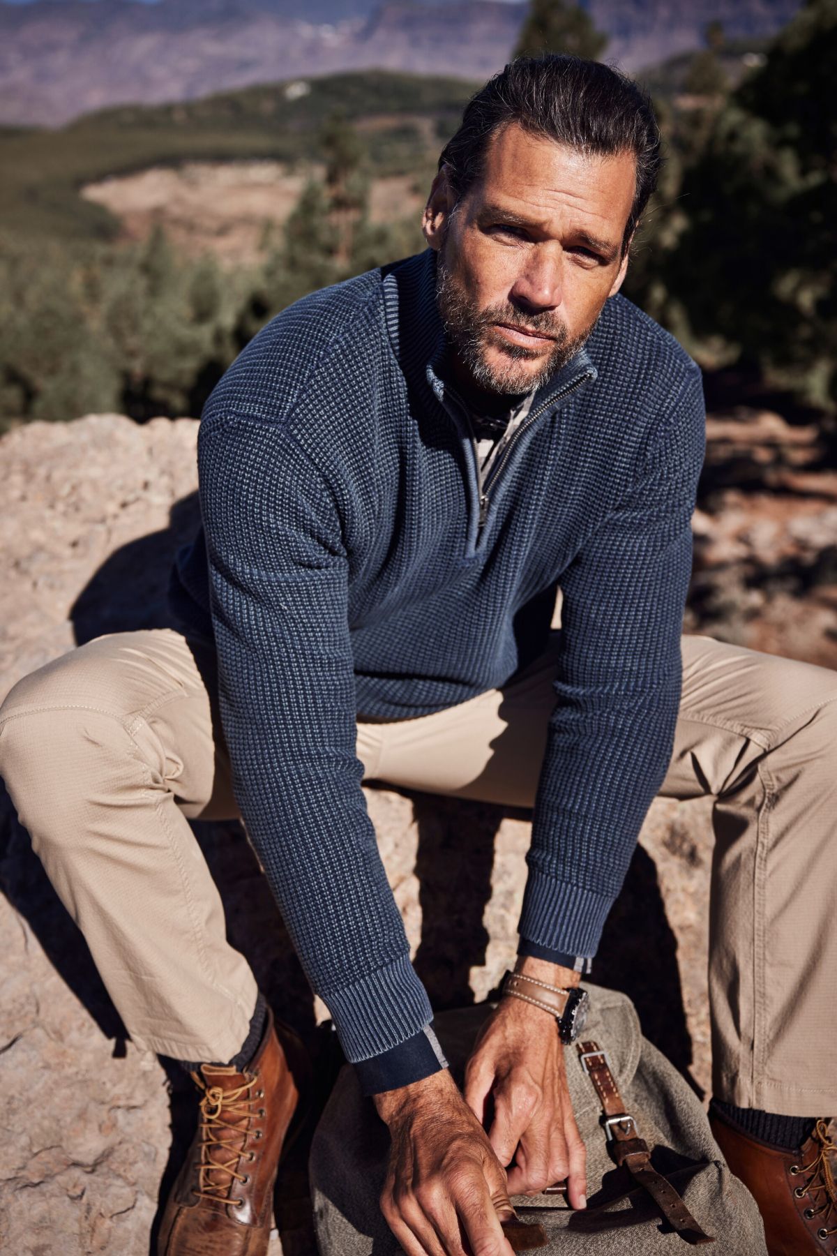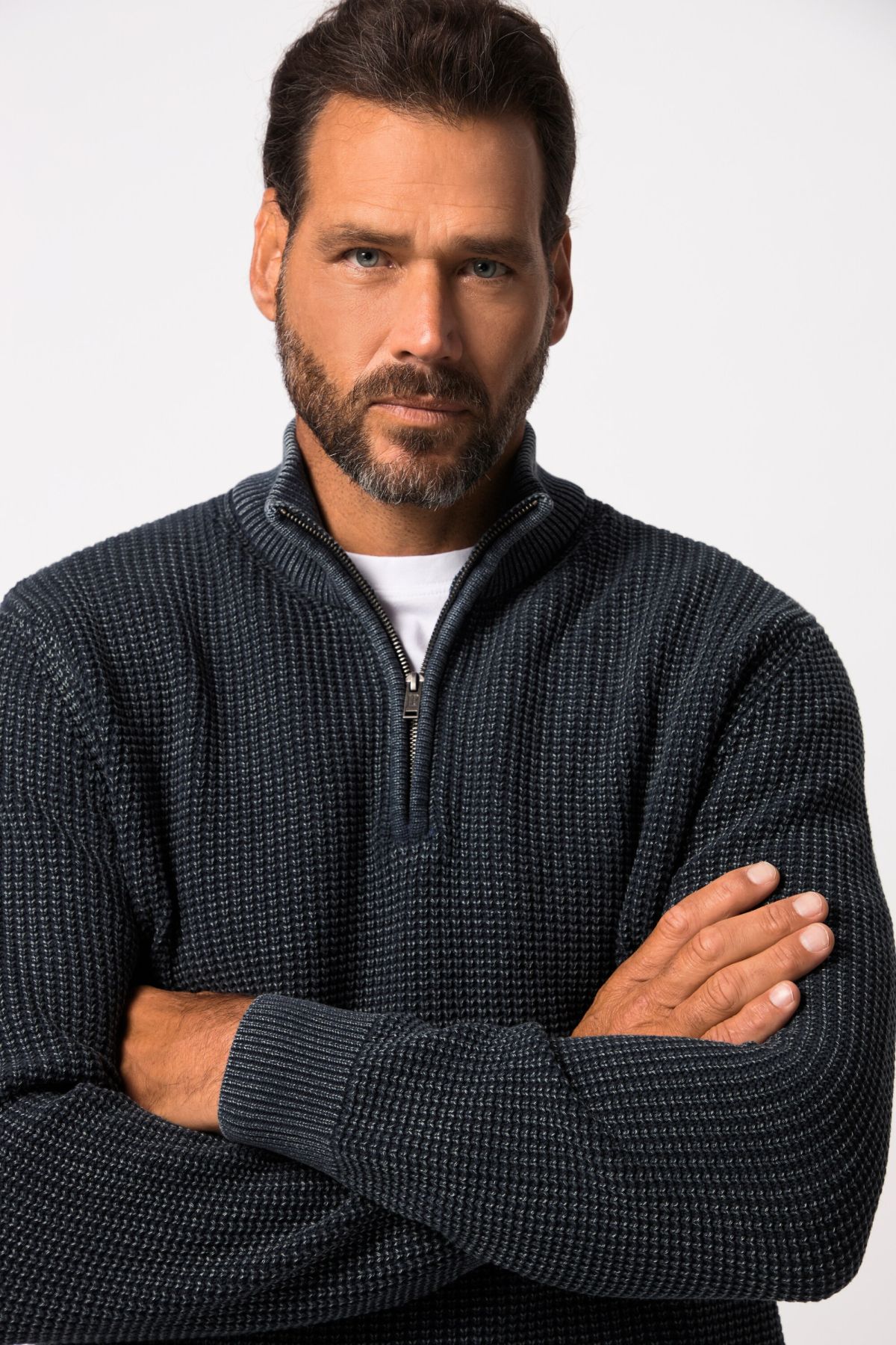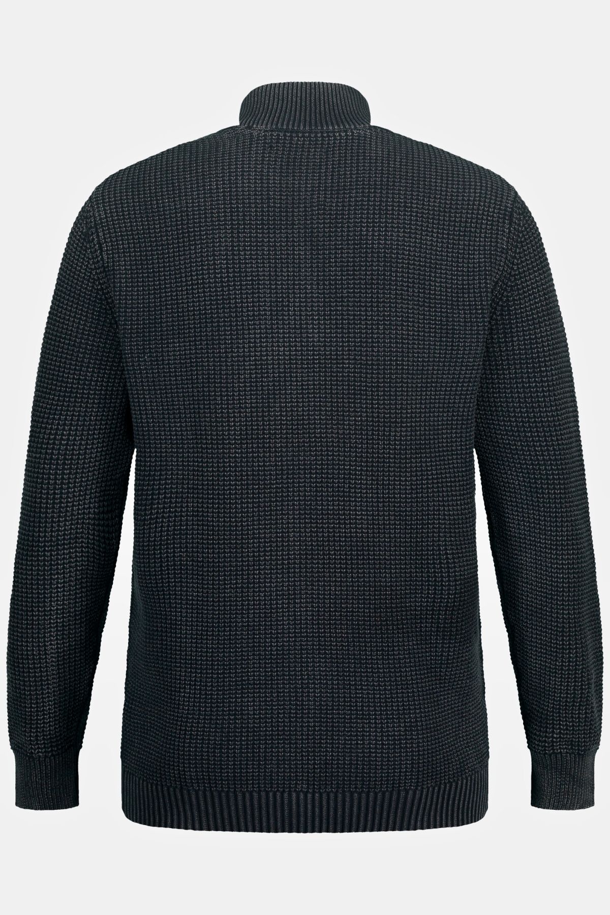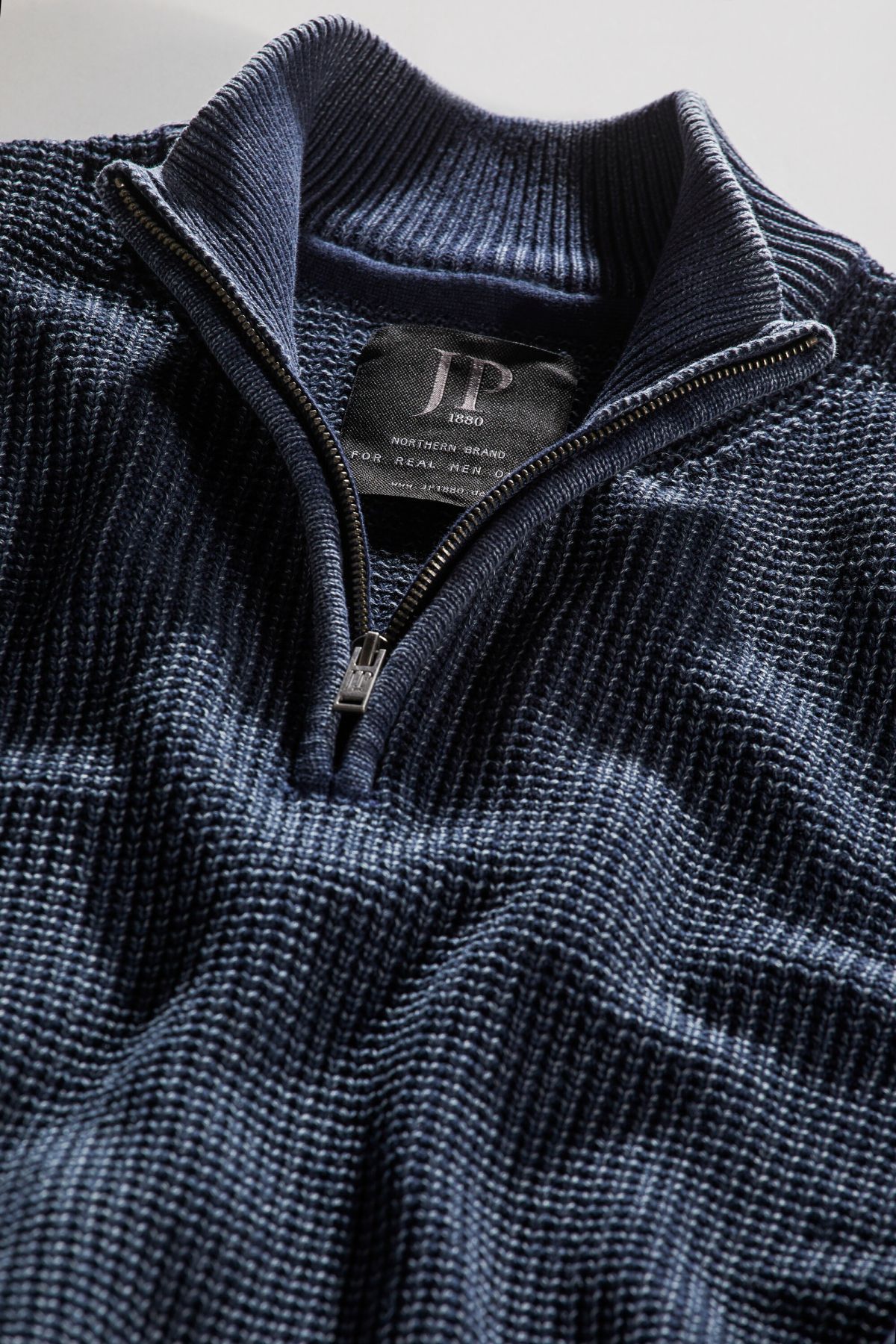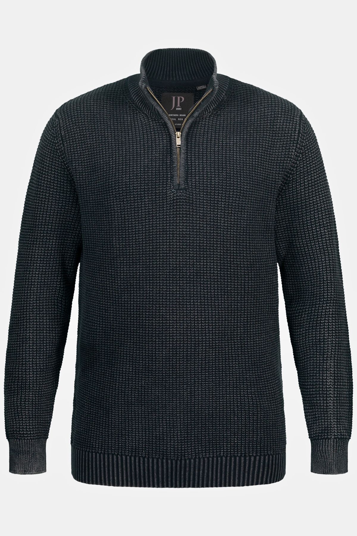 Пуловер с модерна винтидж визия. С изправена яка с контрастен цип. С дълги ръкави и рипсени маншети.