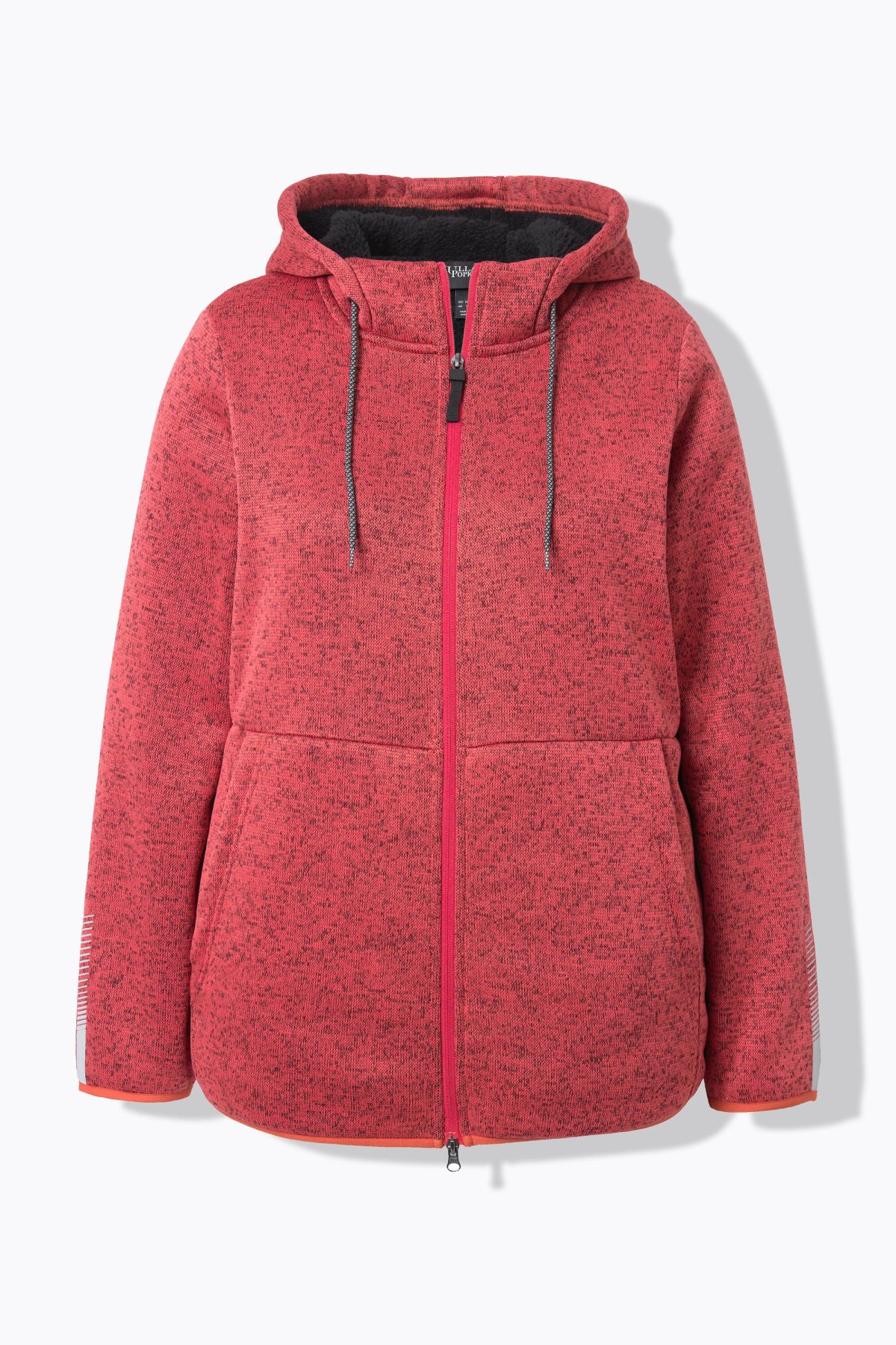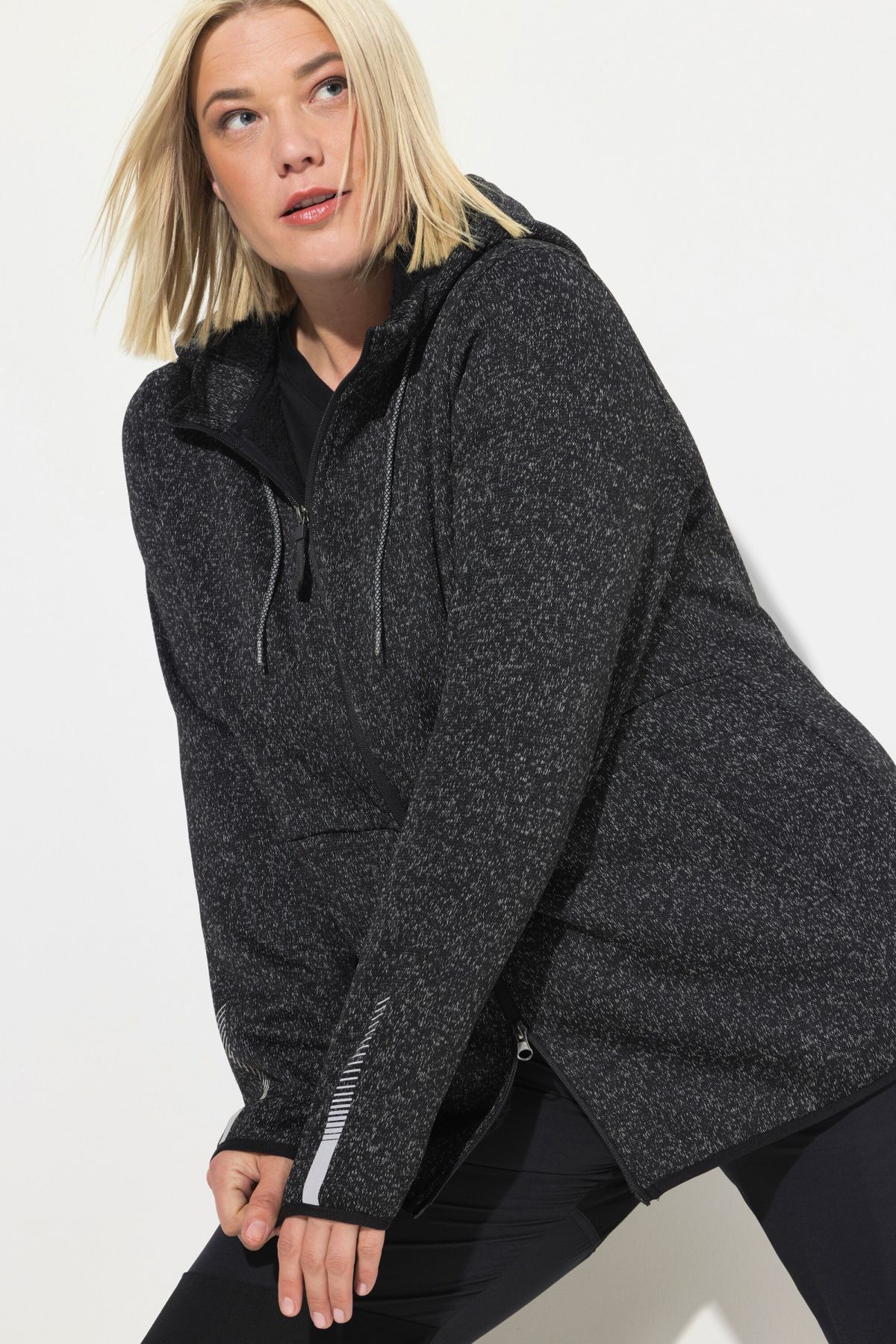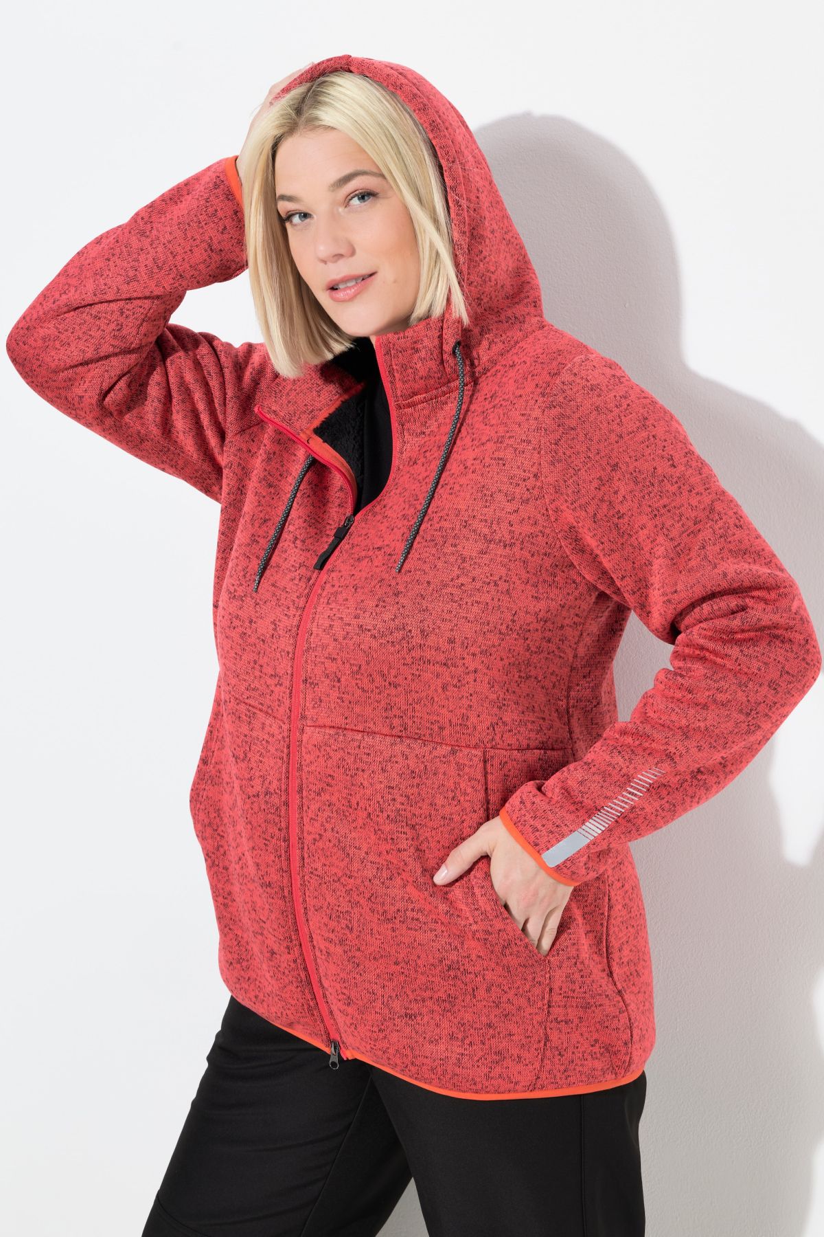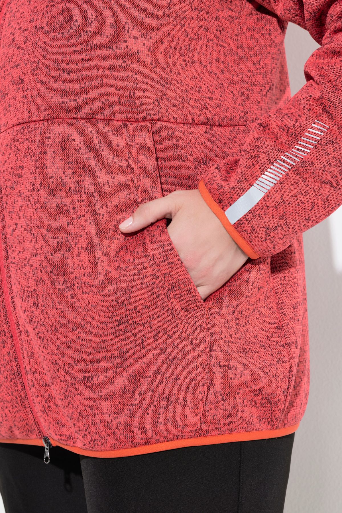 Суитчър с плетена визия. С качулка с връзка за регулиране, предпазител за брадичка, двупосочен цип, странични джобове, дълги ръкави с маншети и светлоотразителни и еластичен подгъв. Плетен отвън и поларен отвътре.