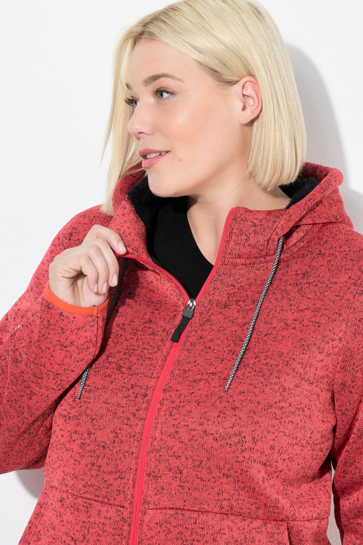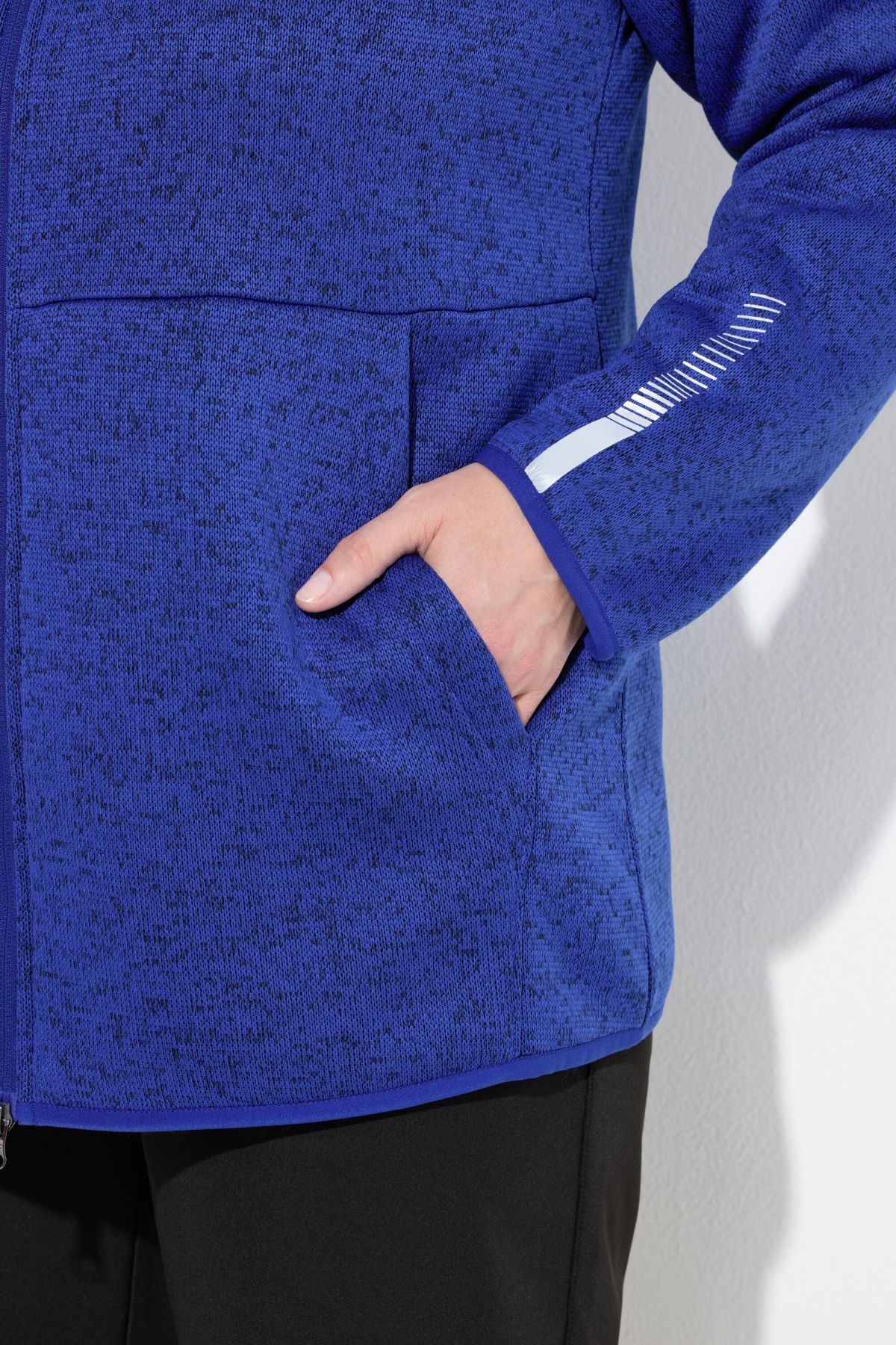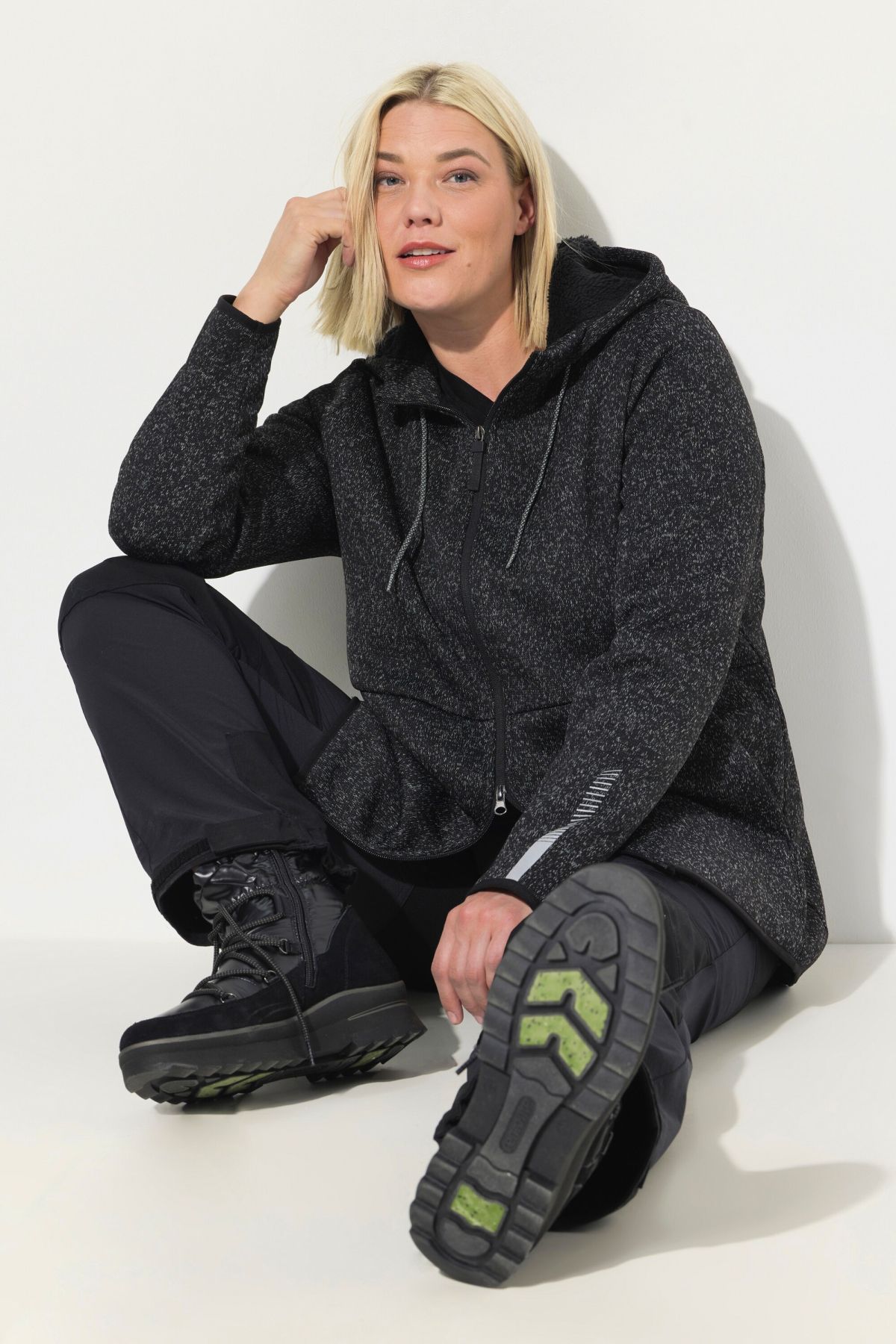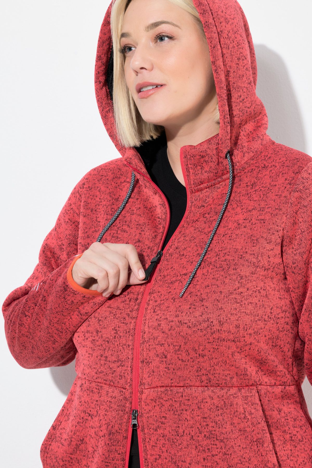 Суитчър с плетена визия. С качулка с връзка за регулиране, предпазител за брадичка, двупосочен цип, странични джобове, дълги ръкави с маншети и светлоотразителни и еластичен подгъв. Плетен отвън и поларен отвътре.