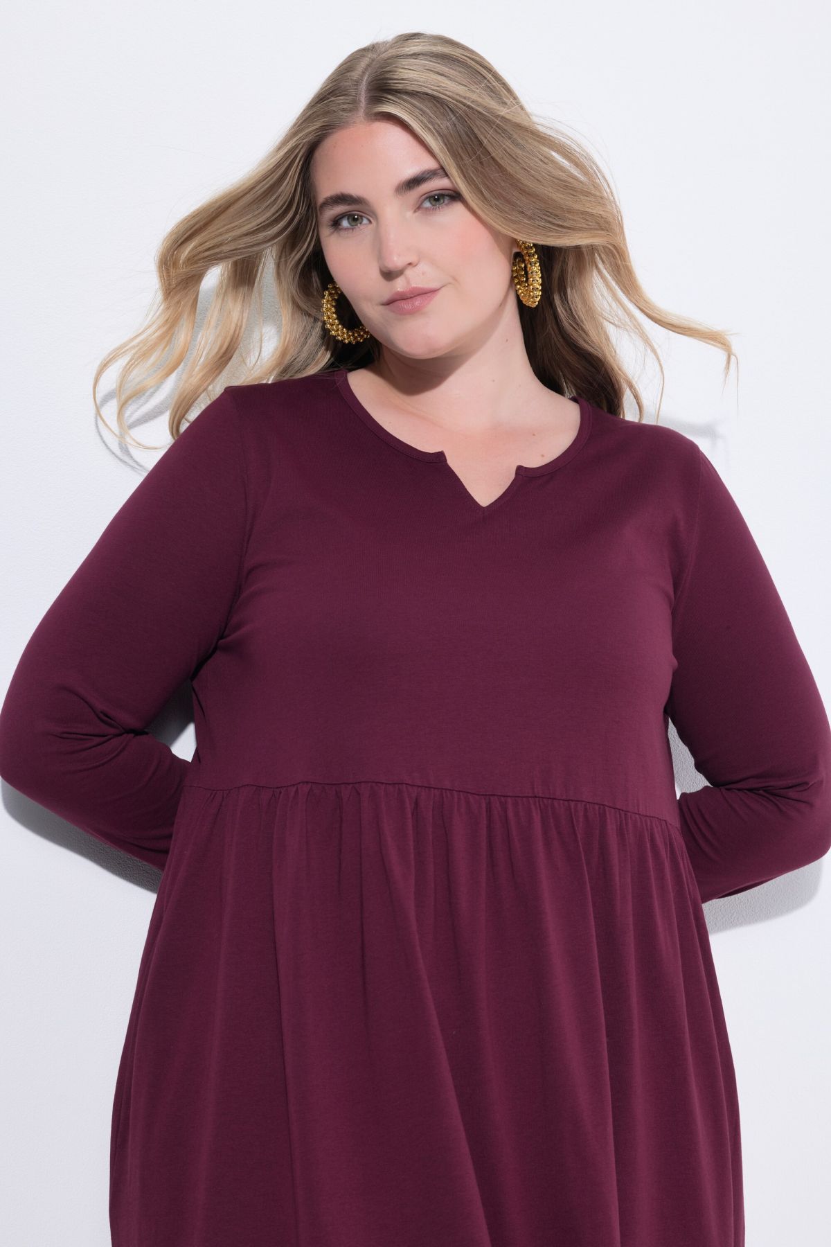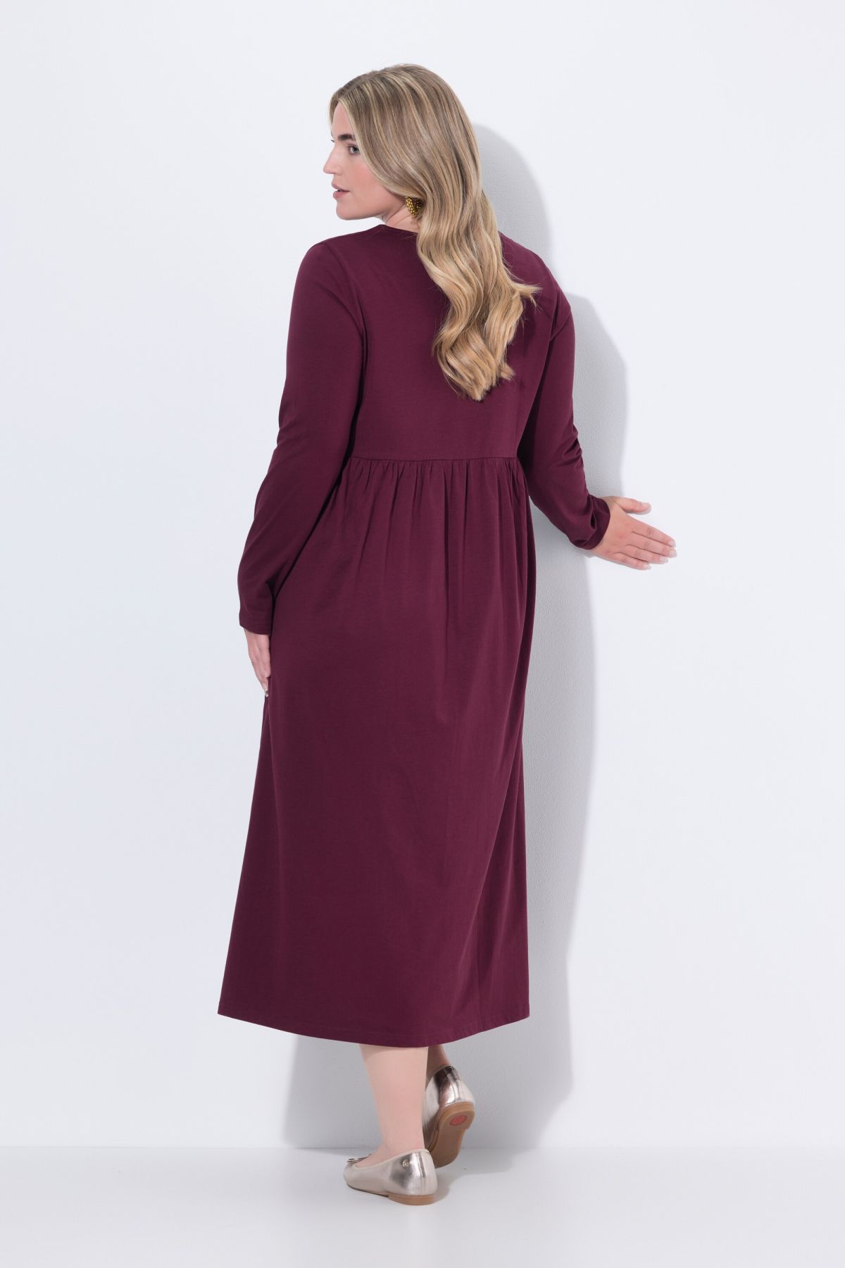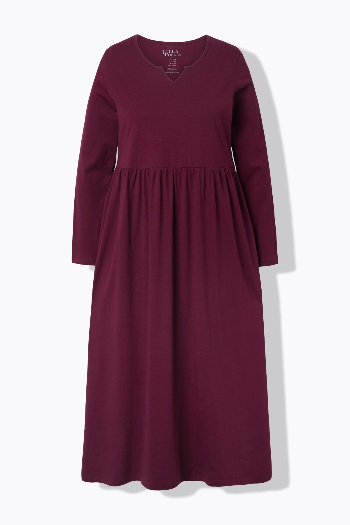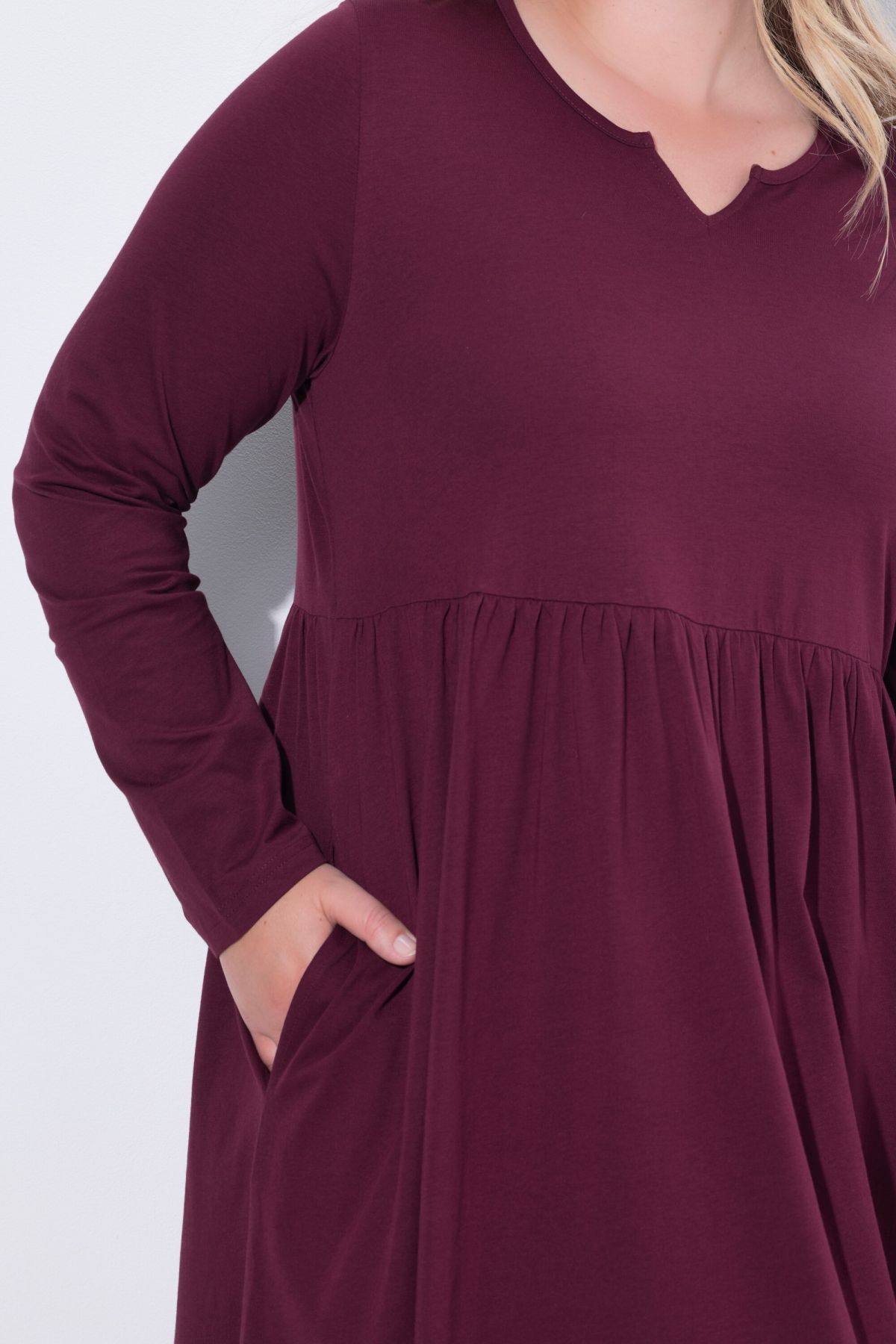 Рокля от висококачествена памучна материя с комфортна кройка. С кръгло деколте с цепка и дълги ръкави.