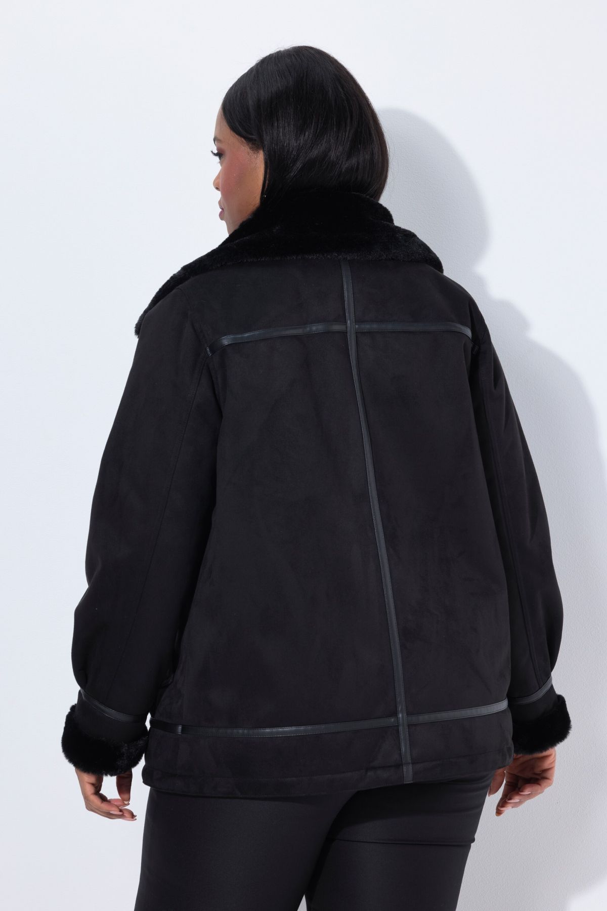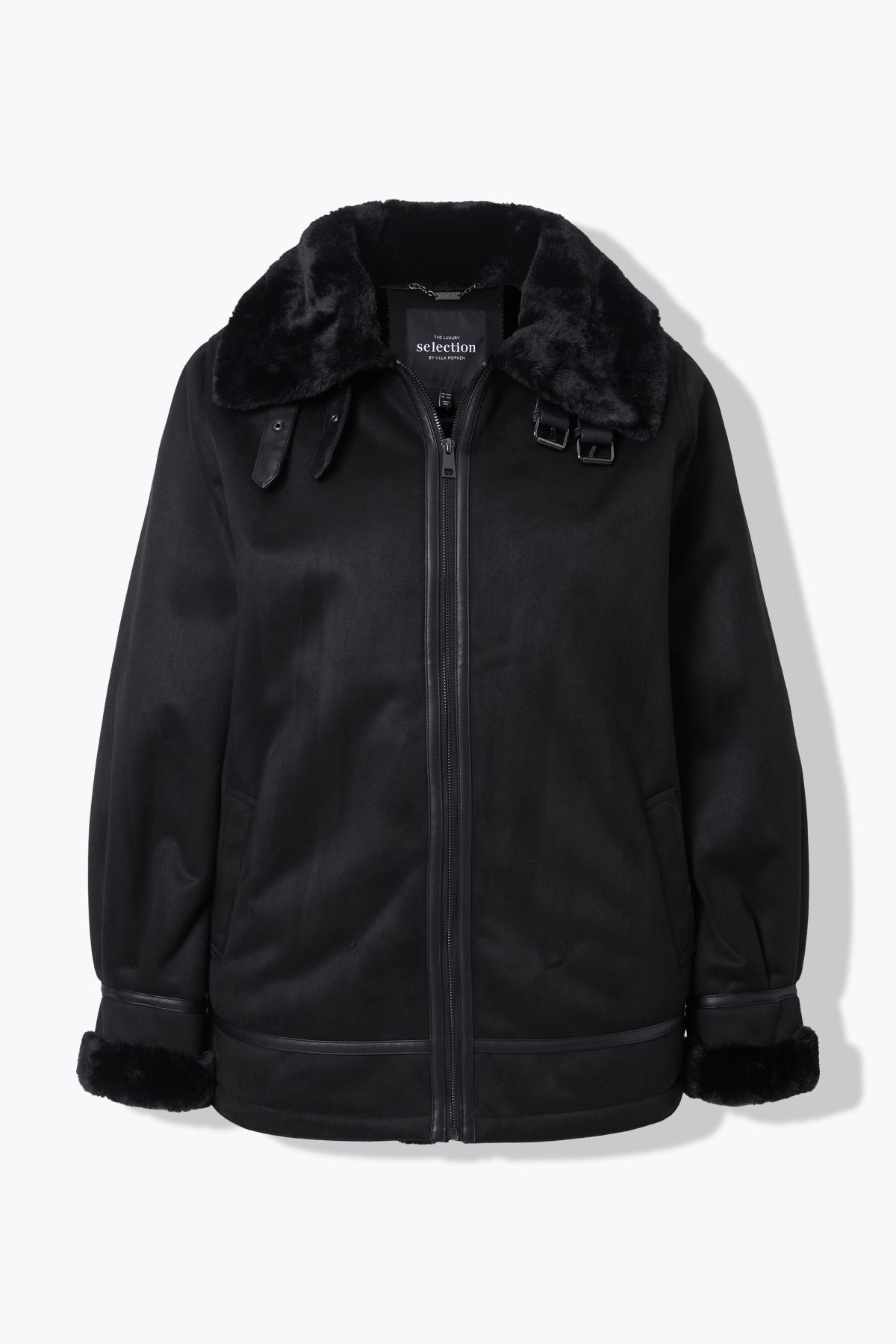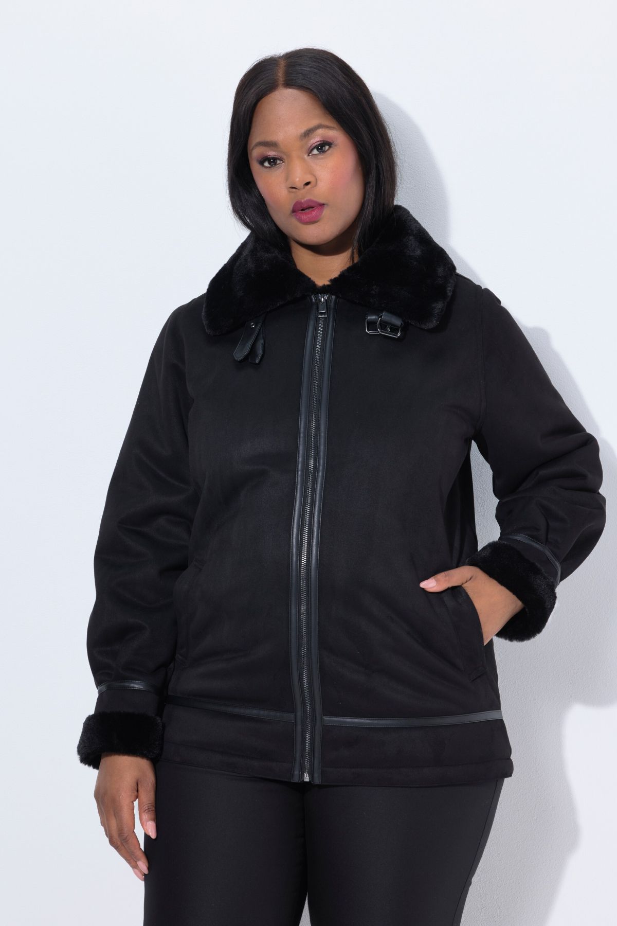 Яке тип палто от изкуствена агнешка кожа. Меко и плюшено отвътре с луксозно и елегантно усещане. С цип отпред, висока яка, дълги ръкави с обърнат маншет и странични джобове.
