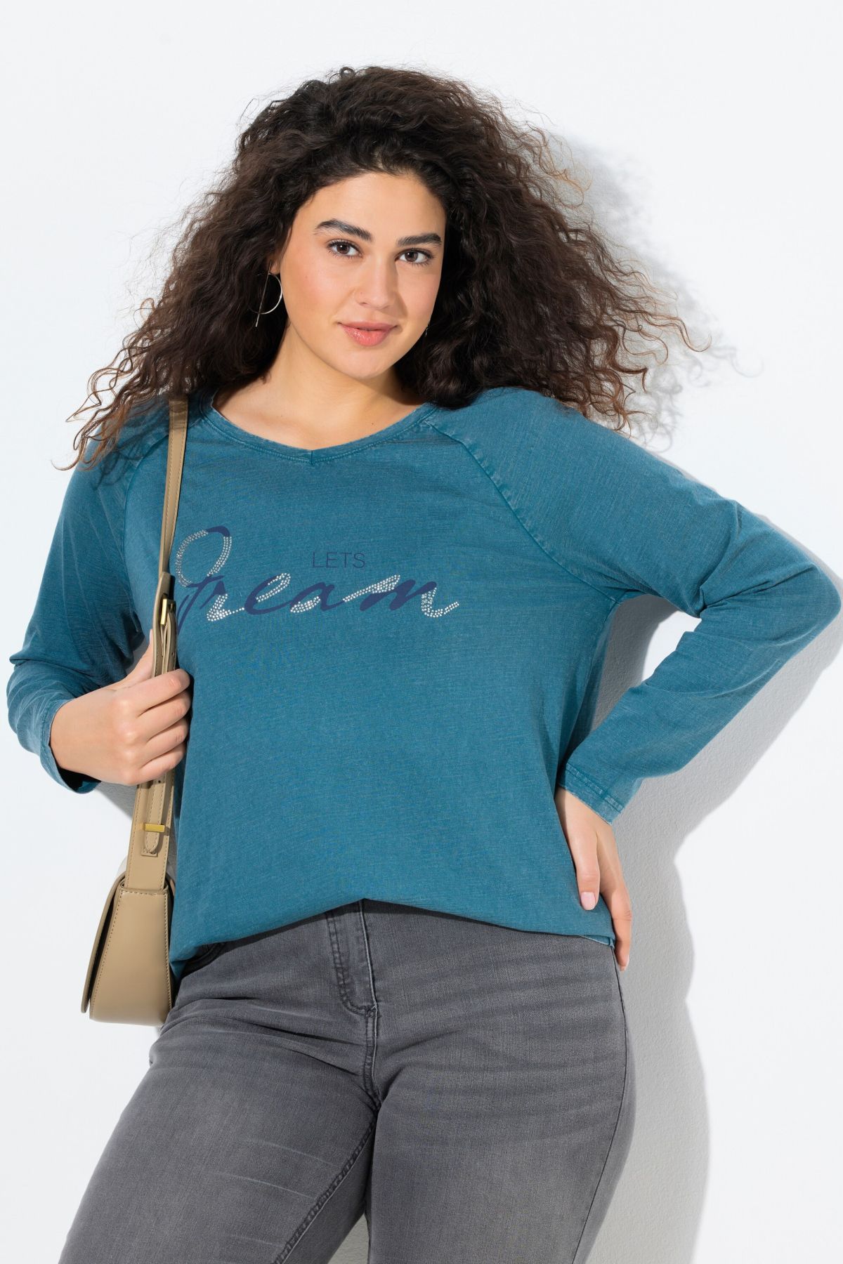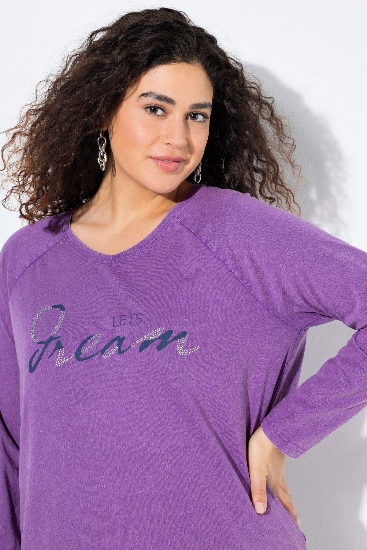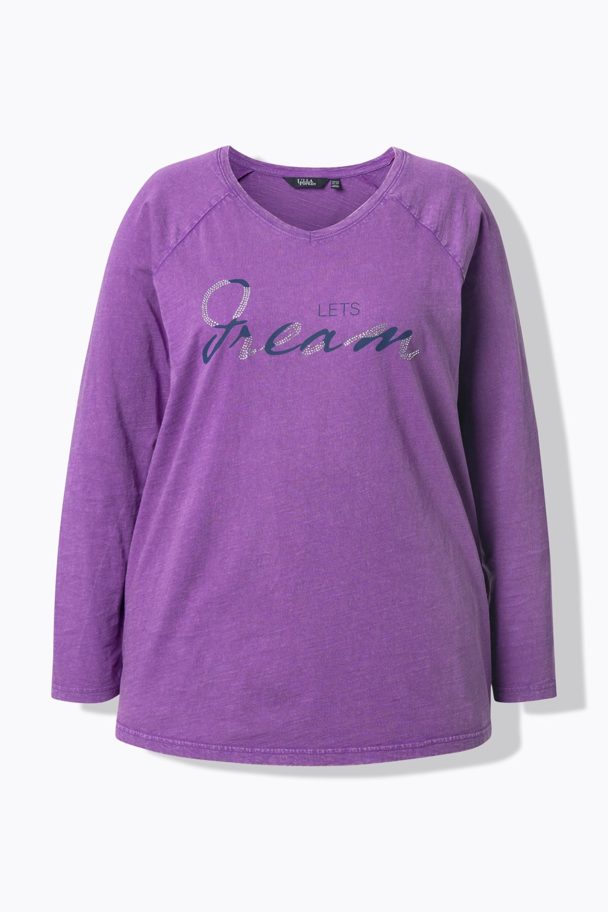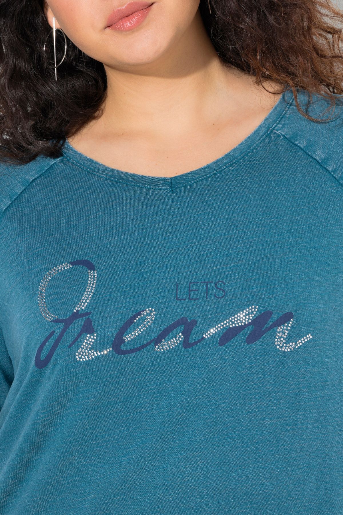Тениска с надпис с декоративни камъчета. С кръгло деколте и дълги ръкави. От мека, памучна материя.