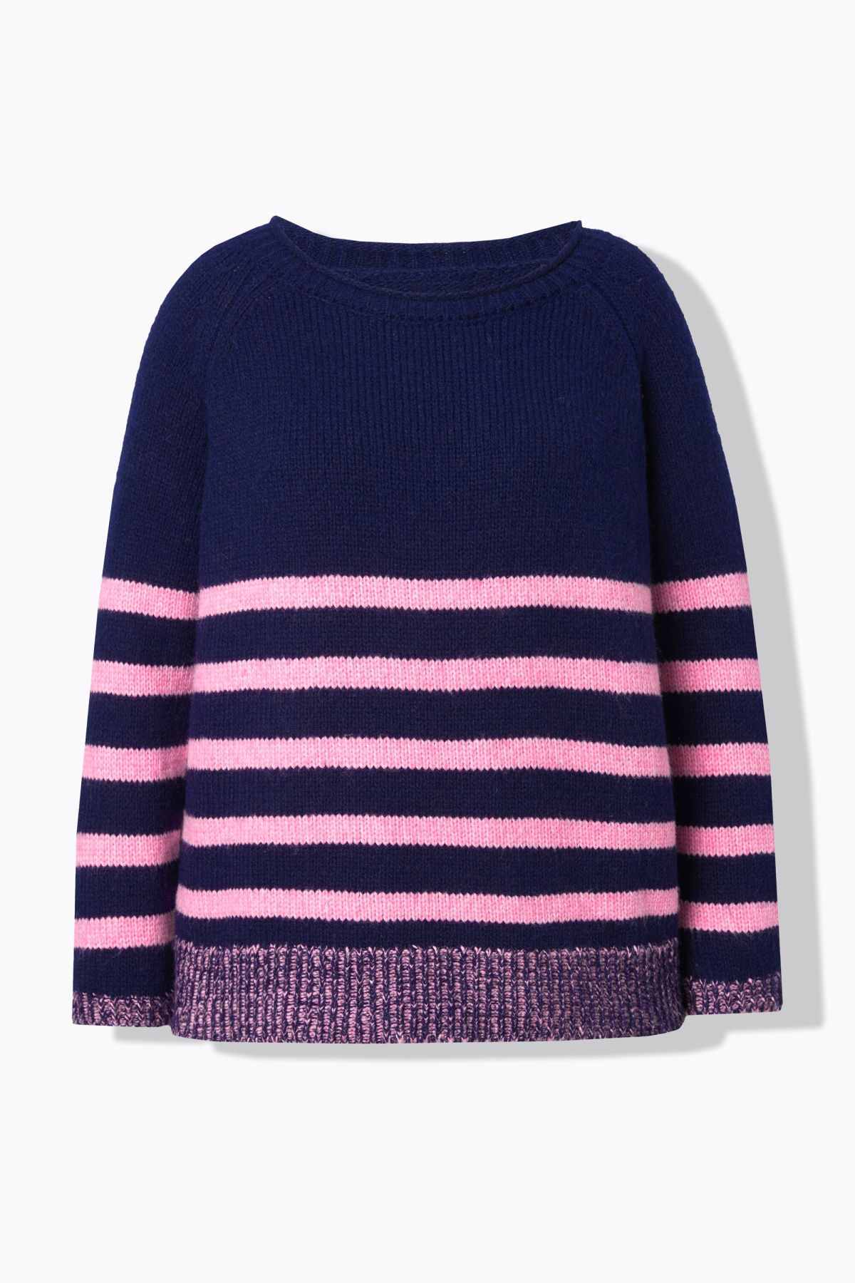Пуловер от мека фина плетка с раирани акценти в контрастен розов цвят. С кръгло деколте и дълги ръкави. Перфектен за комбиниране с дънки или панталон