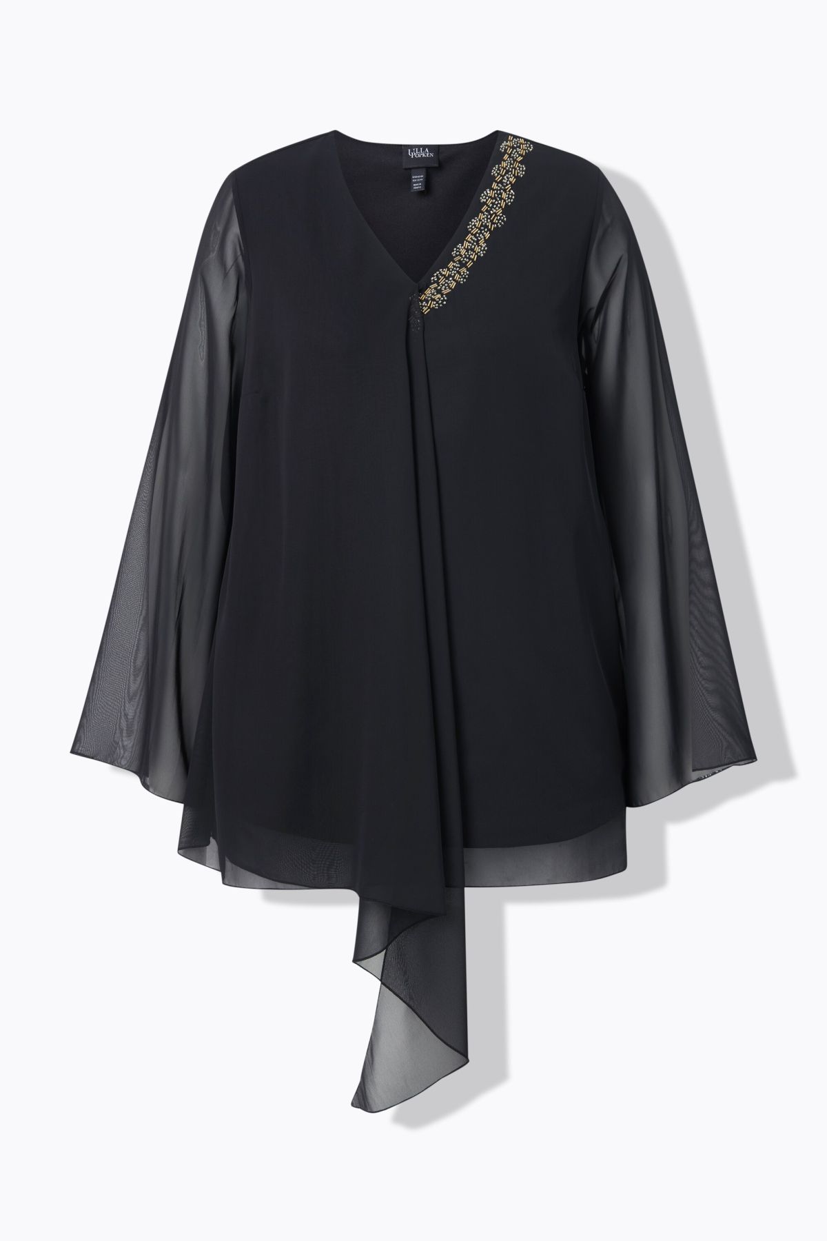 Блуза с шифон с асиметричен подгъв. С елегантна кройка. С V - образно деколте и дълги ръкави с разкроени маншети. Стил във всяка ситуация.