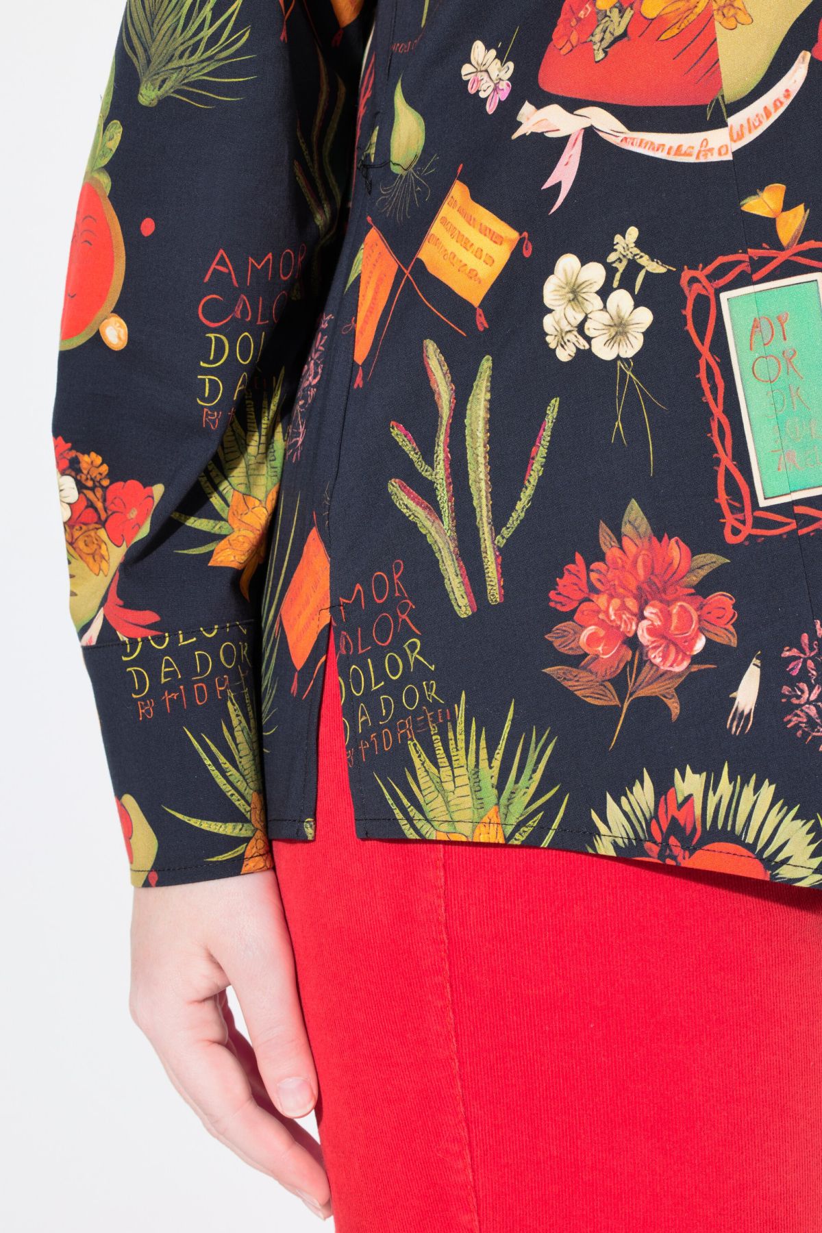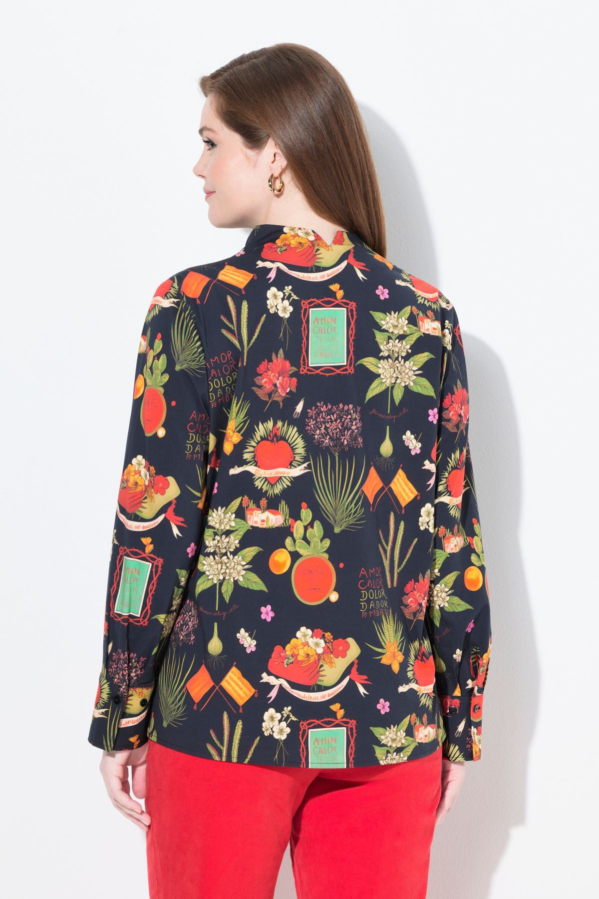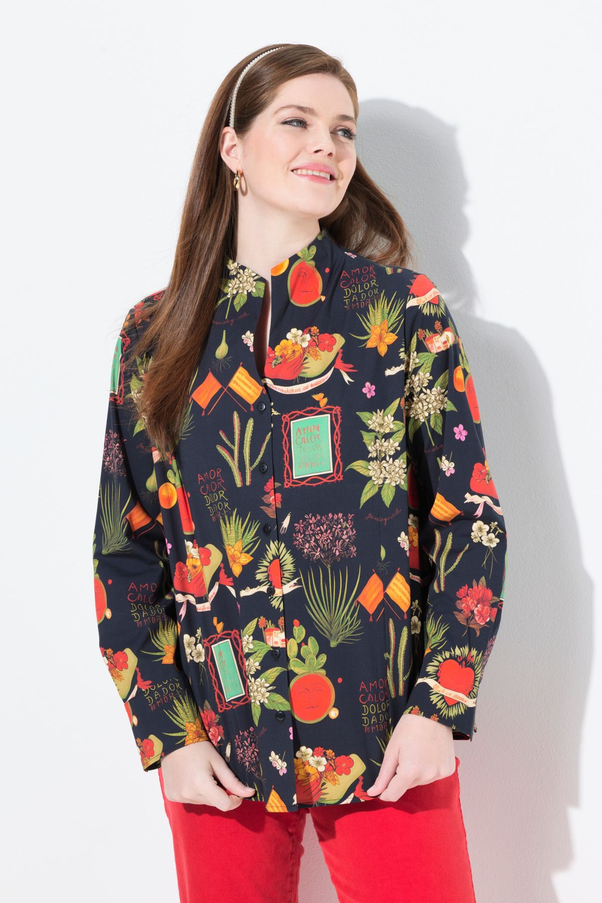 Риза с градски принт с елегантна изправена яка. С копчета отпред и дълги ръкави. От мека, памучна материя.