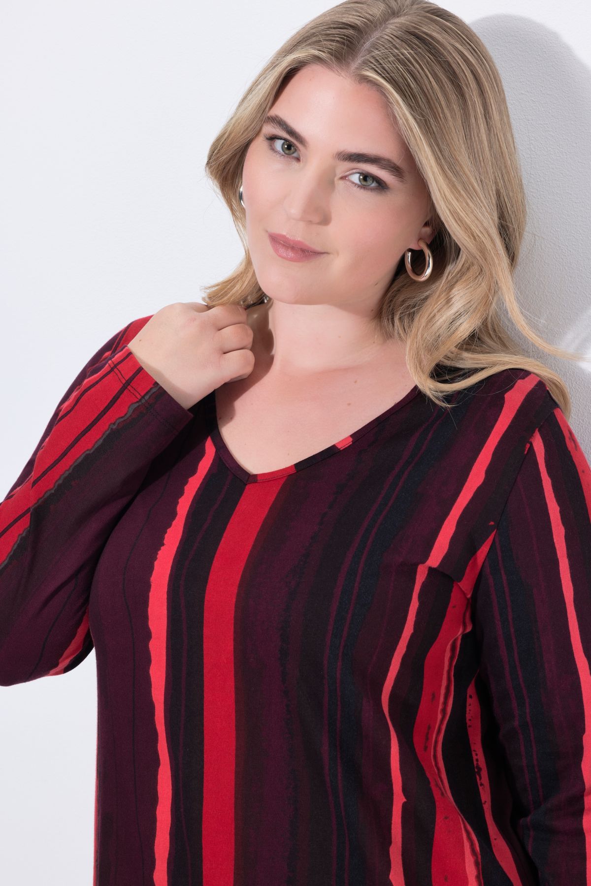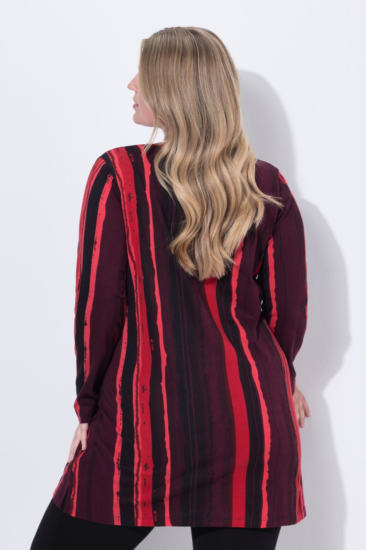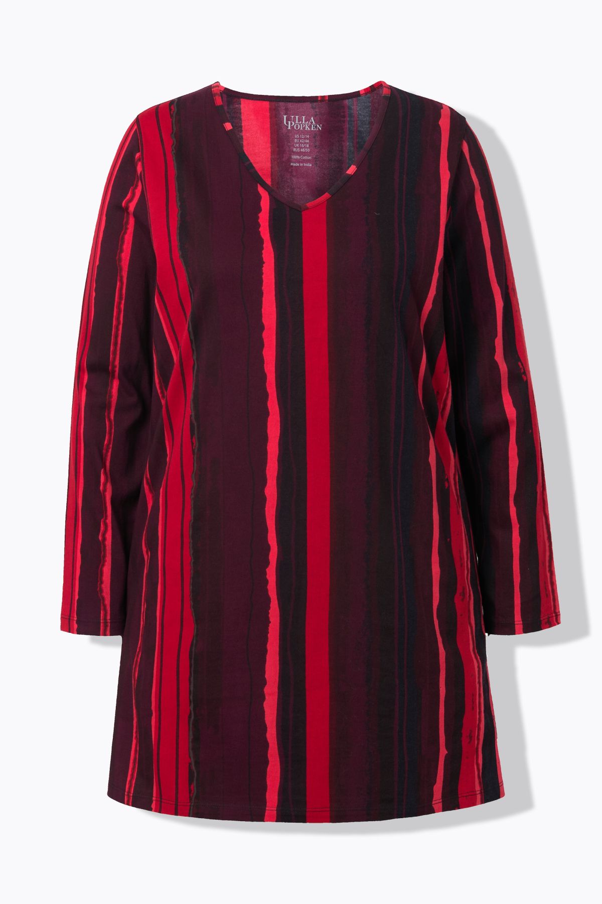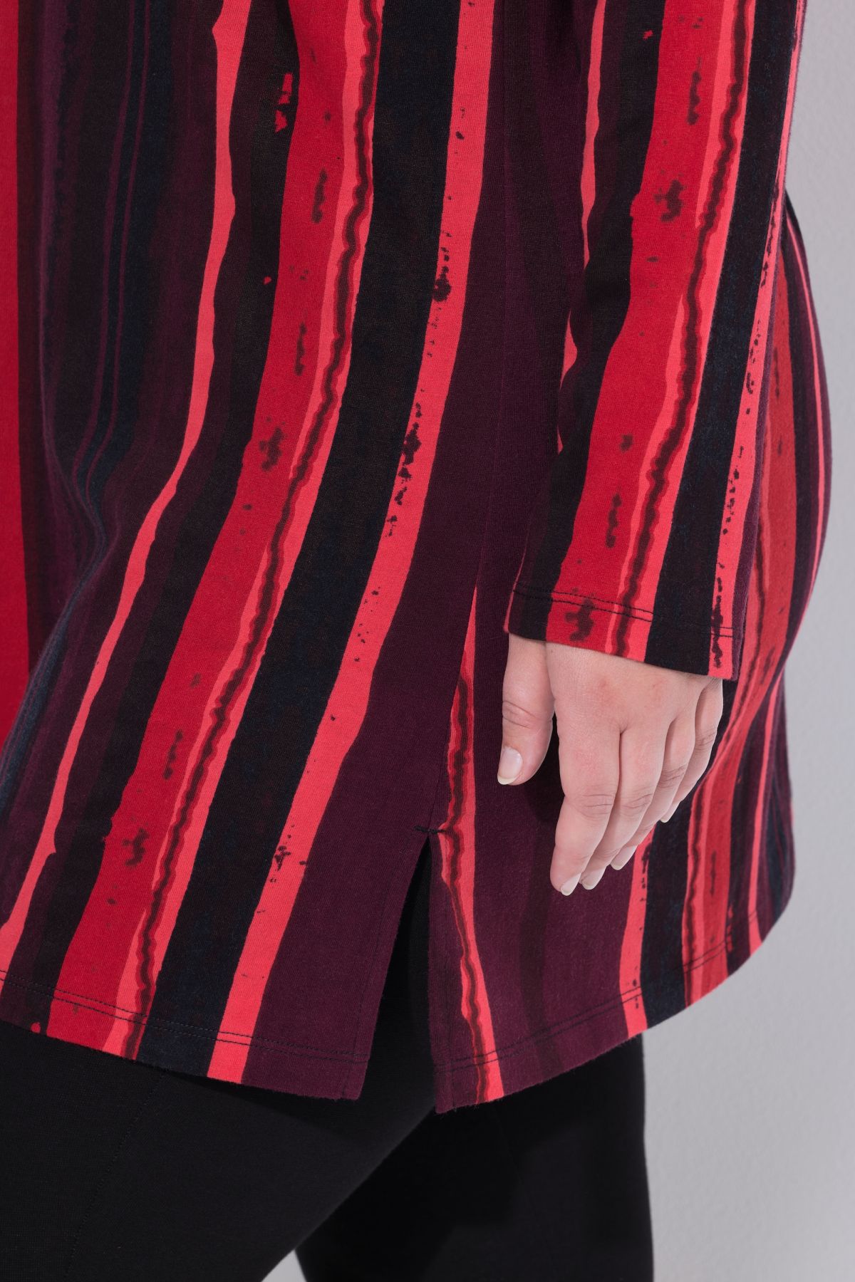 Туника с несиметрични райета. С А - линия на силуета, от мека памучна материя. С V - образно деколте и дълги ръкави.
